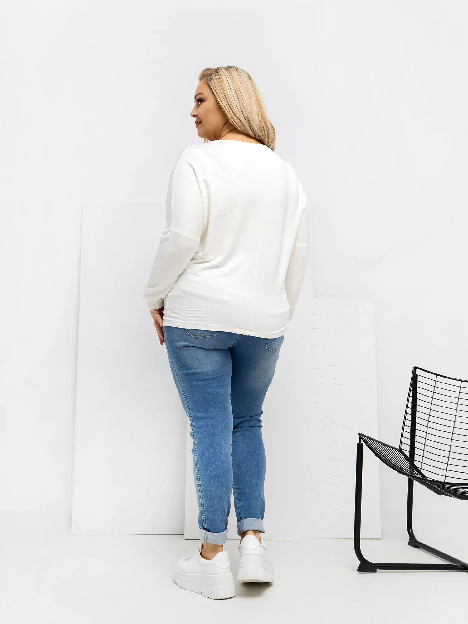 Modelis dėvi vieno dydžio drabužius. Modelio išmatavimai: ūgis 167 cm, krūtinės apimtis 118 cm, juosmuo 90 cm, klubai 118 cm .