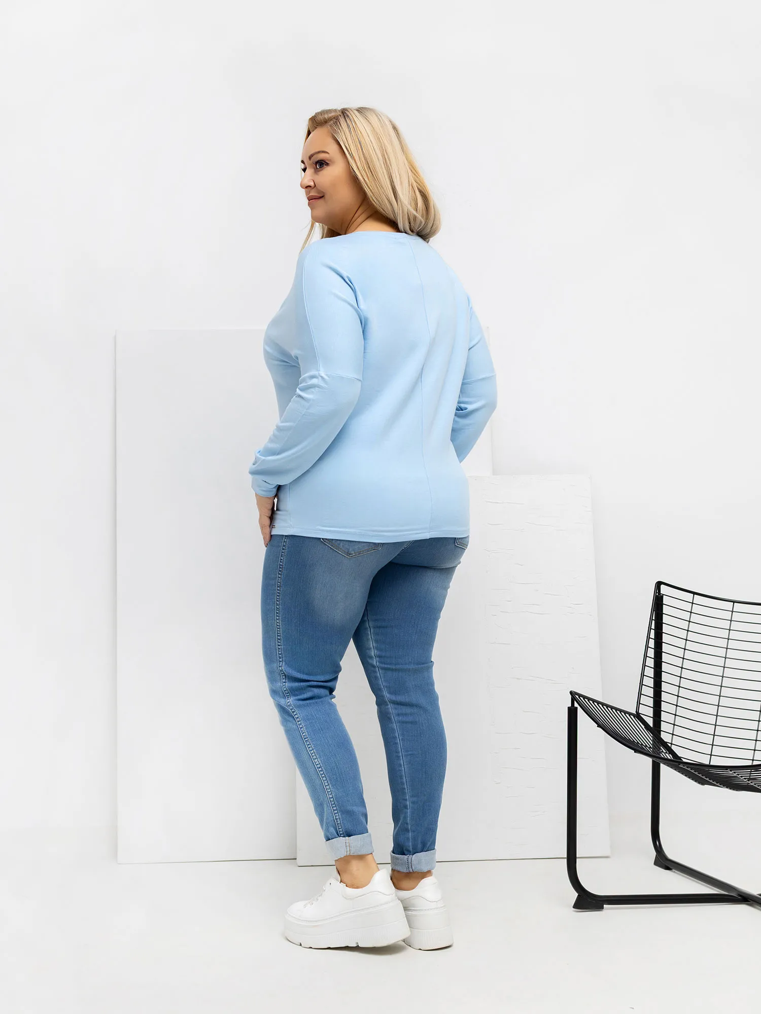 Modelis dėvi vieno dydžio drabužius. Modelio išmatavimai: ūgis 167 cm, krūtinės apimtis 118 cm, juosmuo 90 cm, klubai 118 cm .