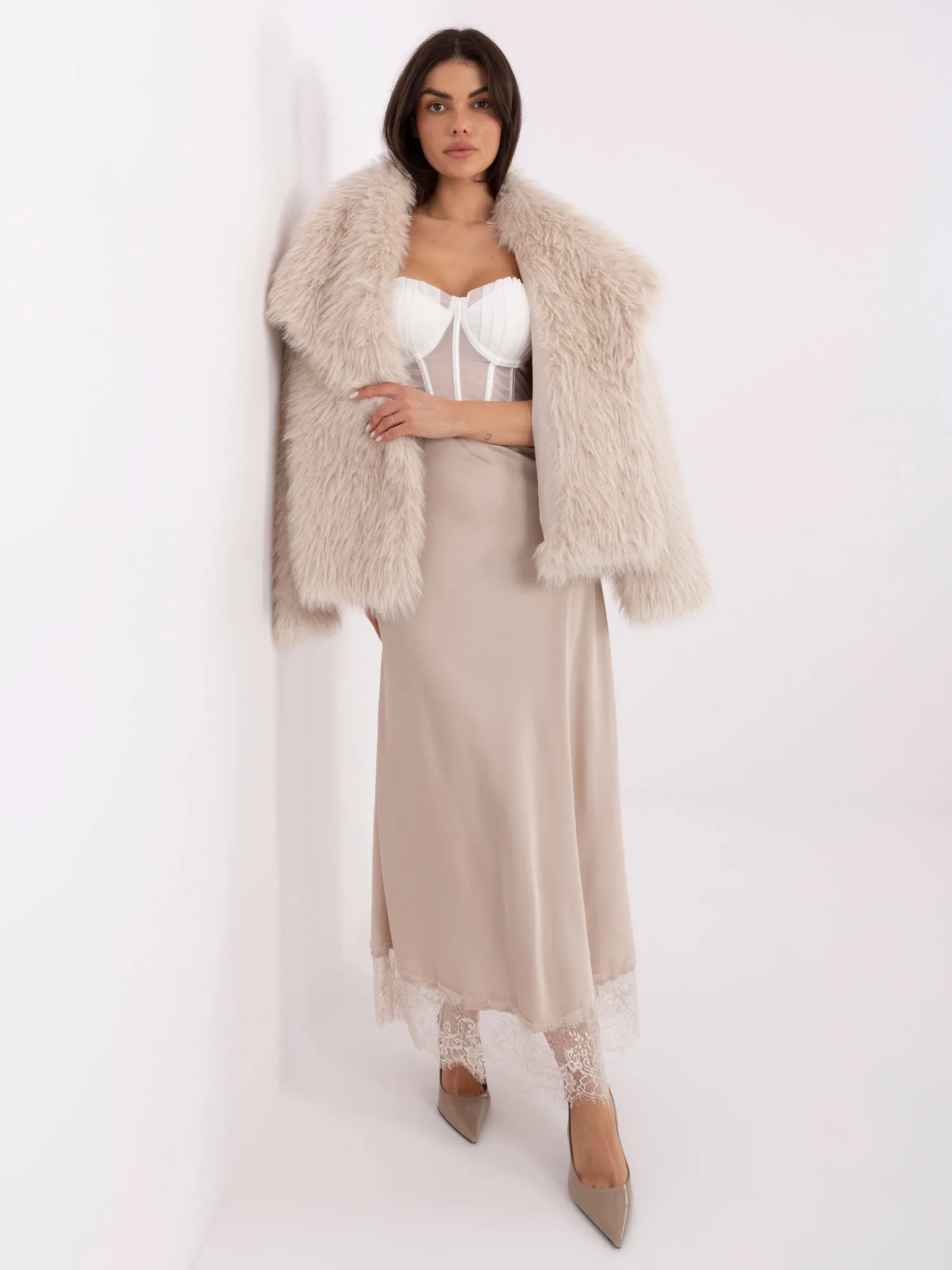 Modelka ma na sobie rozmiar S/M. Wymiary modelki: wzrost 173 cm, biust 85 cm, talia 62 cm, biodra 95 cm.