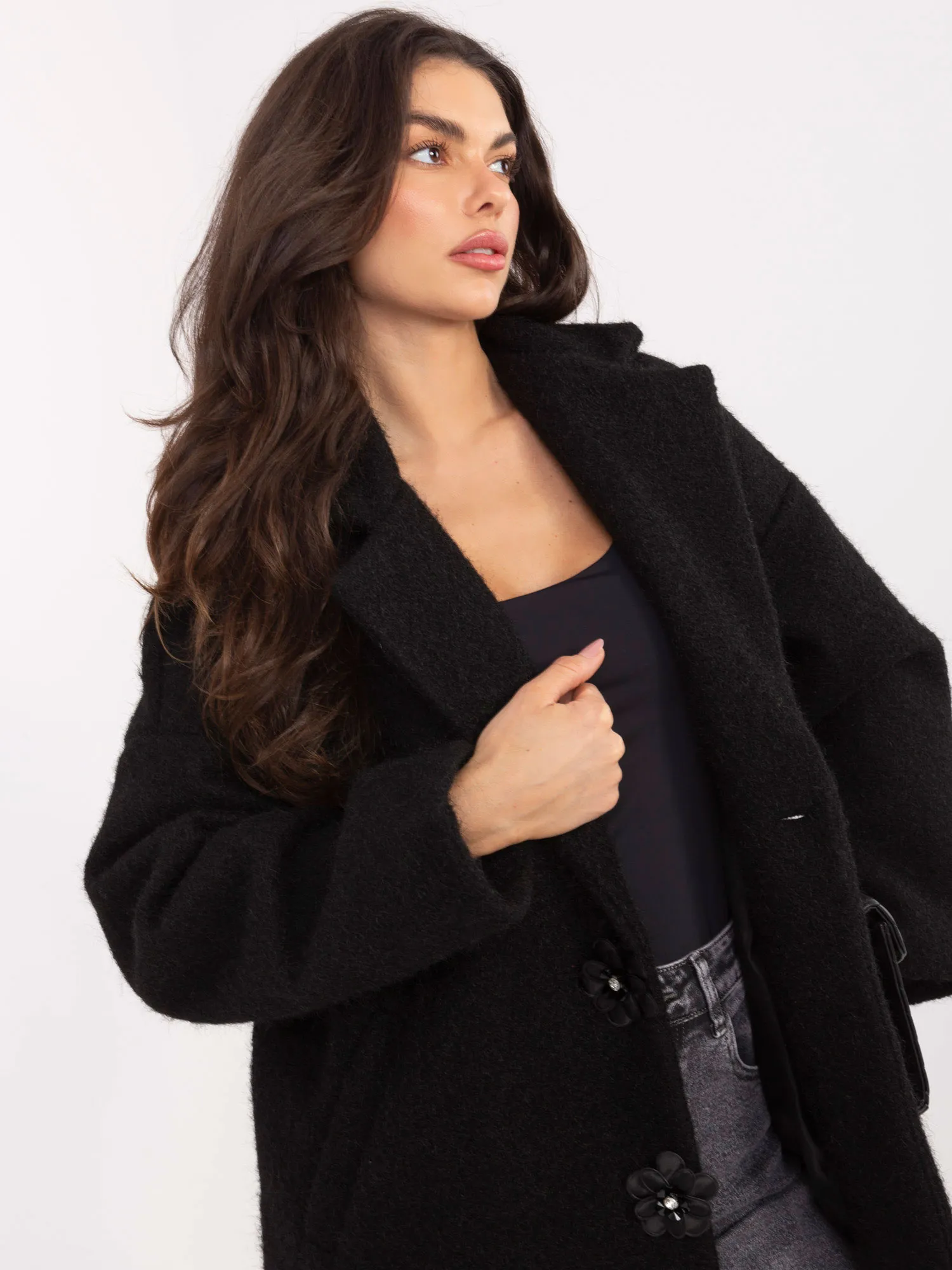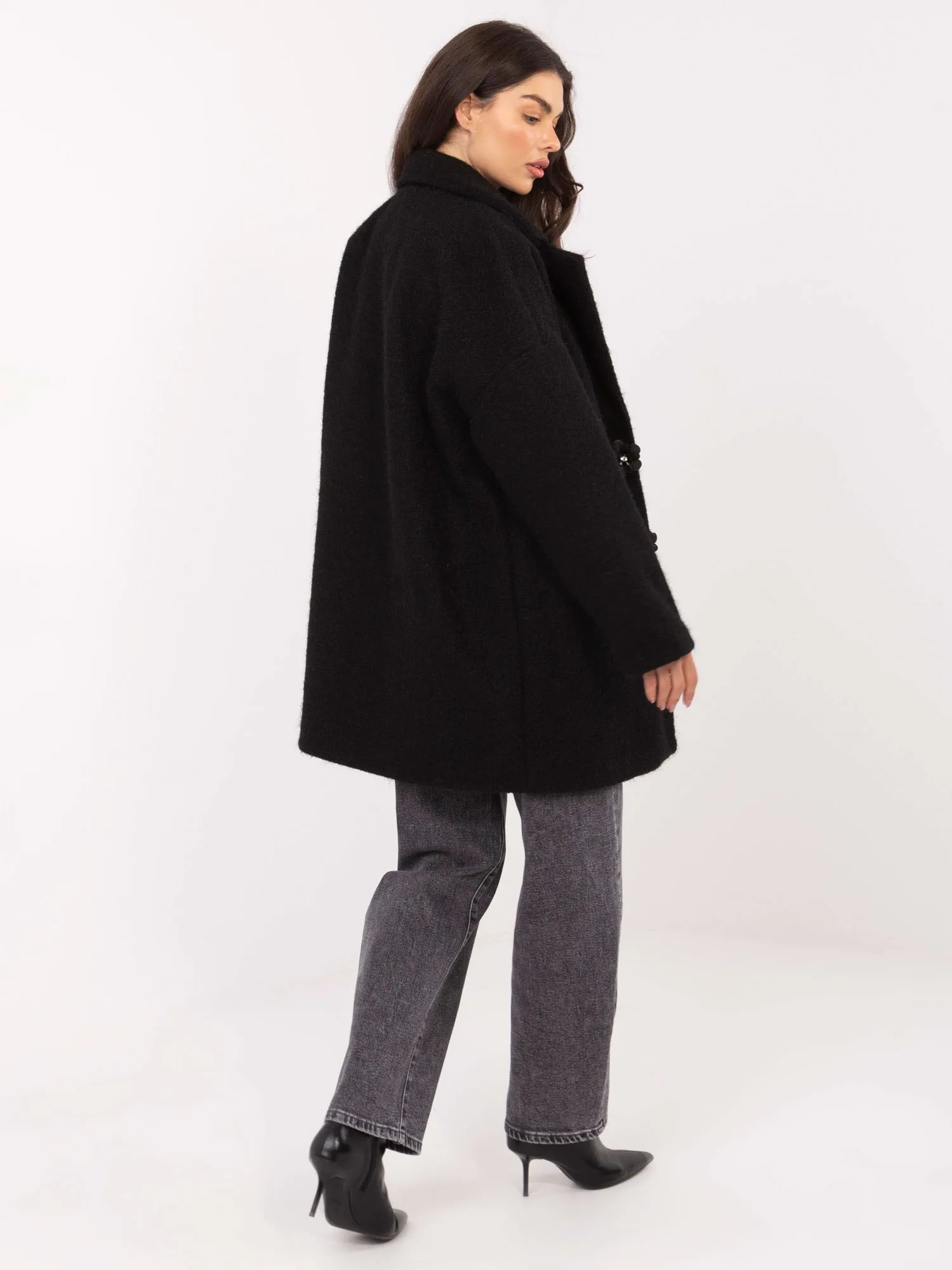 Palto matmenys vieno dydžio, matuojant plokščiai: plotis po pažastimis - 63 cm, rankovių ilgis - 47 cm (nuo siūlės), juosmens plotis - 62 cm, klubų plotis - 64 cm, bendras ilgis - 86 cm.