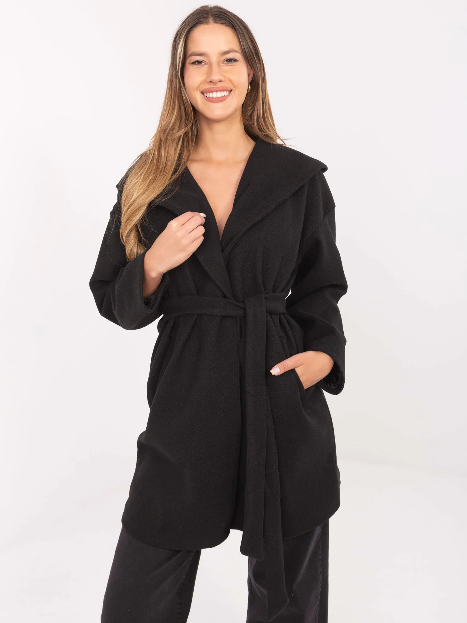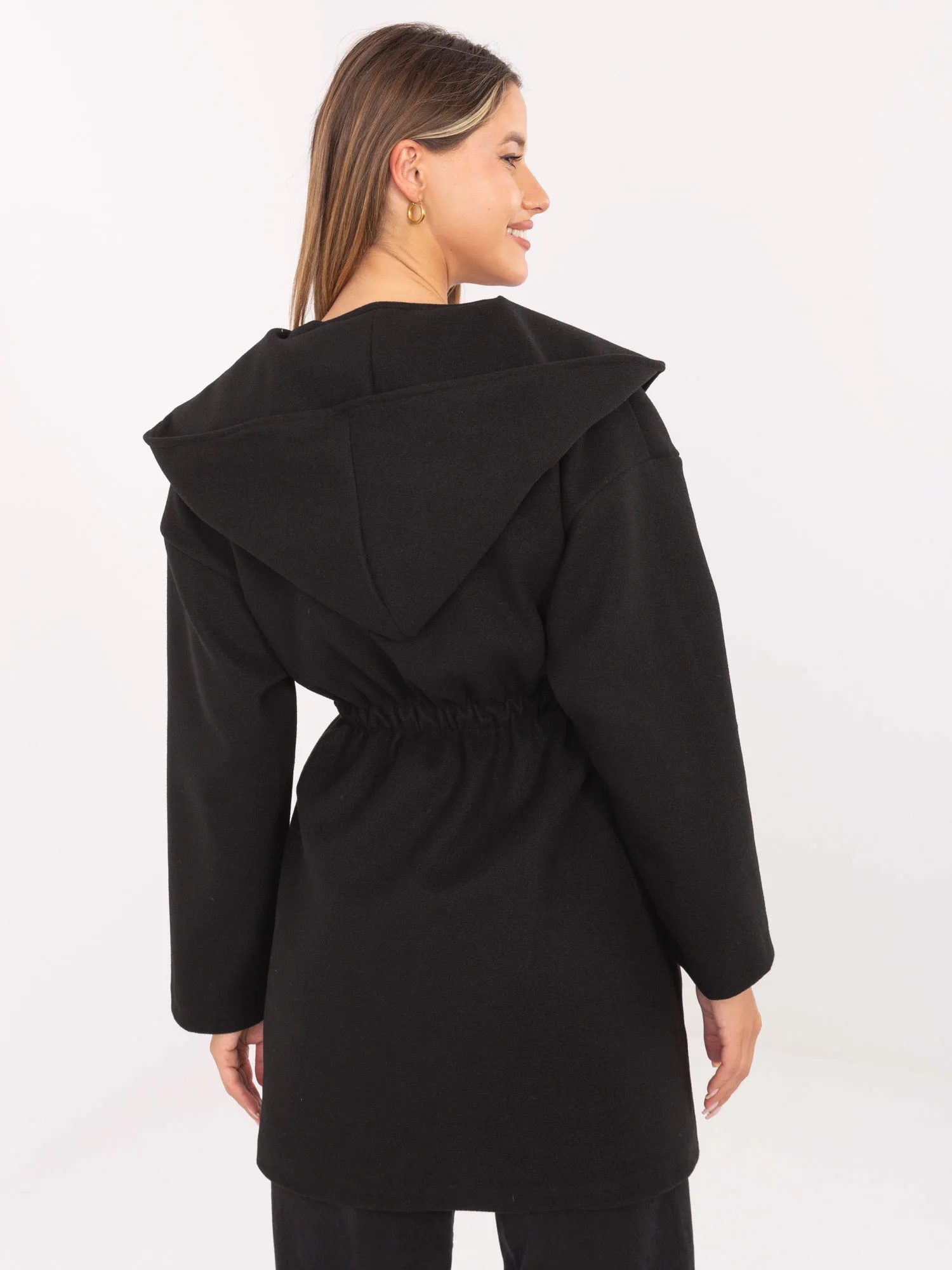 Palto matmenys vieno dydžio, išmatuoti plokščiai: plotis po pažastimis - 55 cm, rankovių ilgis - 52 cm (nuo siūlės), klubų plotis - 58 cm, bendras ilgis - 92 cm.
