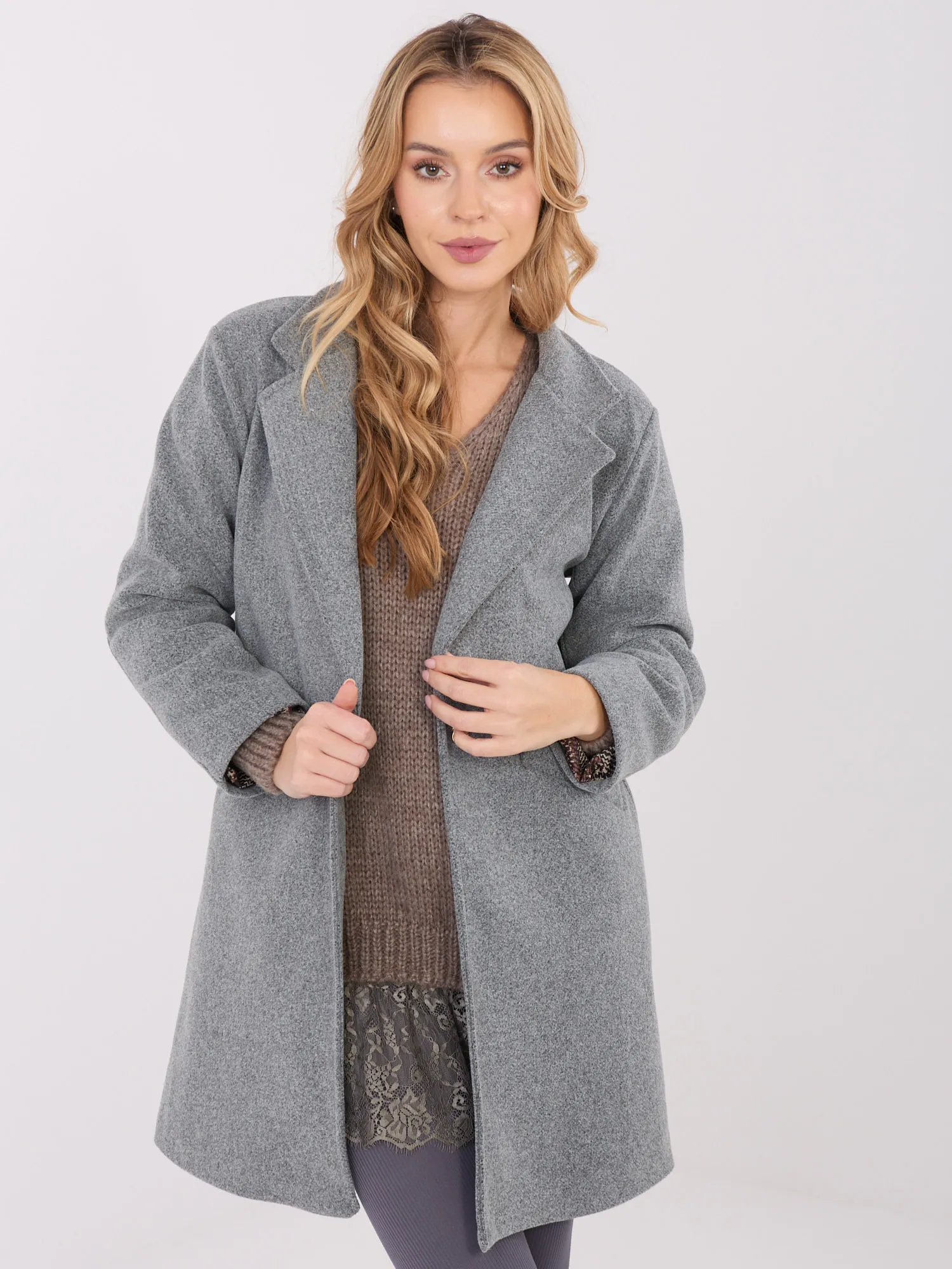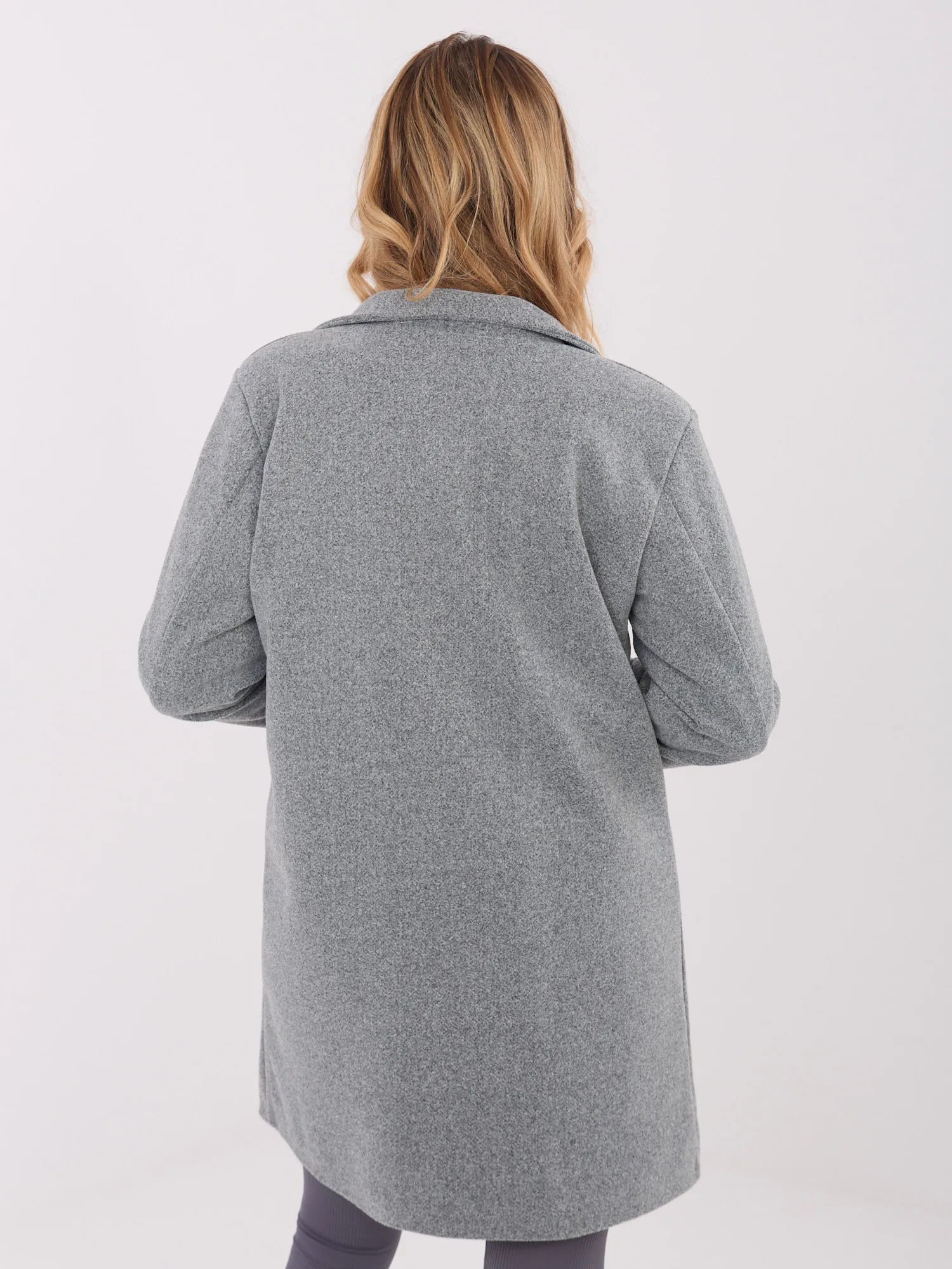 Wymiary płaszcza w rozmiarze one size mierzone na płasko: szerokość pod pachami - 54 cm, długość rękawa - 55 cm, szerokość w biodrach - 57 cm, długość całkowita - 84 cm.