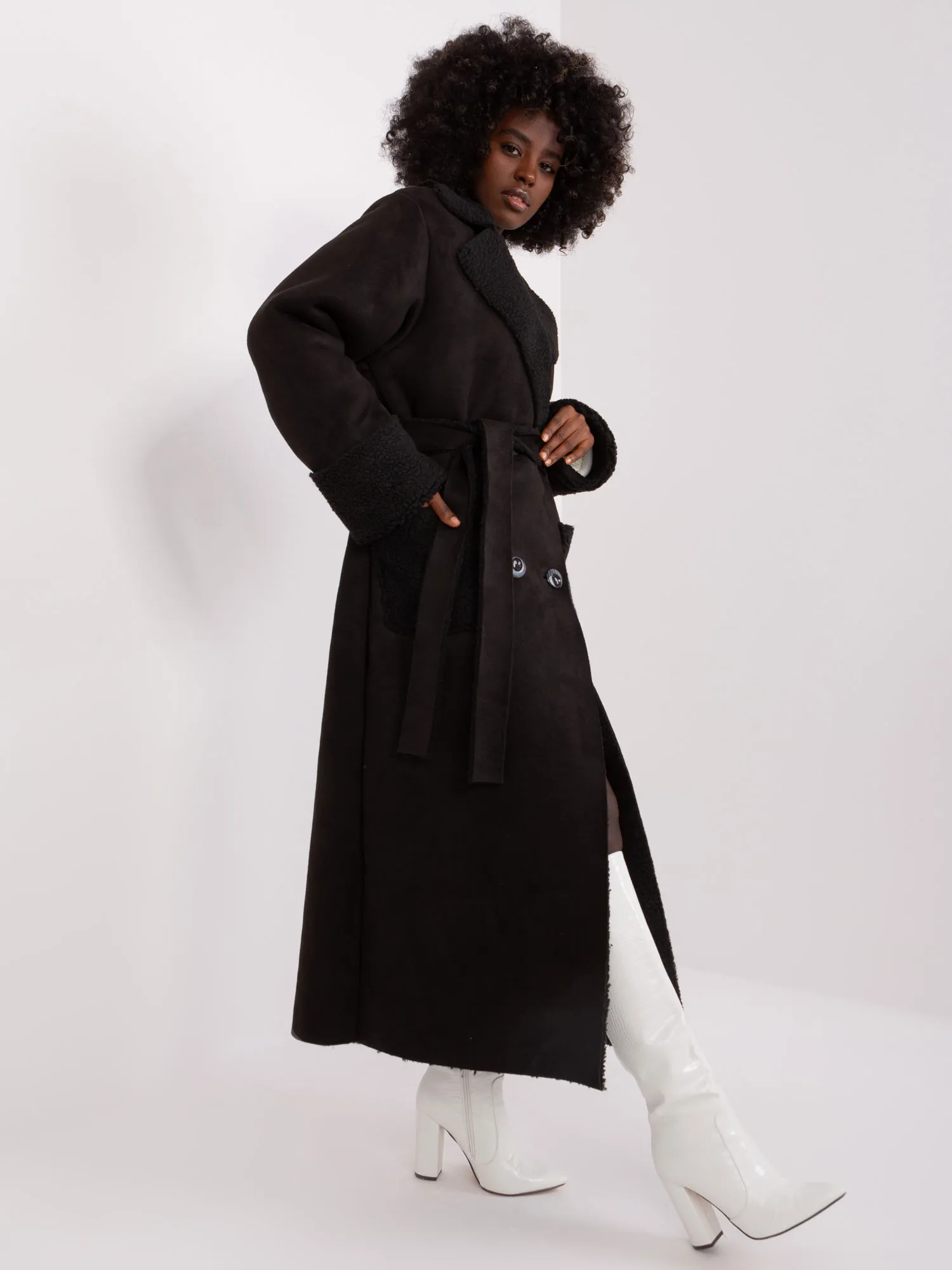 Palto matmenys S/M dydžiu matuojant plokščią: plotis pažastyje - 62 cm, bendras ilgis - 131 cm, rankovių ilgis - 70 cm.