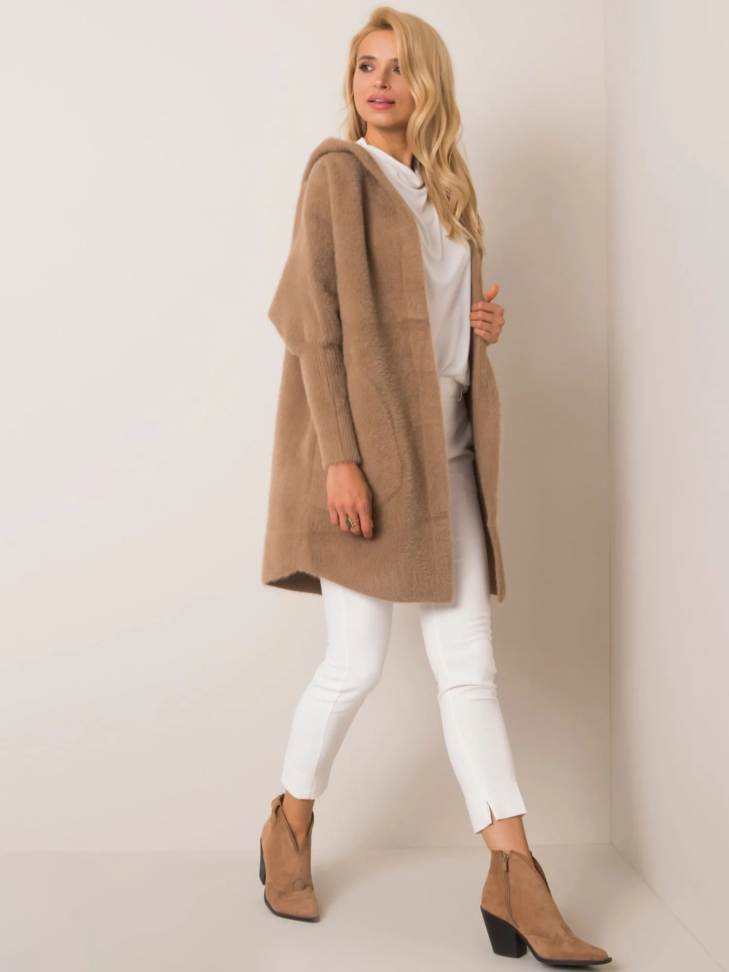 Tamsiai smėlio spalvos alpakų paltas su gobtuvu .