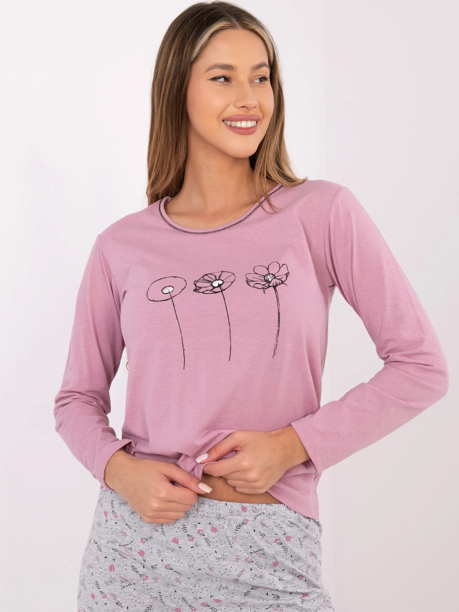 Pižamos išmatavimai M dydžio, išmatuoti plokščiai: palaidinė: plotis po pažastimis - 44 cm, rankovių ilgis - 60 cm, bendras ilgis - 61 cm, plotis apačioje - 48 cm, kelnės: juosmens plotis - 31 cm (plokštai), juosmens plotis - 54 cm (po tempimo), klubų plotis - 51 cm, bendras ilgis - 97 cm.