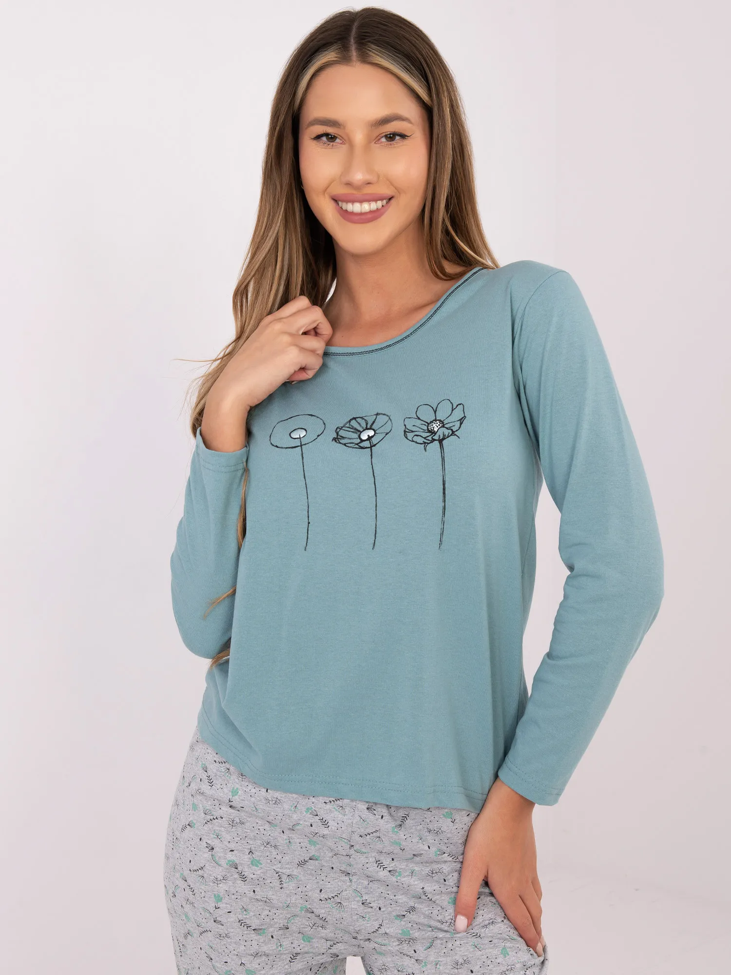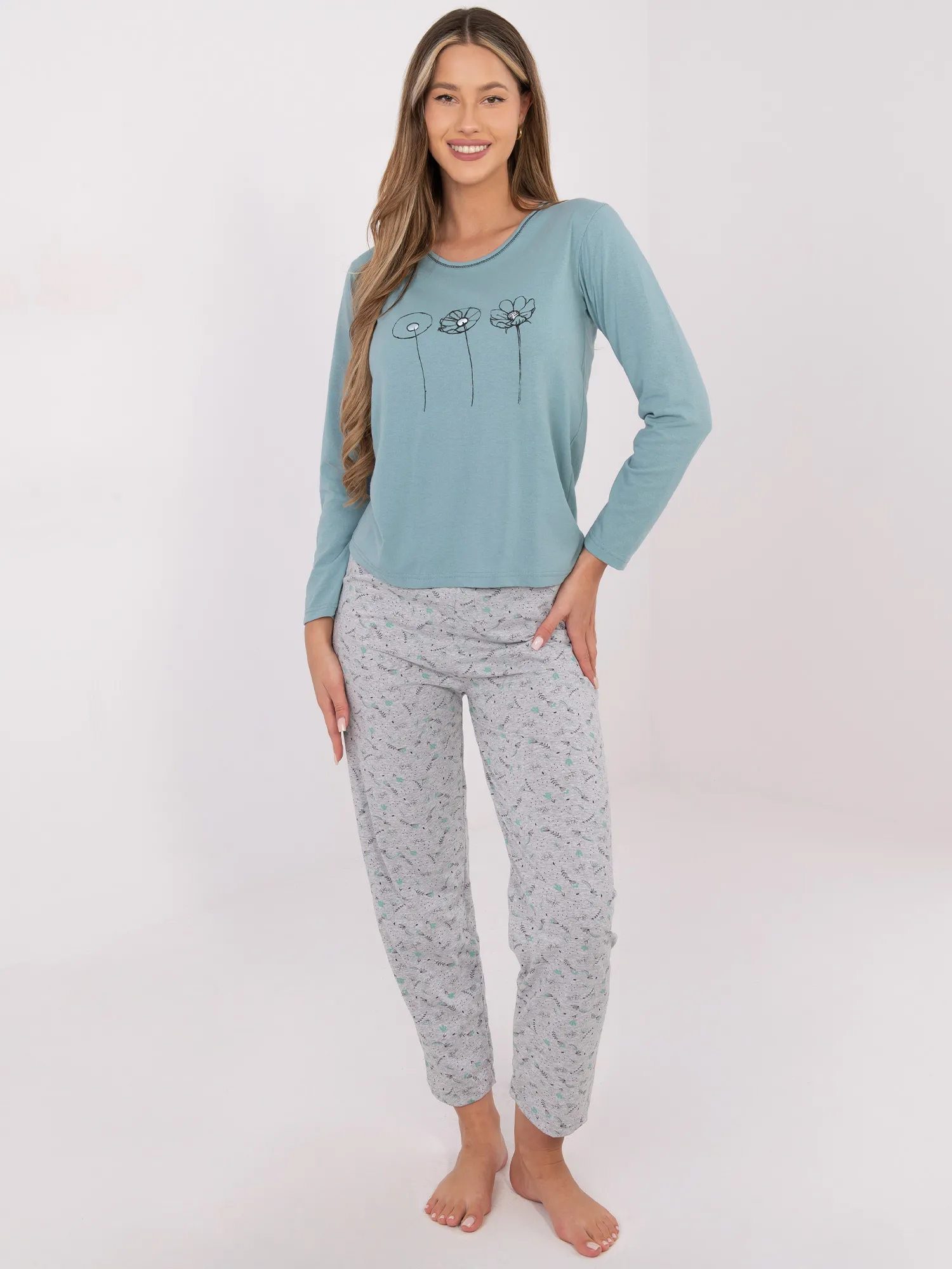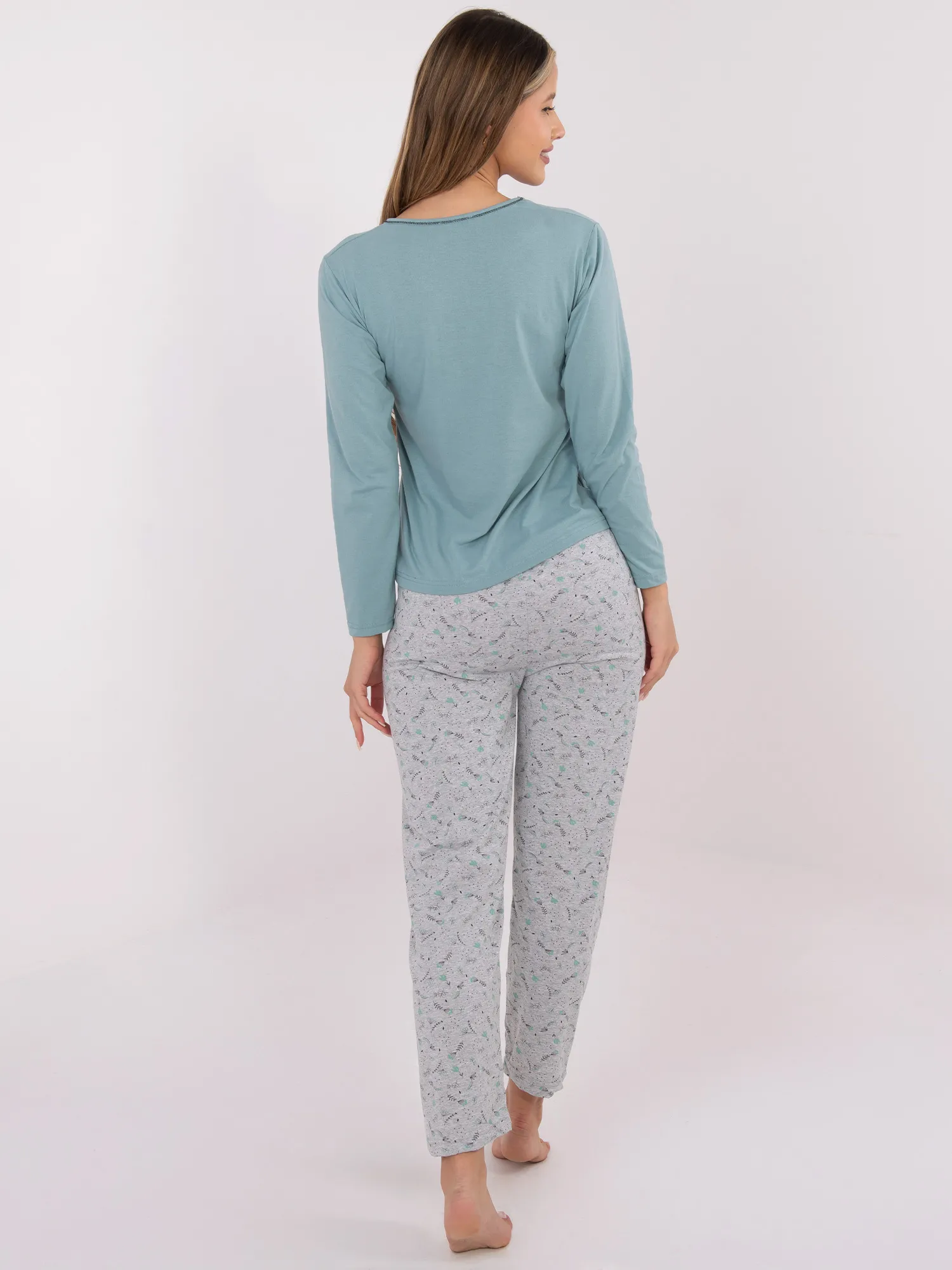 Pižamos išmatavimai M dydžio, išmatuoti plokščiai: palaidinė: plotis po pažastimis - 44 cm, rankovių ilgis - 60 cm, bendras ilgis - 61 cm, plotis apačioje - 48 cm, kelnės: juosmens plotis - 31 cm (plokštai), juosmens plotis - 54 cm (po tempimo), klubų plotis - 51 cm, bendras ilgis - 97 cm.