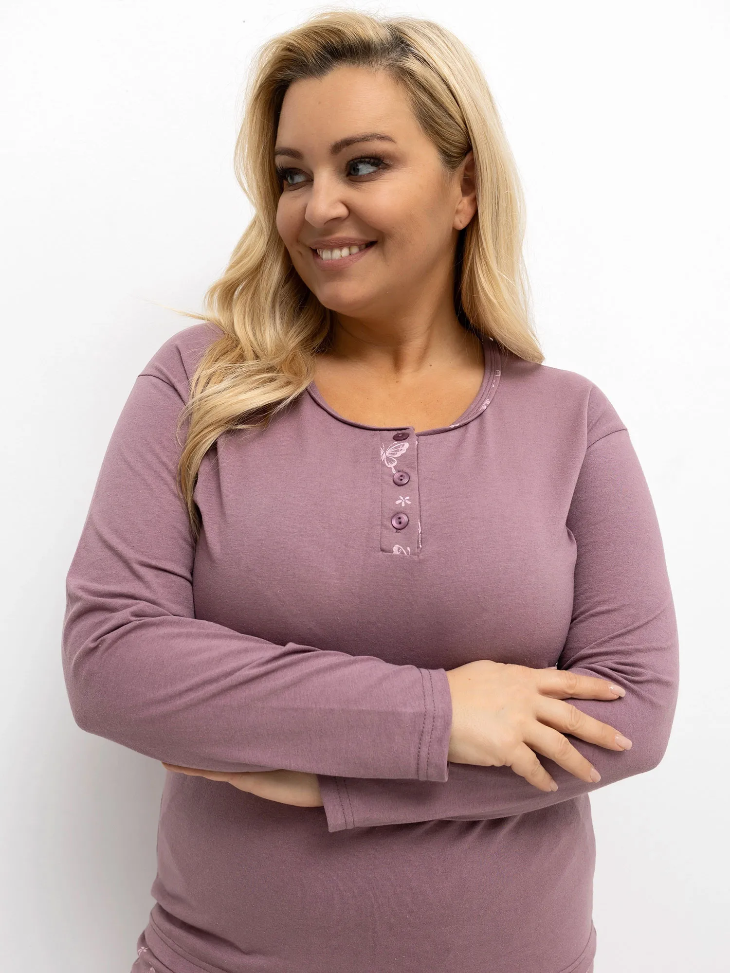 Wymiary piżamy w rozmiarze XL mierzone na płasko: bluzka: szerokość pod pachami - 57 cm, długość rękawa - 58 cm, długość całkowita - 69 cm, szerokość na dole - 56 cm, spodnie: szerokość w pasie - 33 cm (na płasko), szerokość w pasie - 71 cm (po rozciągnięciu), szerokość w biodrach - 61 cm, długość całkowita - 96 cm.