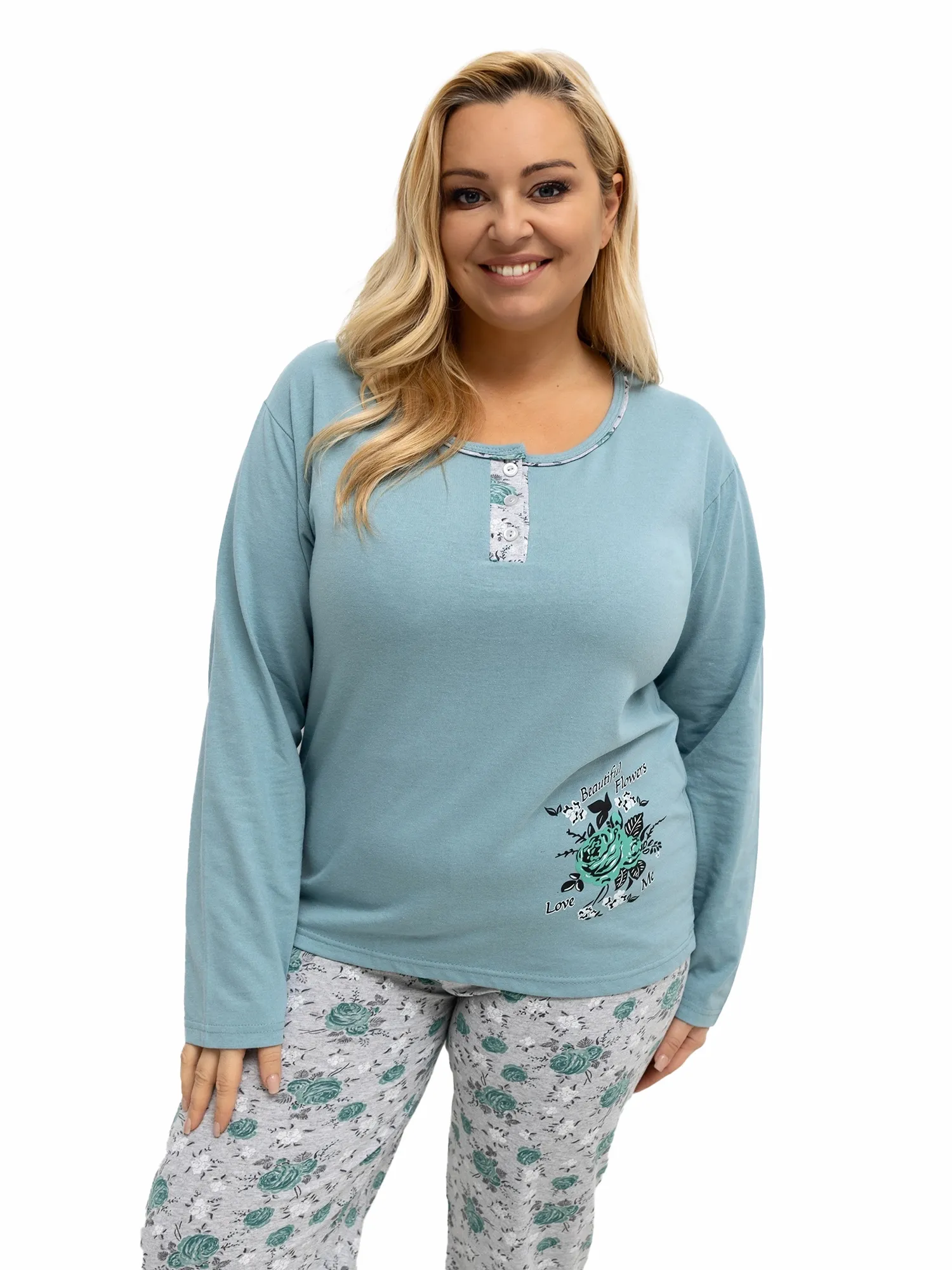 XL dydžio pižamos išmatavimai, išmatuoti plokščiai: palaidinė: plotis po pažastimis - 56 cm, rankovių ilgis - 58 cm, bendras ilgis - 69 cm, plotis apačioje - 56 cm, kelnės: juosmens plotis - 29 cm (ištiestos plokščiai), juosmens plotis - 62 cm (ištempus), klubų plotis - 57 cm, bendras ilgis - 97 cm.
