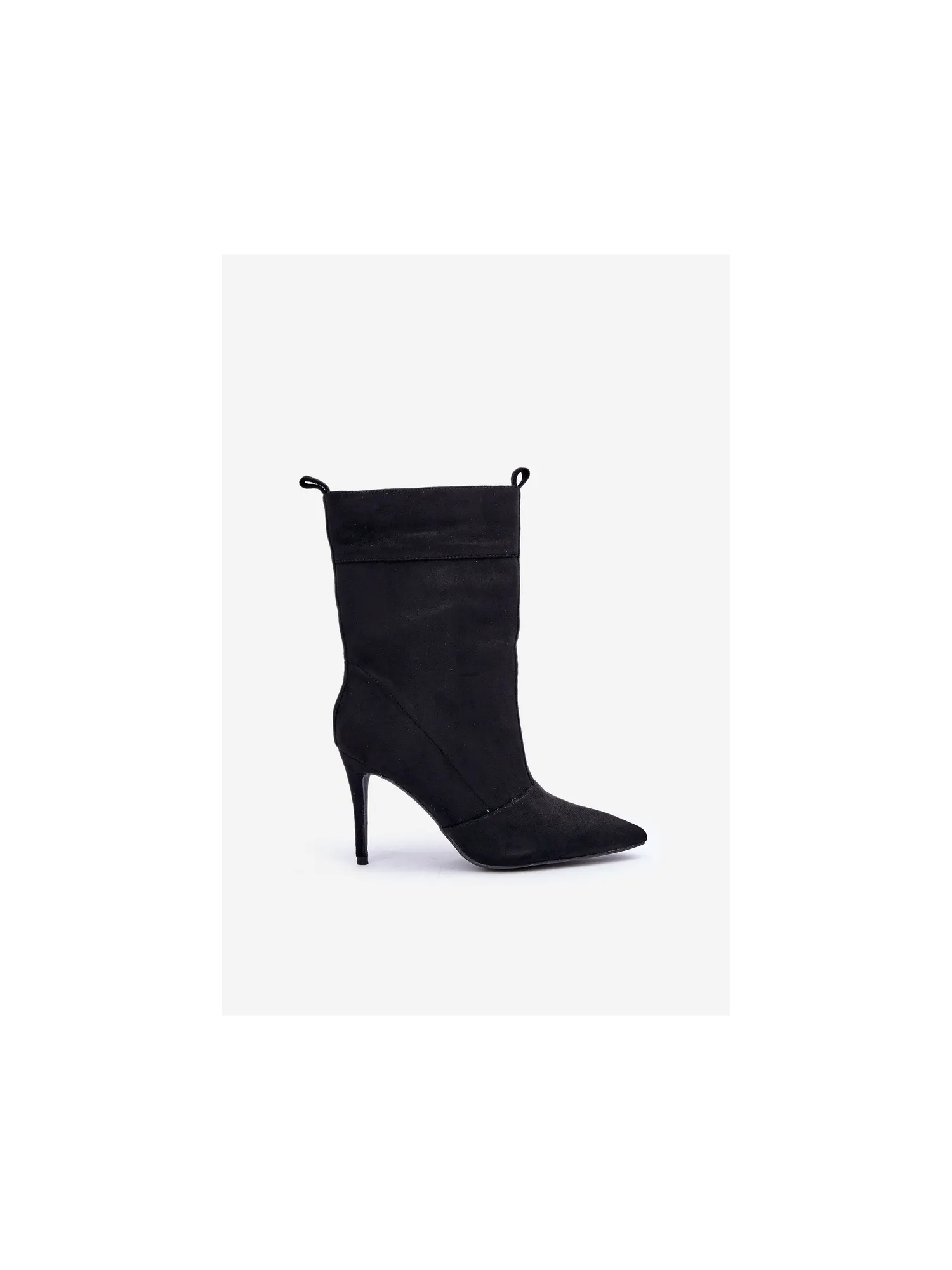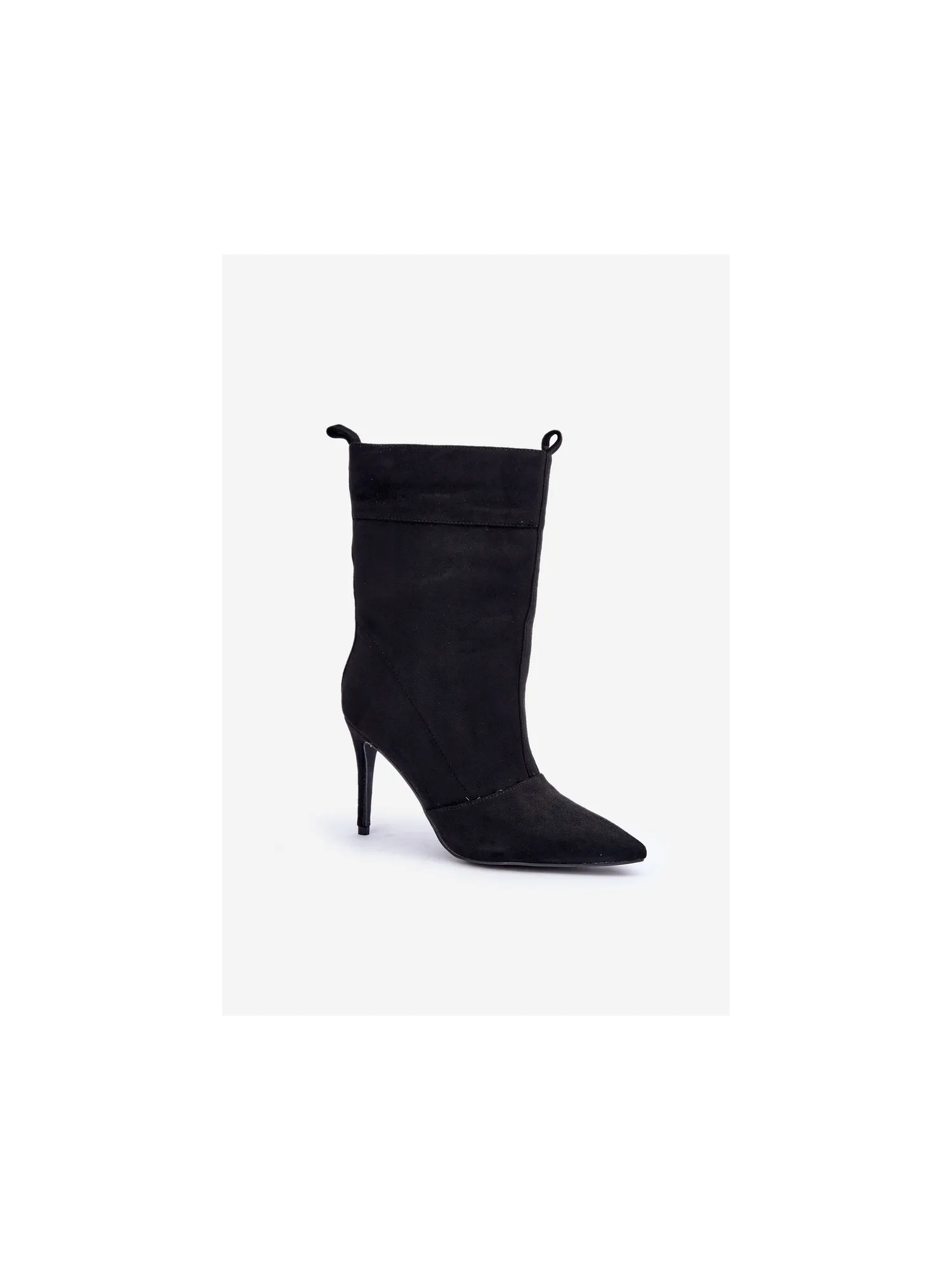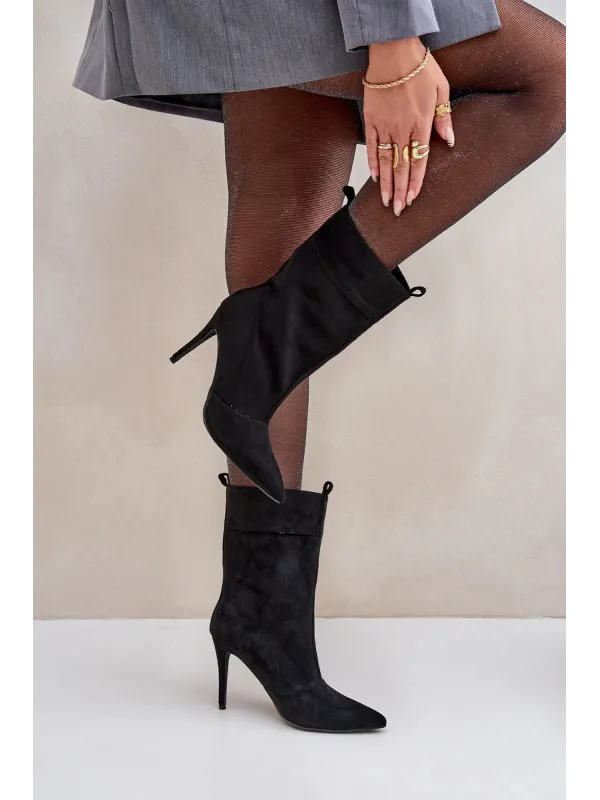 Slip-on women's ankle boots made of soft eco-suede, combining elegance and comfort. Set on a slender stiletto heel, they subtly highlight the silhouette. The model features pointed toes. Perfect for evening styling and special occasions. When choosing a size, please refer to the size chart.