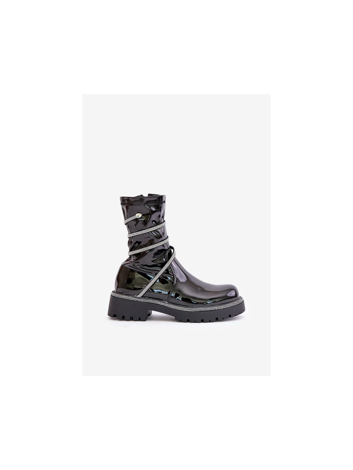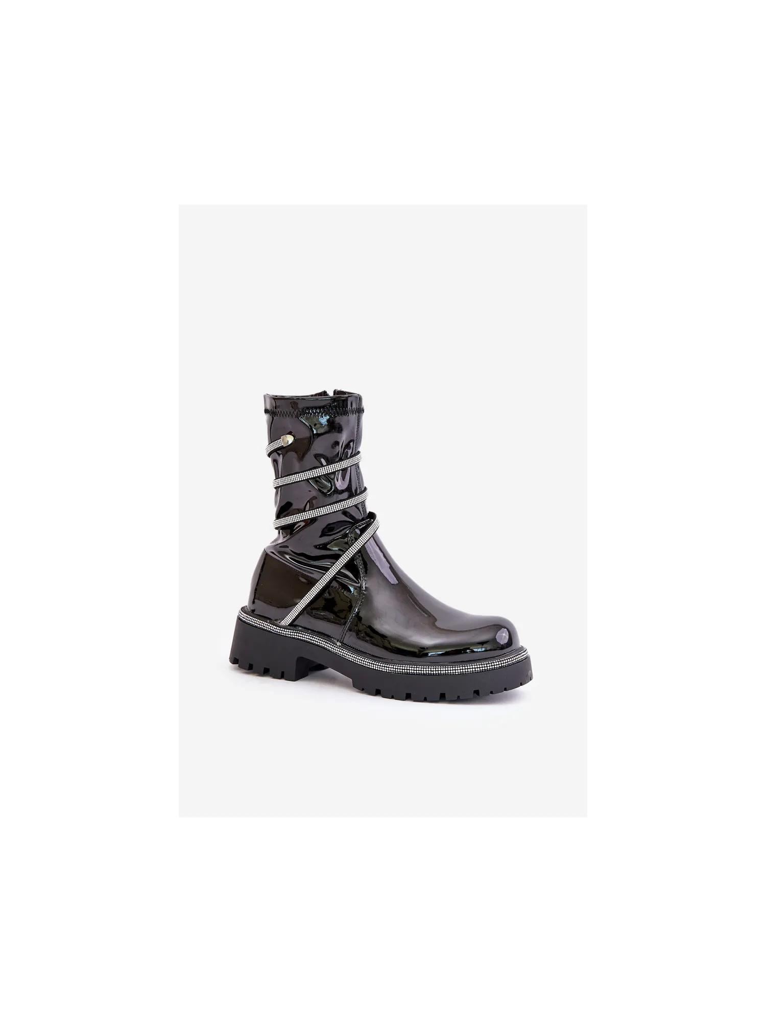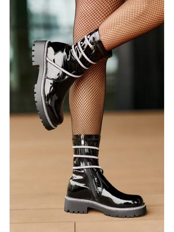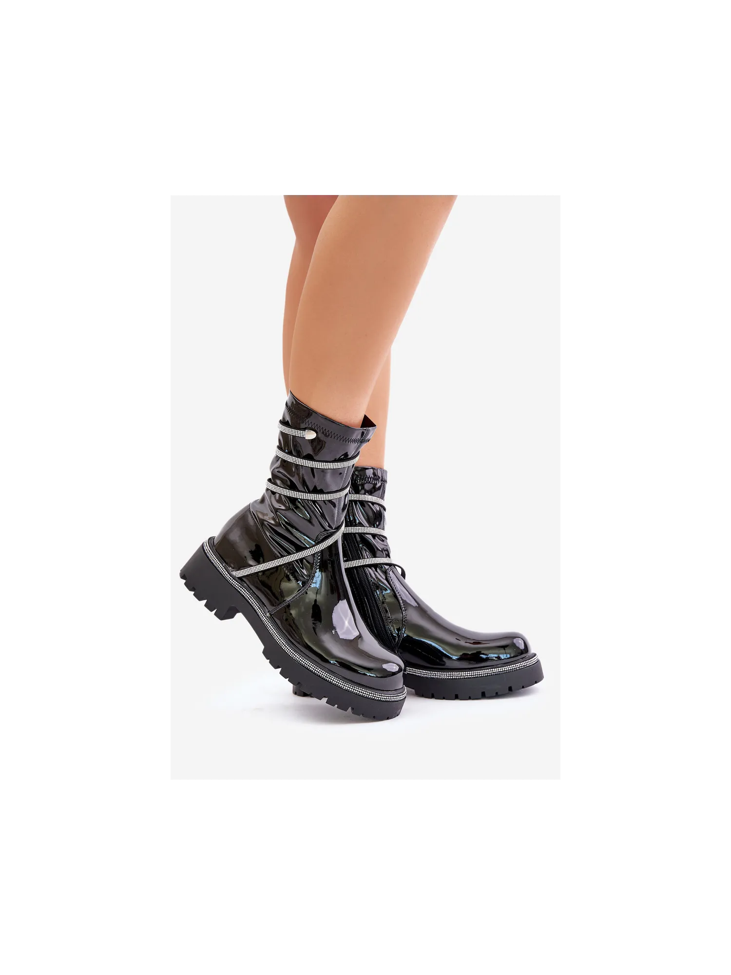 Lacquered ankle boots made of eco-leather are an elegant everyday option. The model is set on a flat heel for comfort, and the rounded toes give them a classic look. The zip fastening makes them easy to put on, and the embellishment with small zirconias adds a unique sparkle. Lined only at the foot height, they provide comfort and lightness while wearing. When choosing a size, please refer to the size chart.