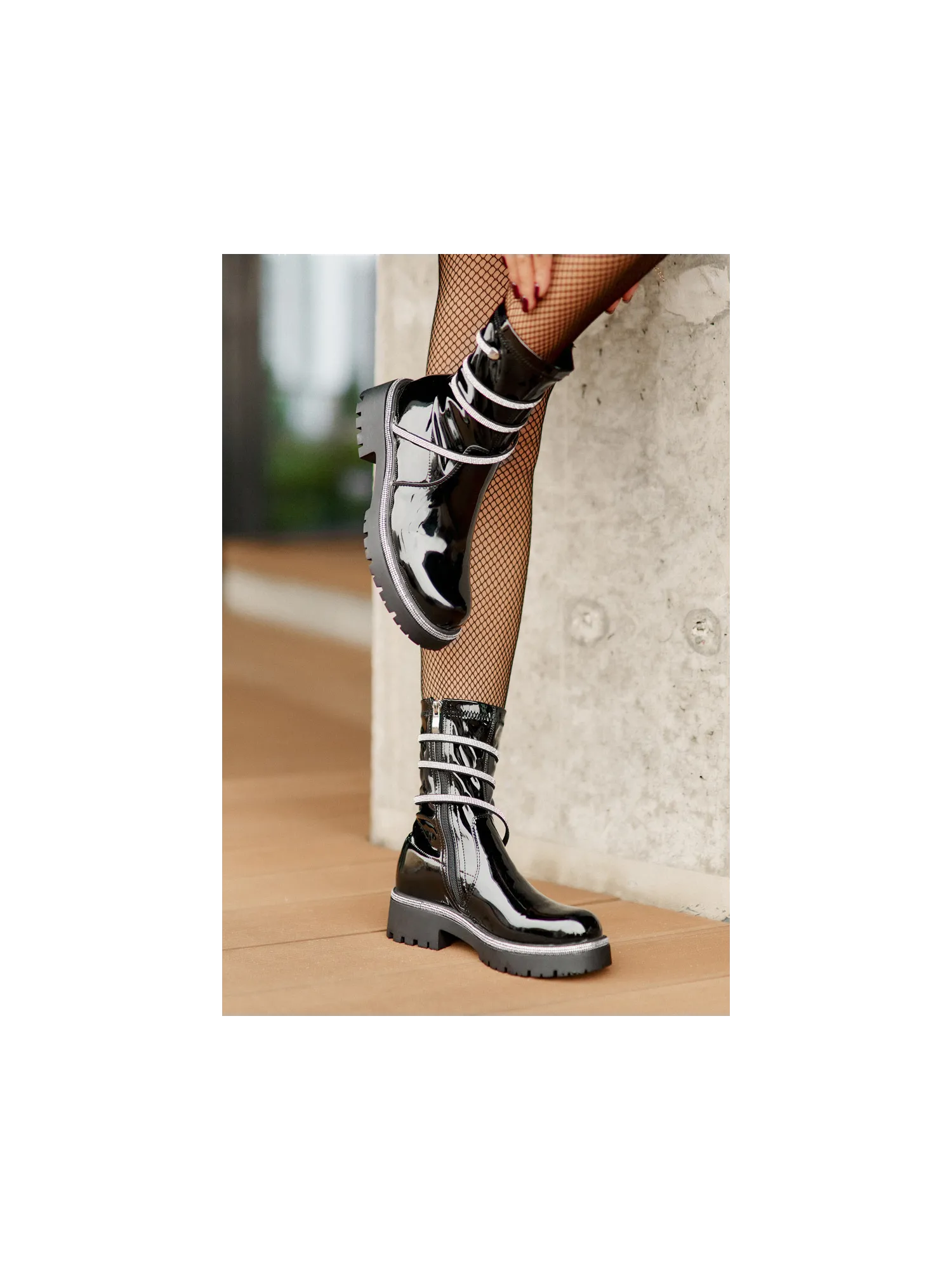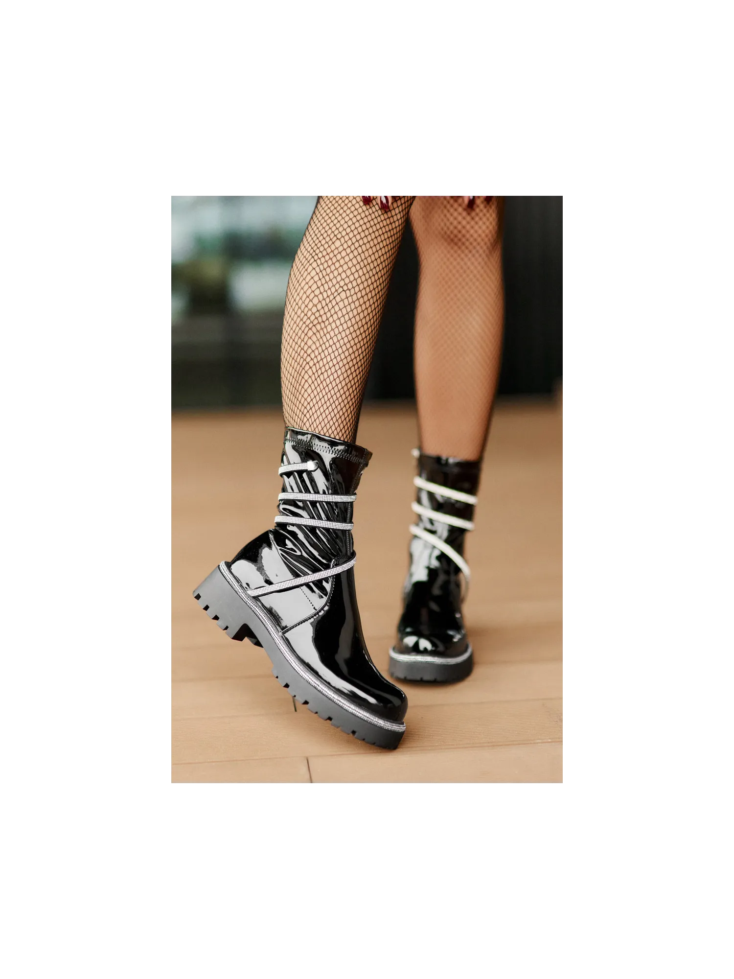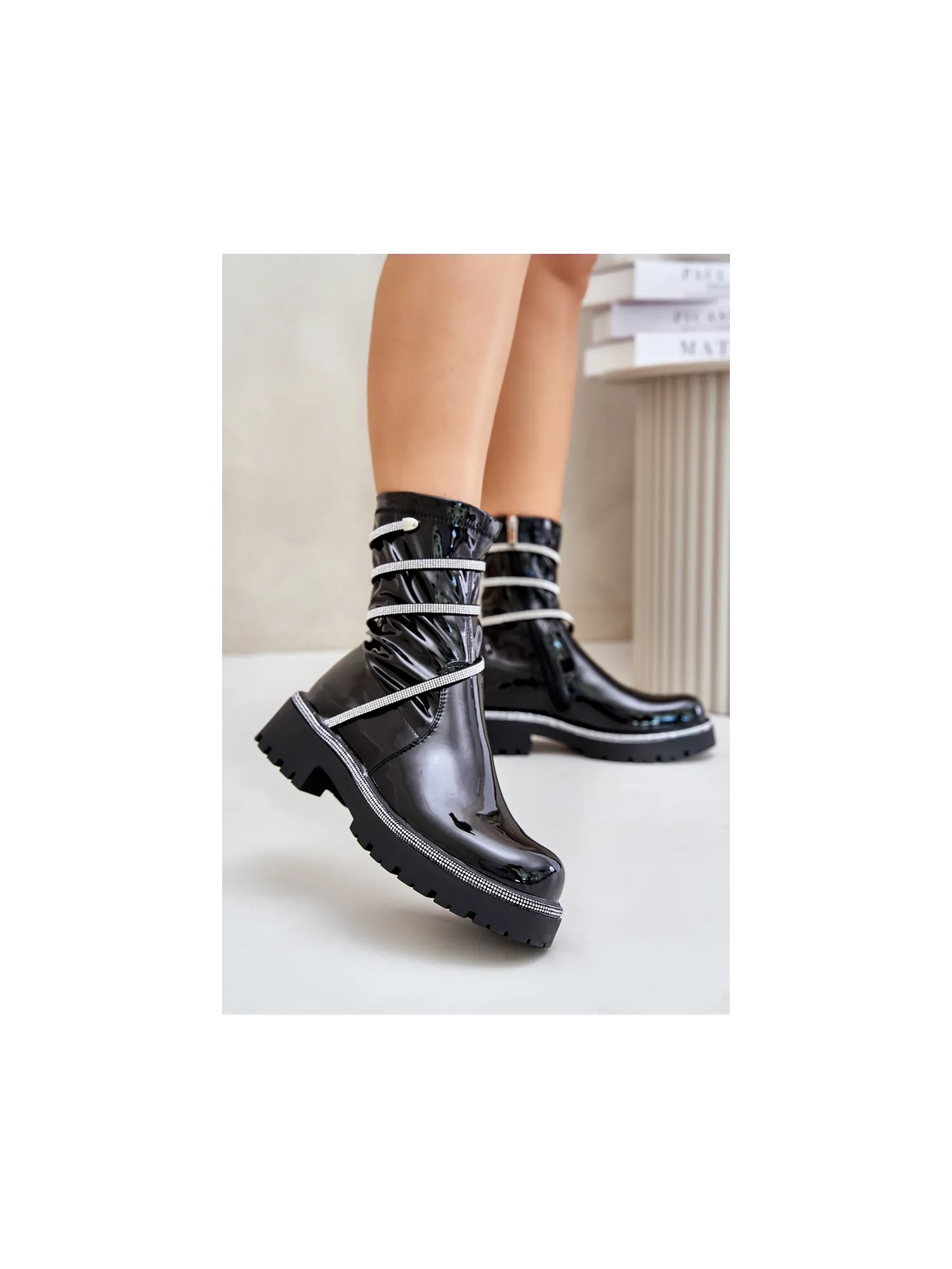 Lacquered ankle boots made of eco-leather are an elegant everyday option. The model is set on a flat heel for comfort, and the rounded toes give them a classic look. The zip fastening makes them easy to put on, and the embellishment with small zirconias adds a unique sparkle. Lined only at the foot height, they provide comfort and lightness while wearing. When choosing a size, please refer to the size chart.