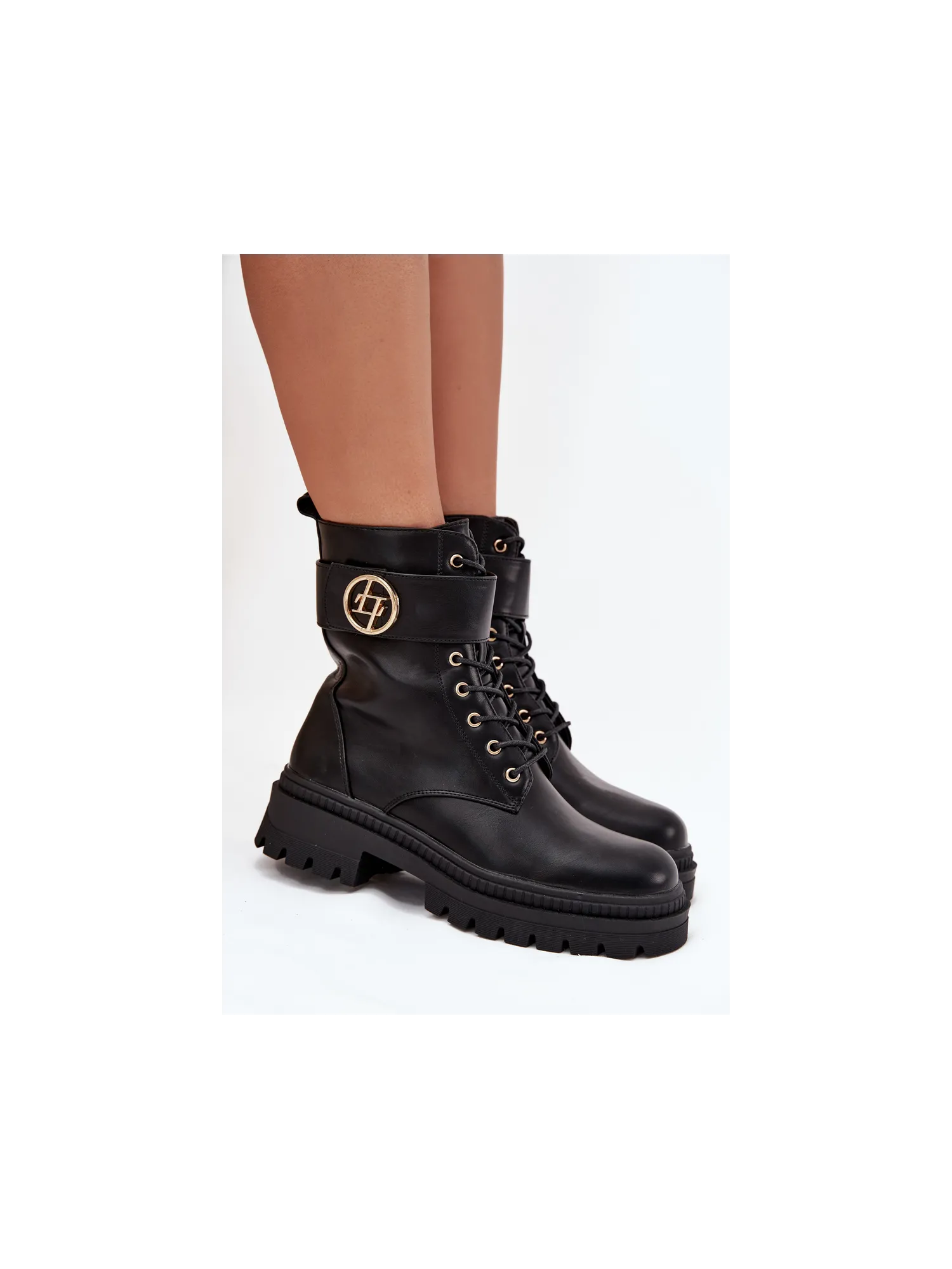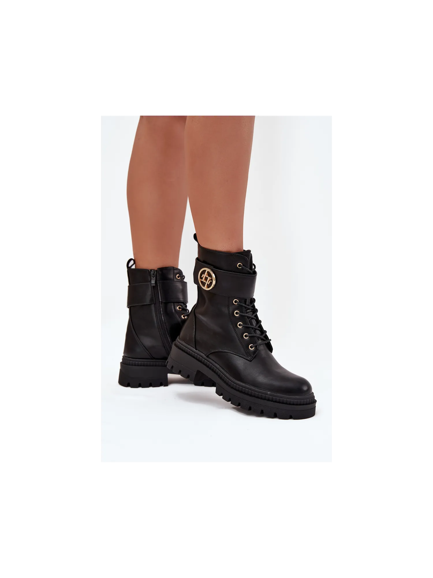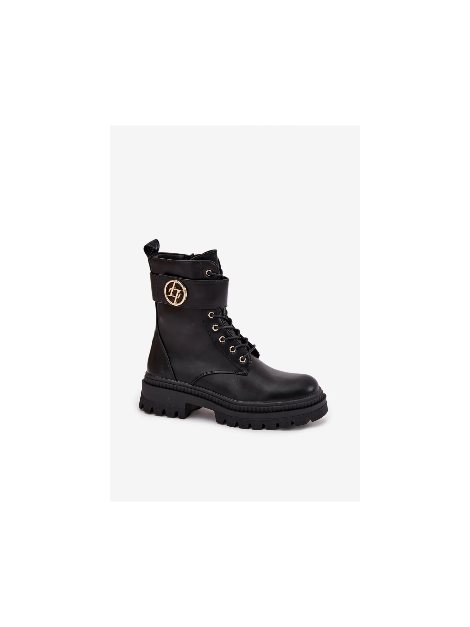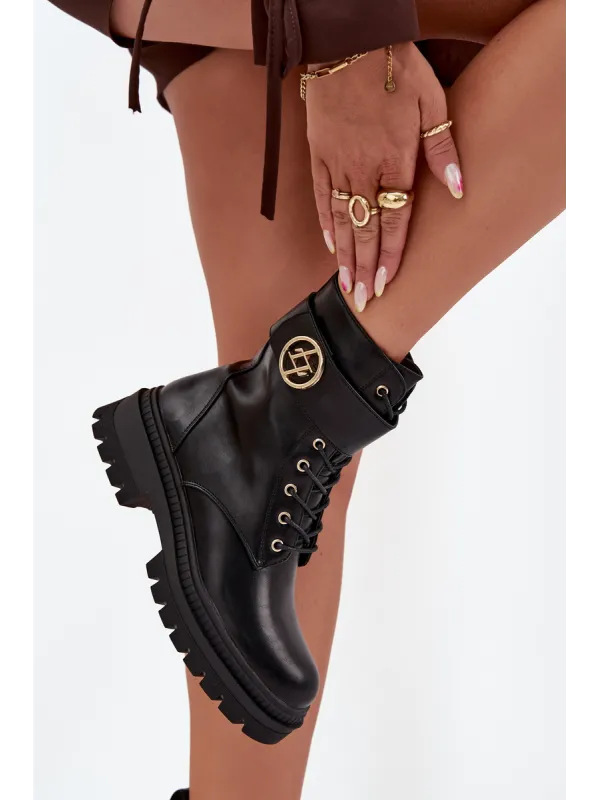 Women's ankle boots made of eco-leather. Set on a platform and flat heel, they provide comfort and stability with every step. The model features a zipper and laces for a perfect fit to the foot. On the side of the shaft, there is a decorative gold detail on the strap. The interior is lined with fur to ensure warmth, making these boots an excellent choice for winter styling. Please refer to the size chart when choosing your size. When choosing a size, please refer to the size chart.