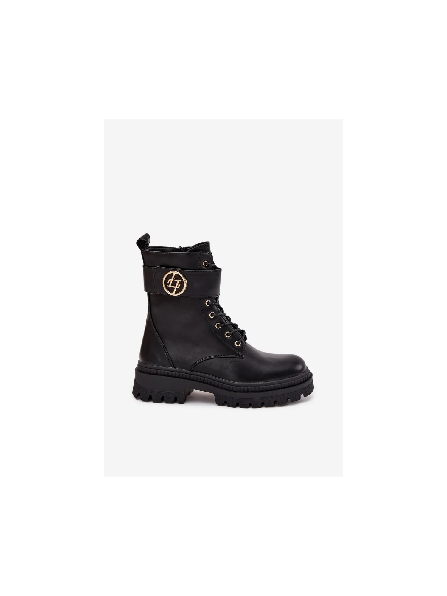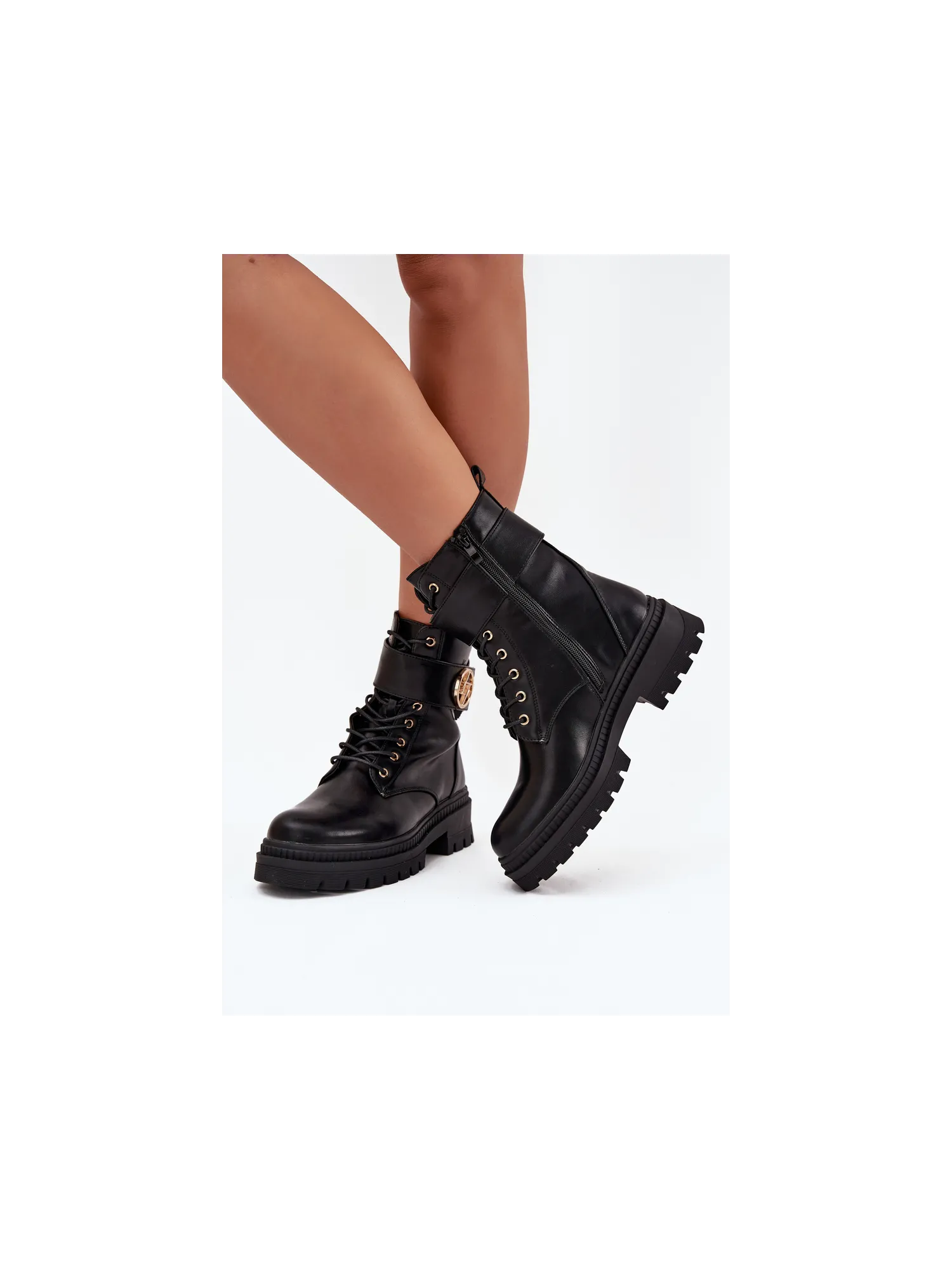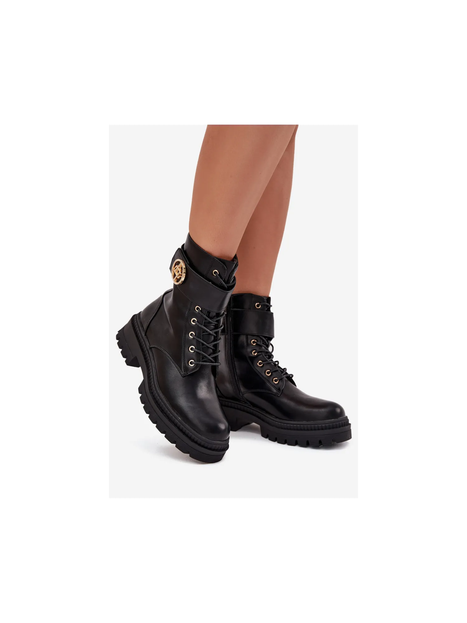 Women's ankle boots made of eco-leather. Set on a platform and flat heel, they provide comfort and stability with every step. The model features a zipper and laces for a perfect fit to the foot. On the side of the shaft, there is a decorative gold detail on the strap. The interior is lined with fur to ensure warmth, making these boots an excellent choice for winter styling. Please refer to the size chart when choosing your size. When choosing a size, please refer to the size chart.