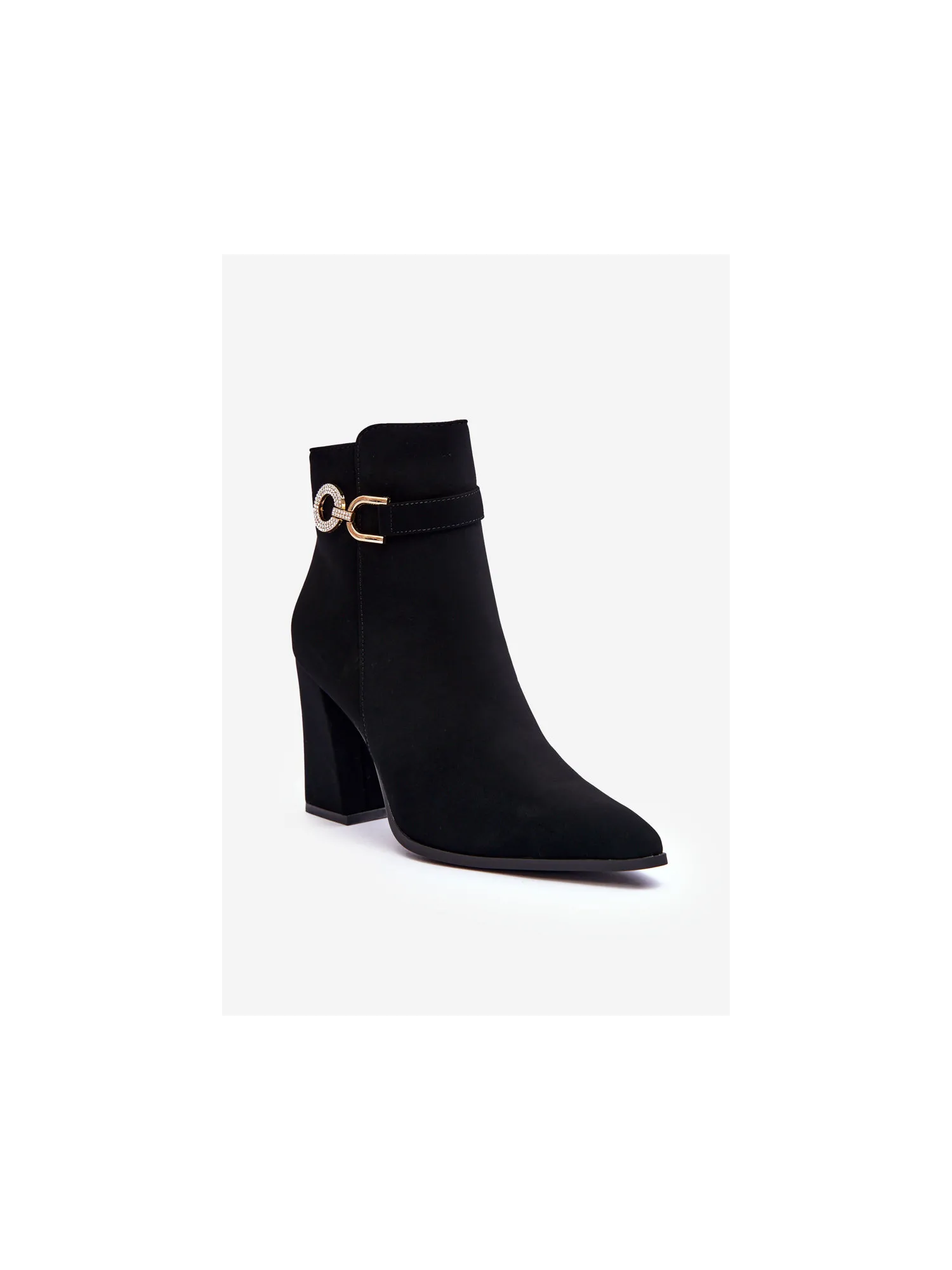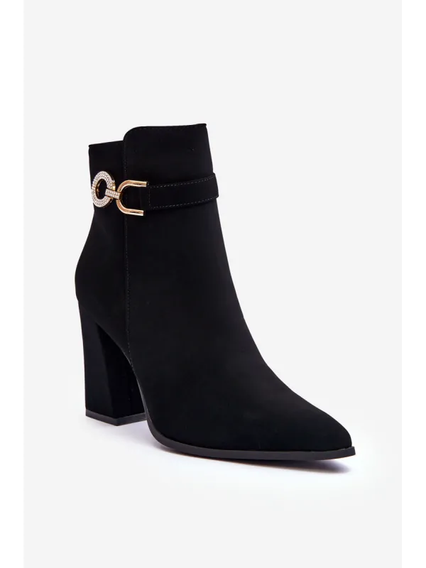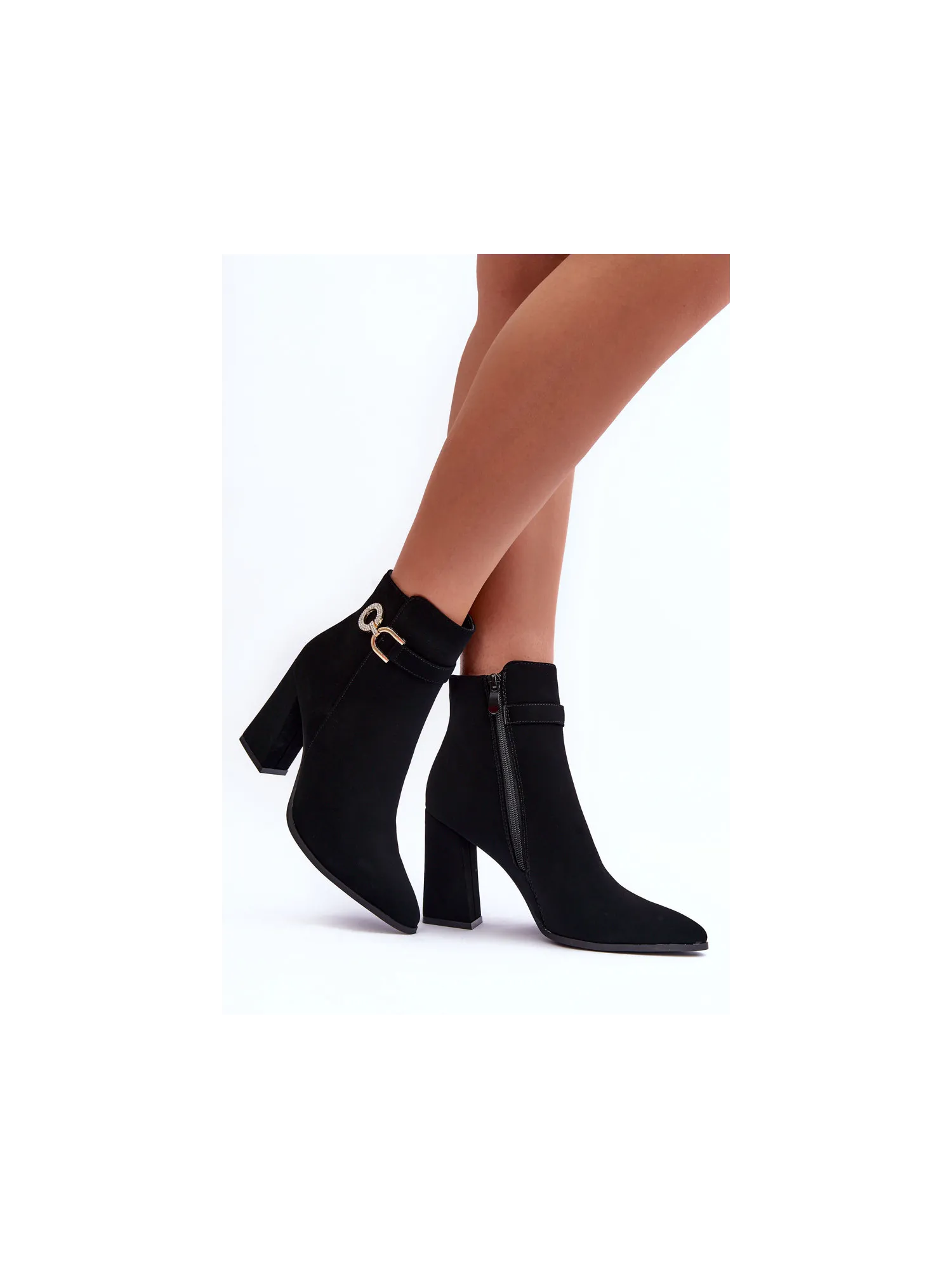 Women's boots have been set on a stable heel in the form of a post. This model is made of eco leather. The interior is warmed with a shoe lining. Zipped on the inside of the upper. The toe is stiffened. The pointed toes will optically slim the legs. On the top of the upper, a thin strap with an ornament. When choosing a size, please refer to the size chart.