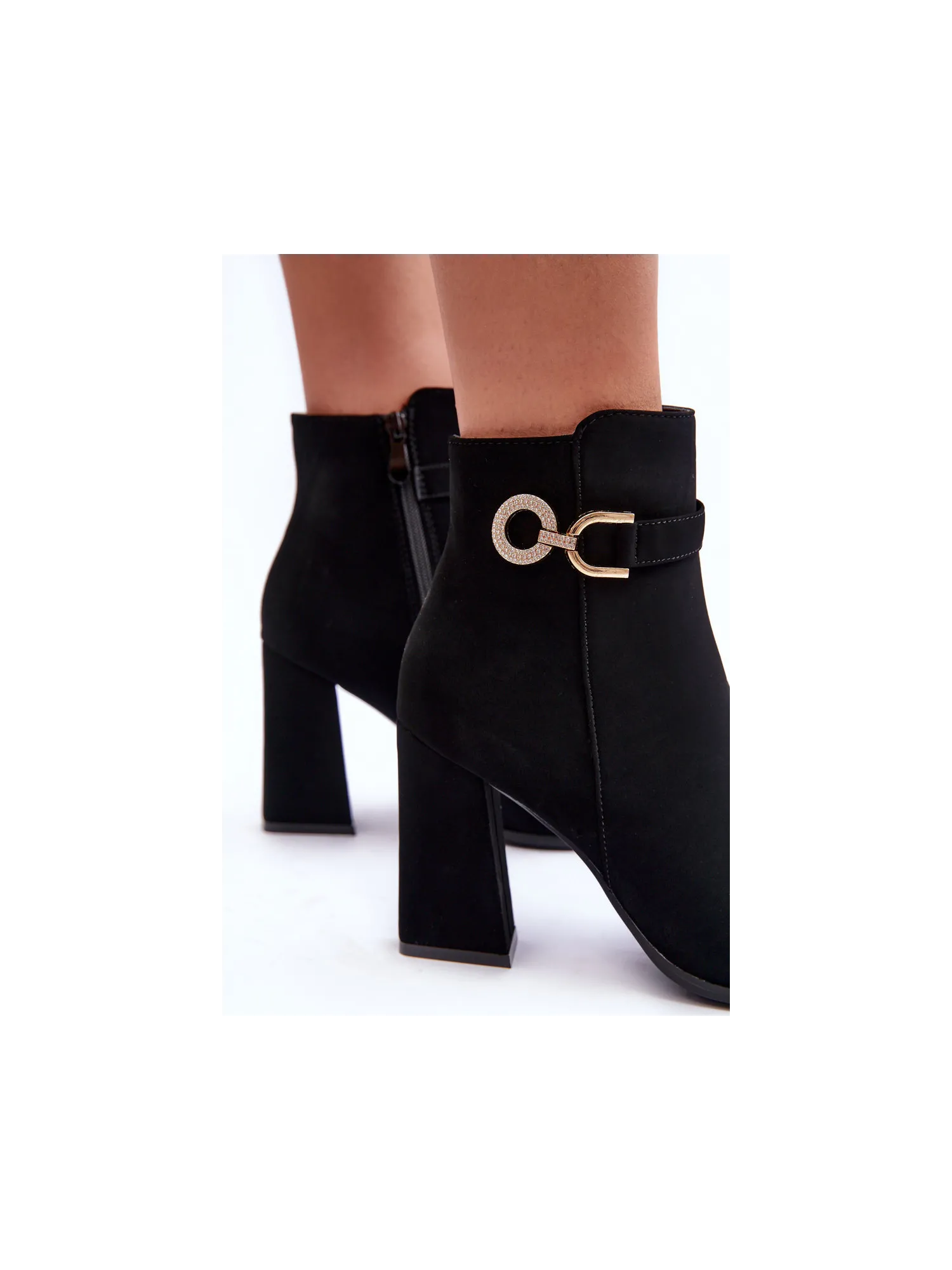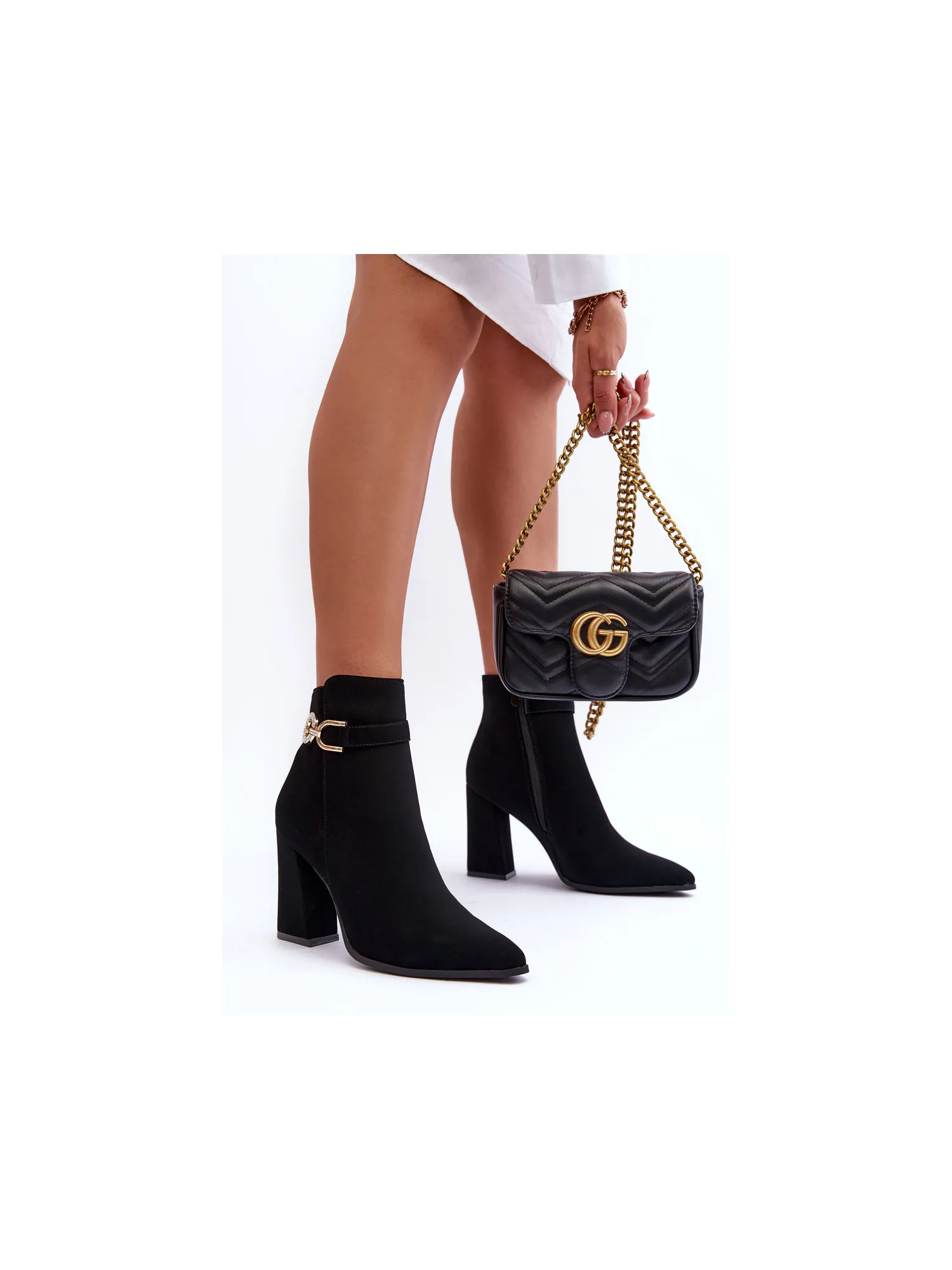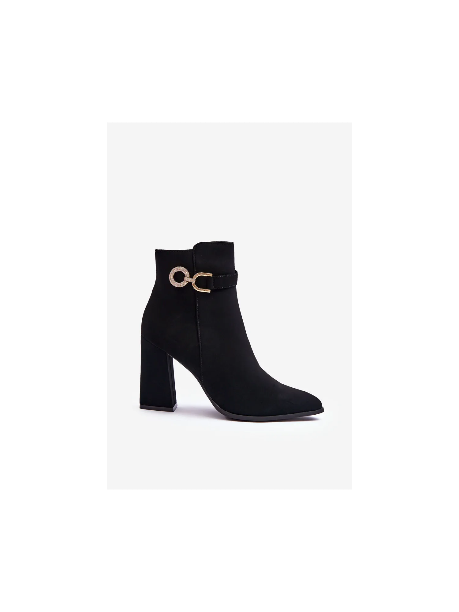 Women's boots have been set on a stable heel in the form of a post. This model is made of eco leather. The interior is warmed with a shoe lining. Zipped on the inside of the upper. The toe is stiffened. The pointed toes will optically slim the legs. On the top of the upper, a thin strap with an ornament. When choosing a size, please refer to the size chart.