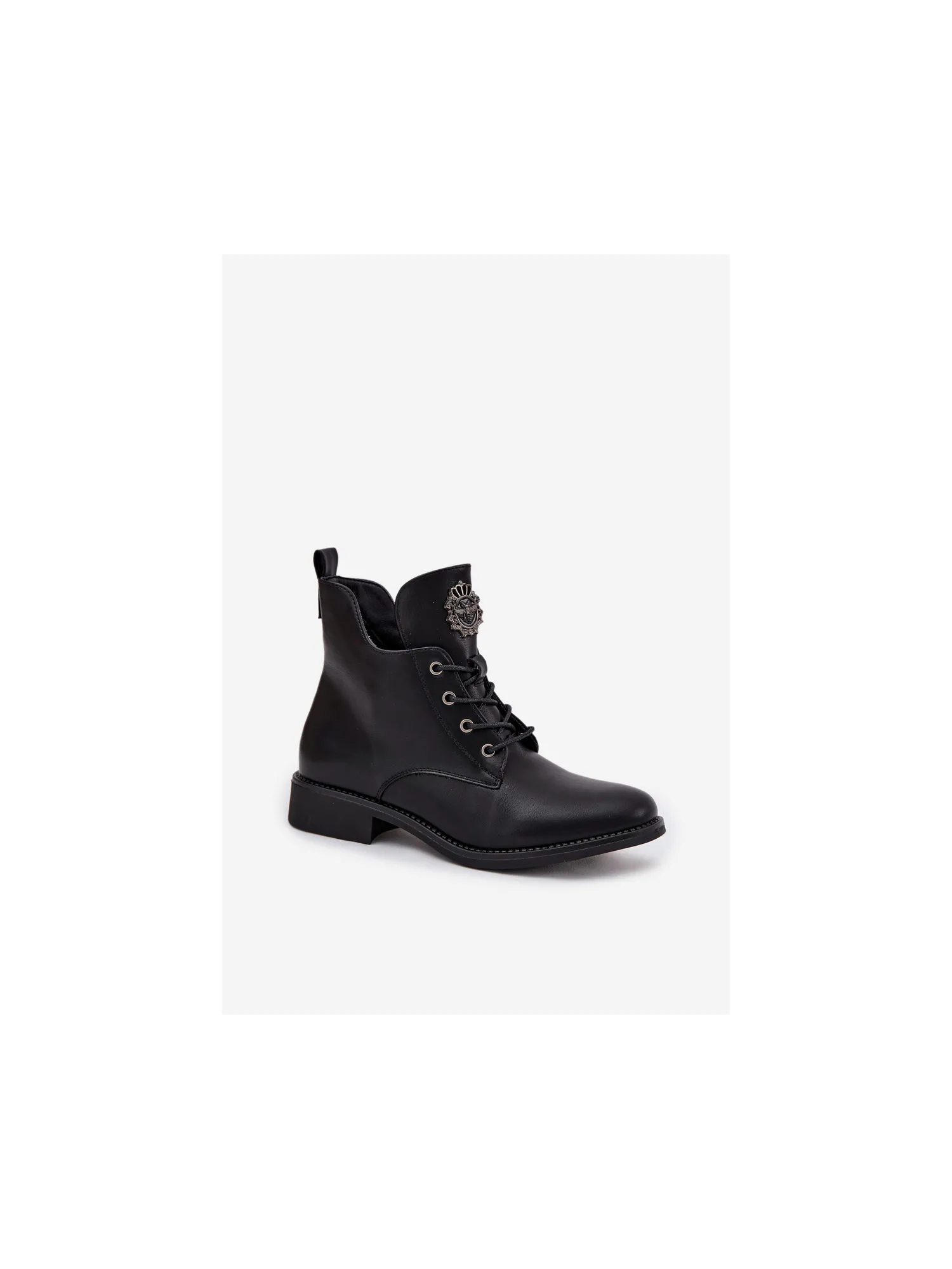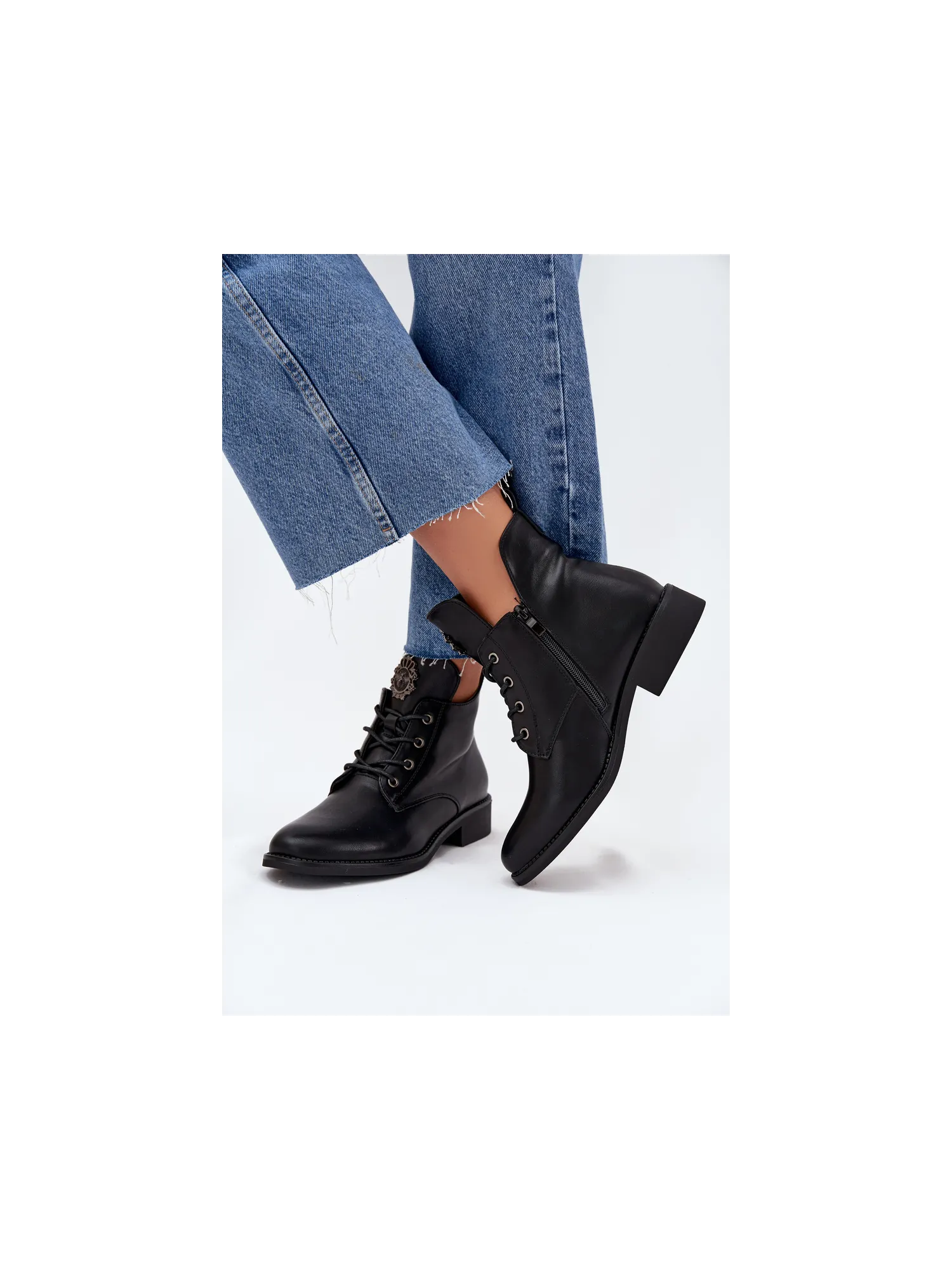 Eco-leather ankle boots are stylish and comfortable footwear for cooler days. Set on a flat heel, they provide comfort for all-day wear. The model features both lacing and a zipper, making it easy to adjust and put on quickly. The interior is lined with warm shoe fleece for added warmth. A detail on the tongue adds an original character. Perfect for everyday casual styling. When choosing a size, please refer to the size chart.