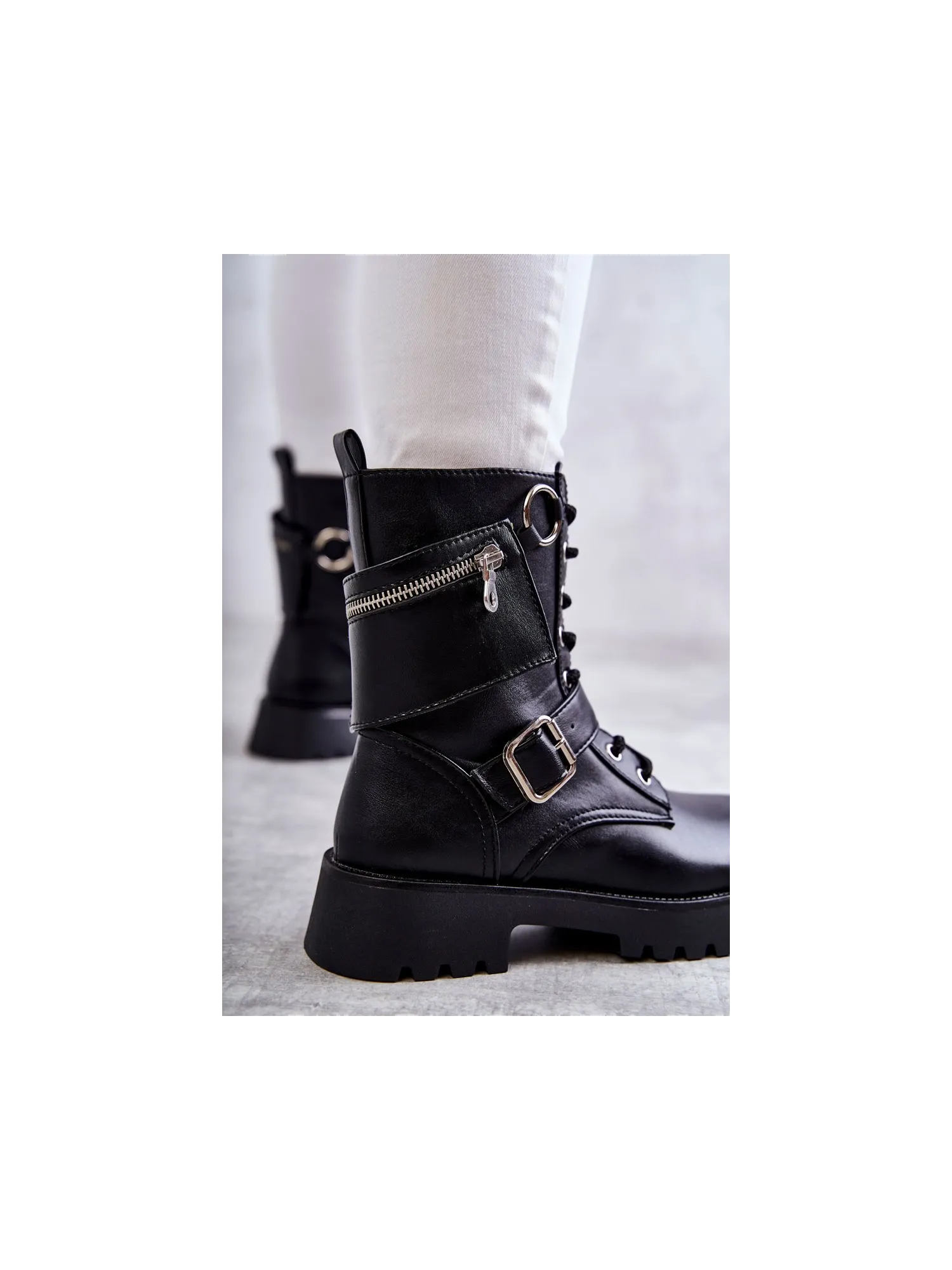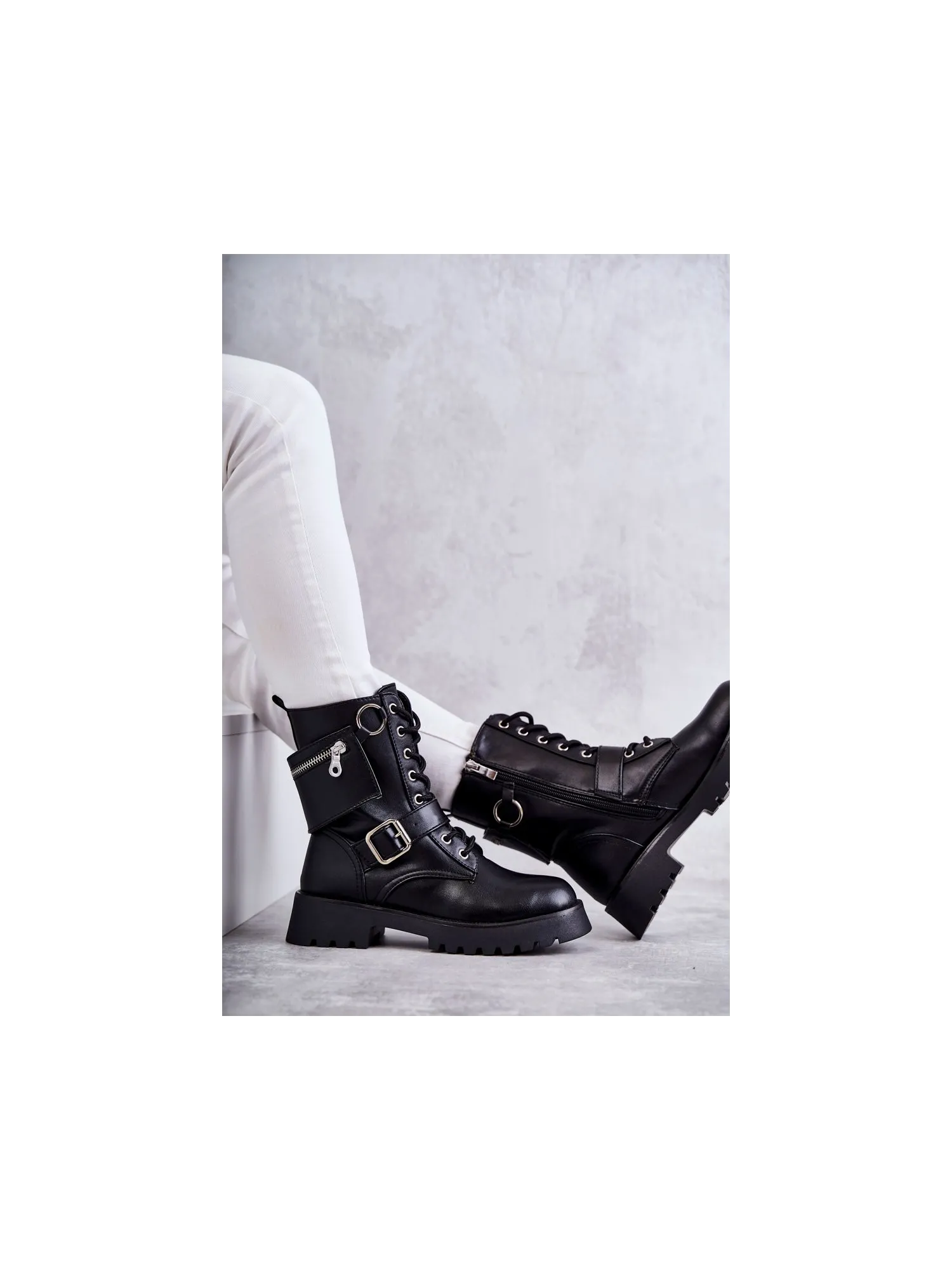 Klasikiniai moteriški batai iš eko odos turi dekoratyvines juosteles viršutinėje dalyje. Suvarstomas modelis, su užtrauktuku viršutinės dalies šone. Jie sumontuoti ant plokščio kulno ir subtilios platformos su grioveliais. Jie turi izoliaciją avalynės antklodės ir standaus kulno skaitiklio pavidalu. Jūs tikrai turėtumėte juos turėti! Renkantis dydį, naudokite dydžių lentelę.