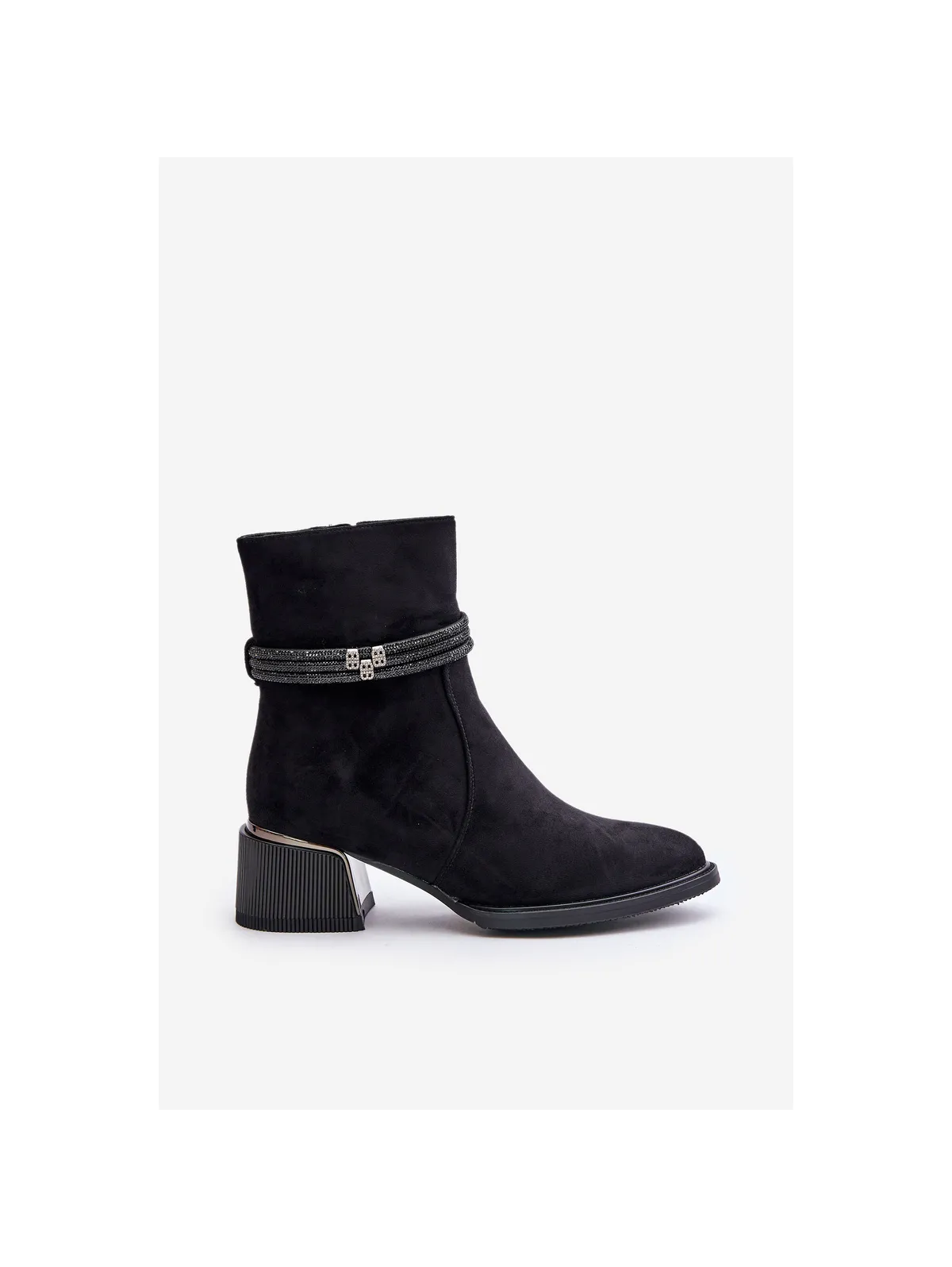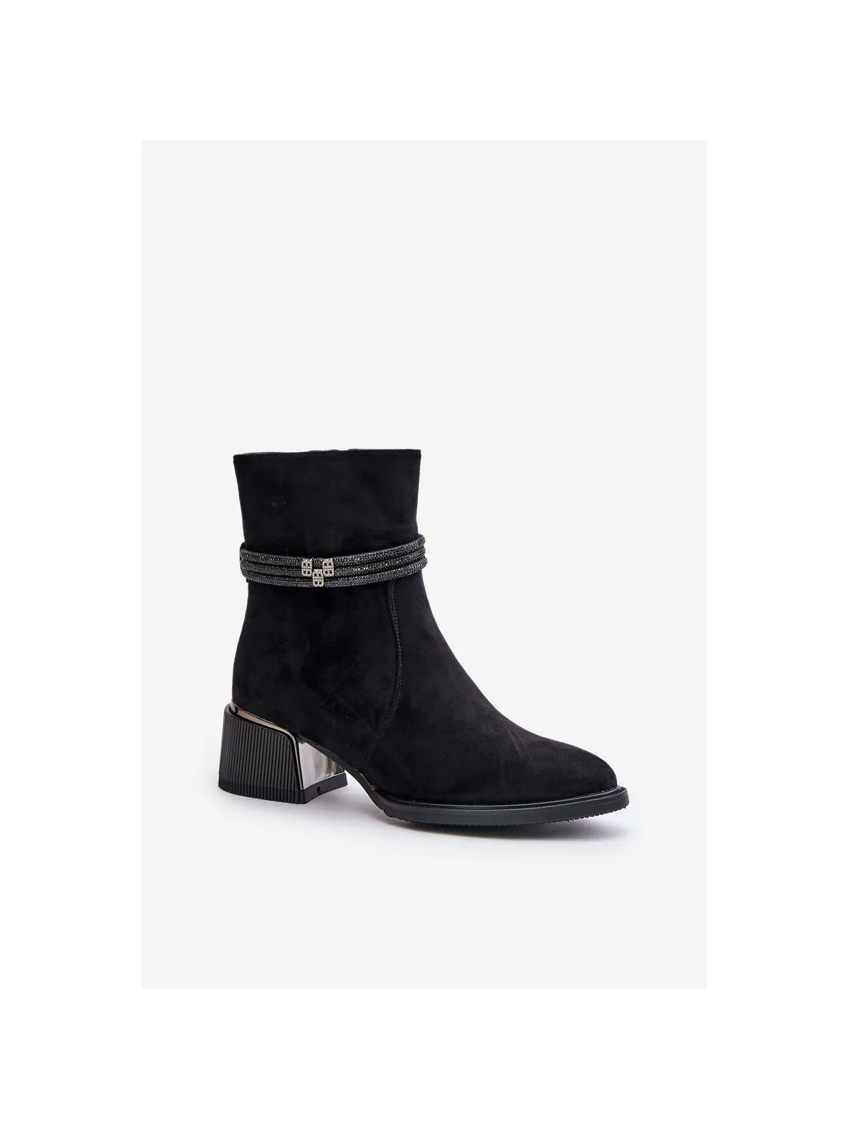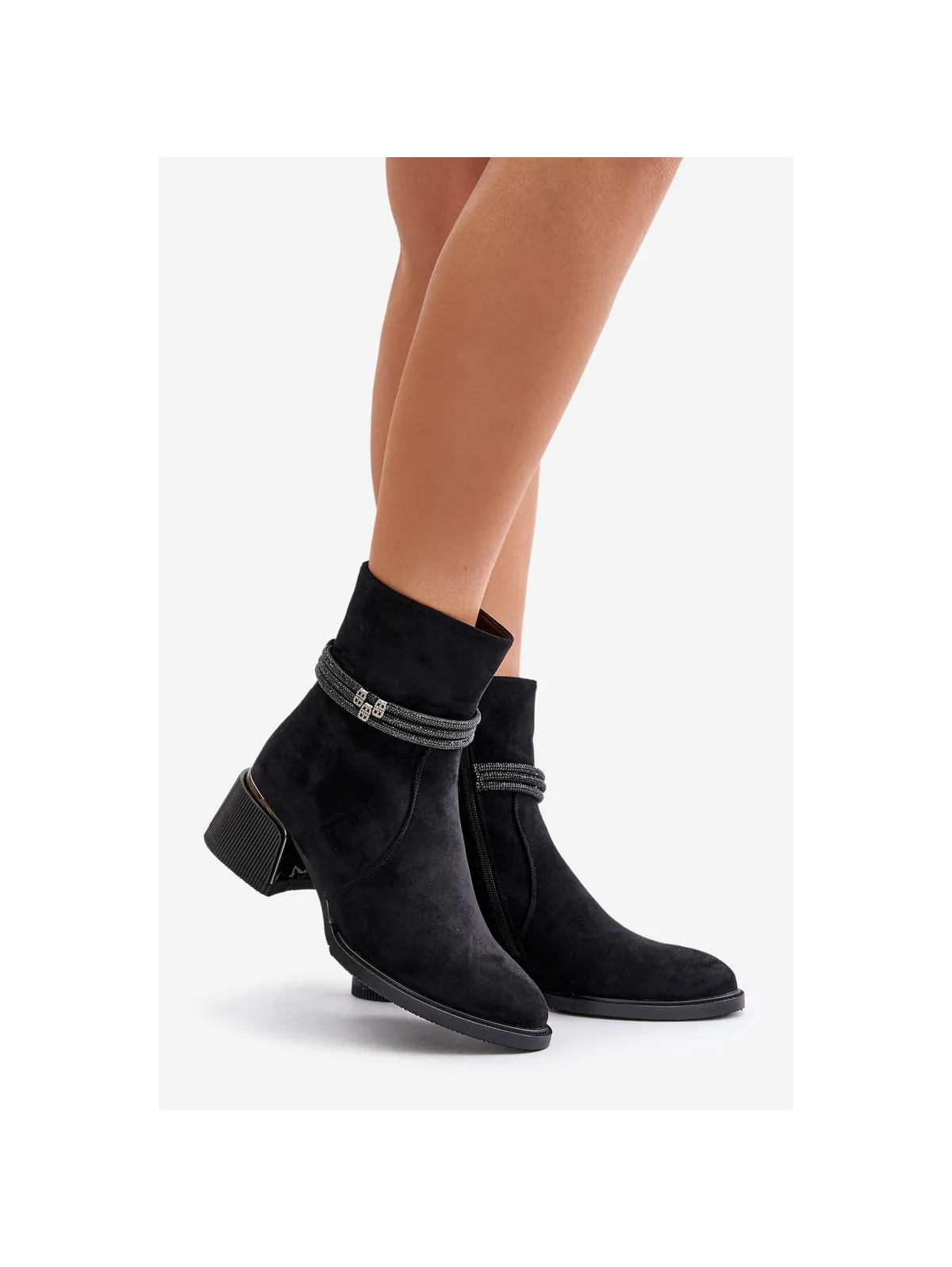 Women's ankle boots made of high-quality eco suede. Set on a low heel. Almond-shaped toes. Insulated with shoe fleece. Zip fastening. The main advantage of this model is the shiny straps on the shaft. When choosing a size, please refer to the size chart.