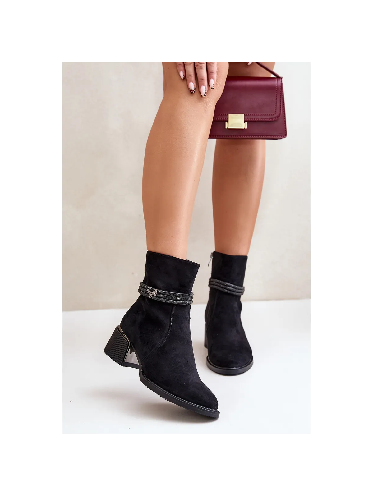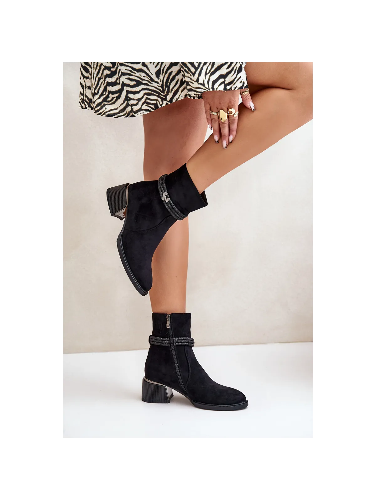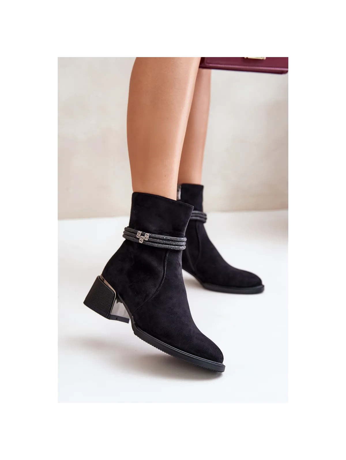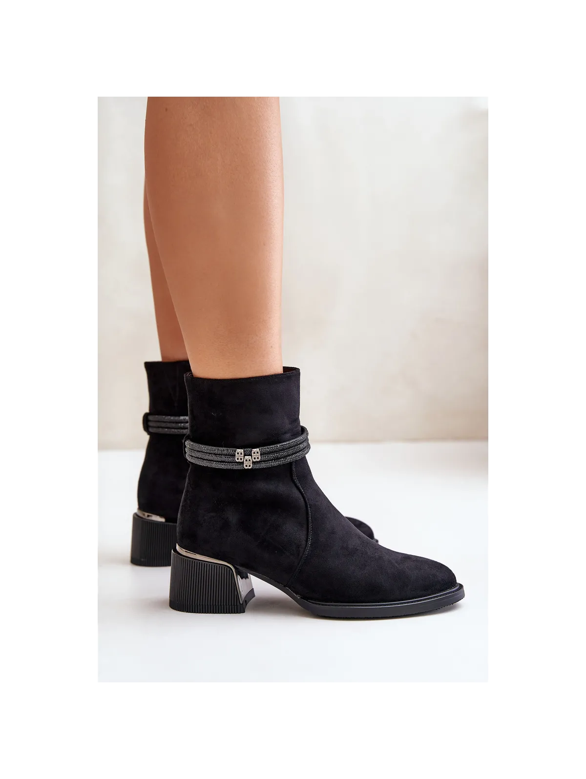 Women's ankle boots made of high-quality eco suede. Set on a low heel. Almond-shaped toes. Insulated with shoe fleece. Zip fastening. The main advantage of this model is the shiny straps on the shaft. When choosing a size, please refer to the size chart.