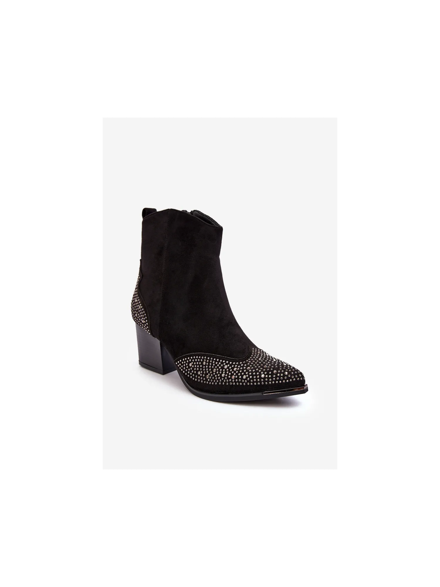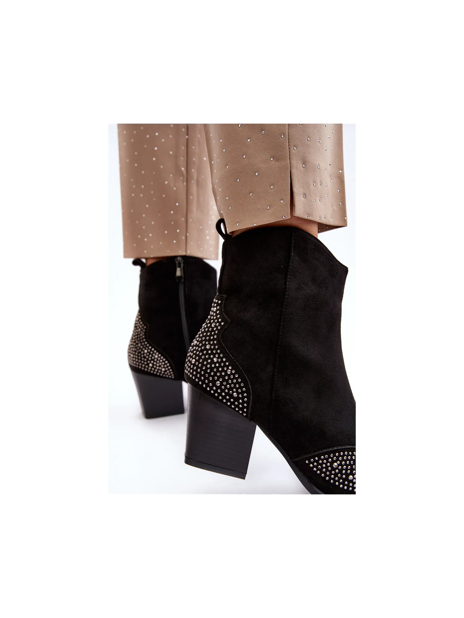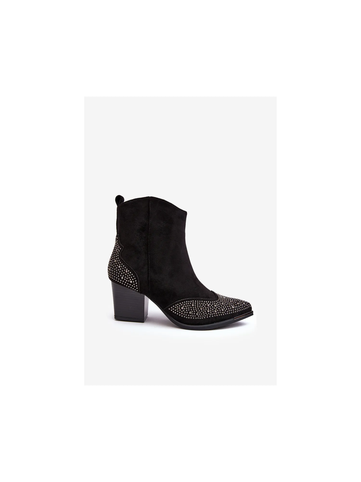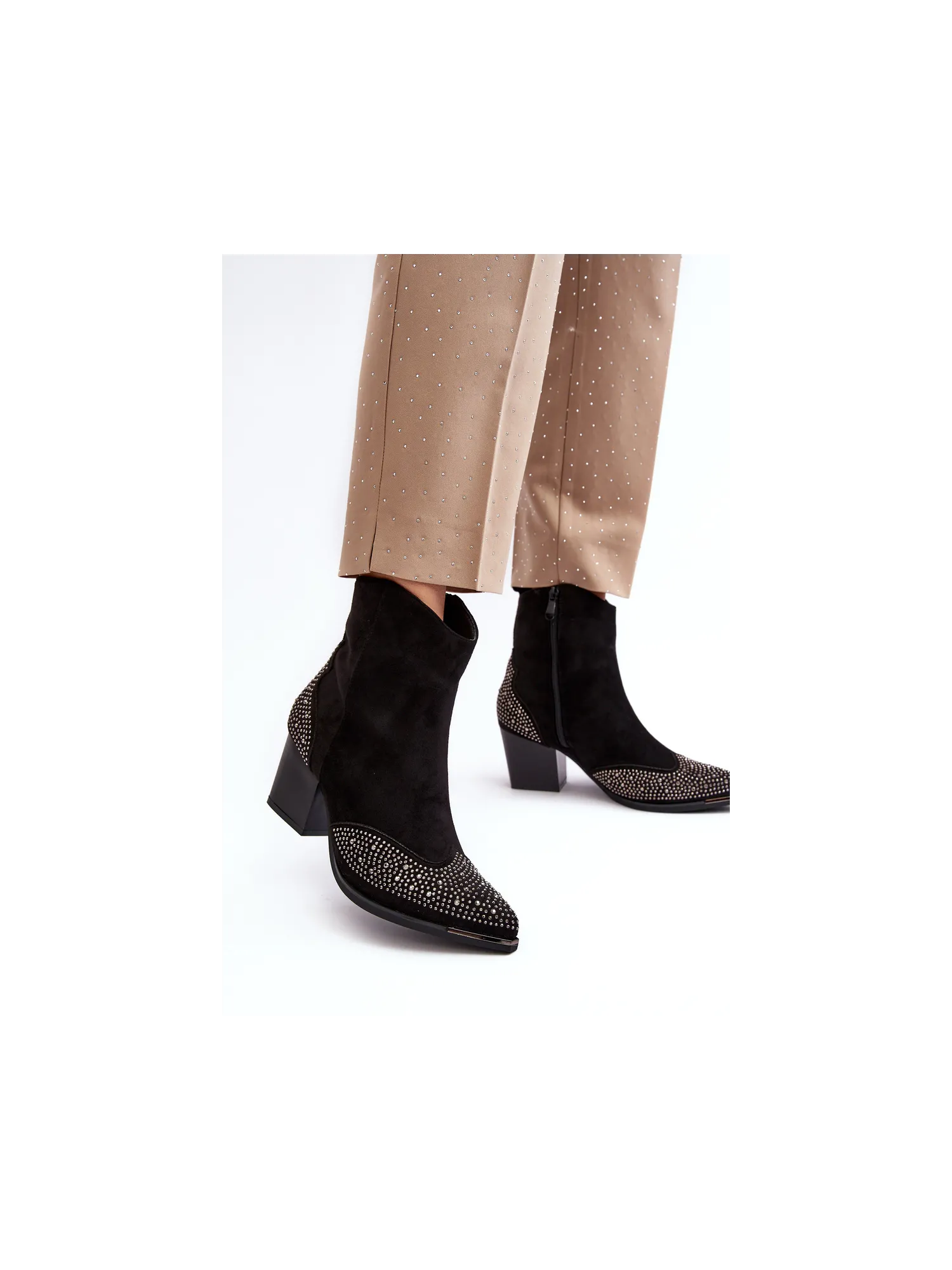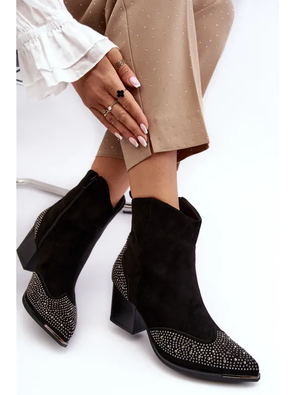 Cowboy-style boots made of eco suede. Set on a heel in the form of a column. Pointy toes optically slim the legs. The upper decorated with small studs. The inside lined with a shoe lining. Zipper closure model. When choosing a size, please refer to the size chart.