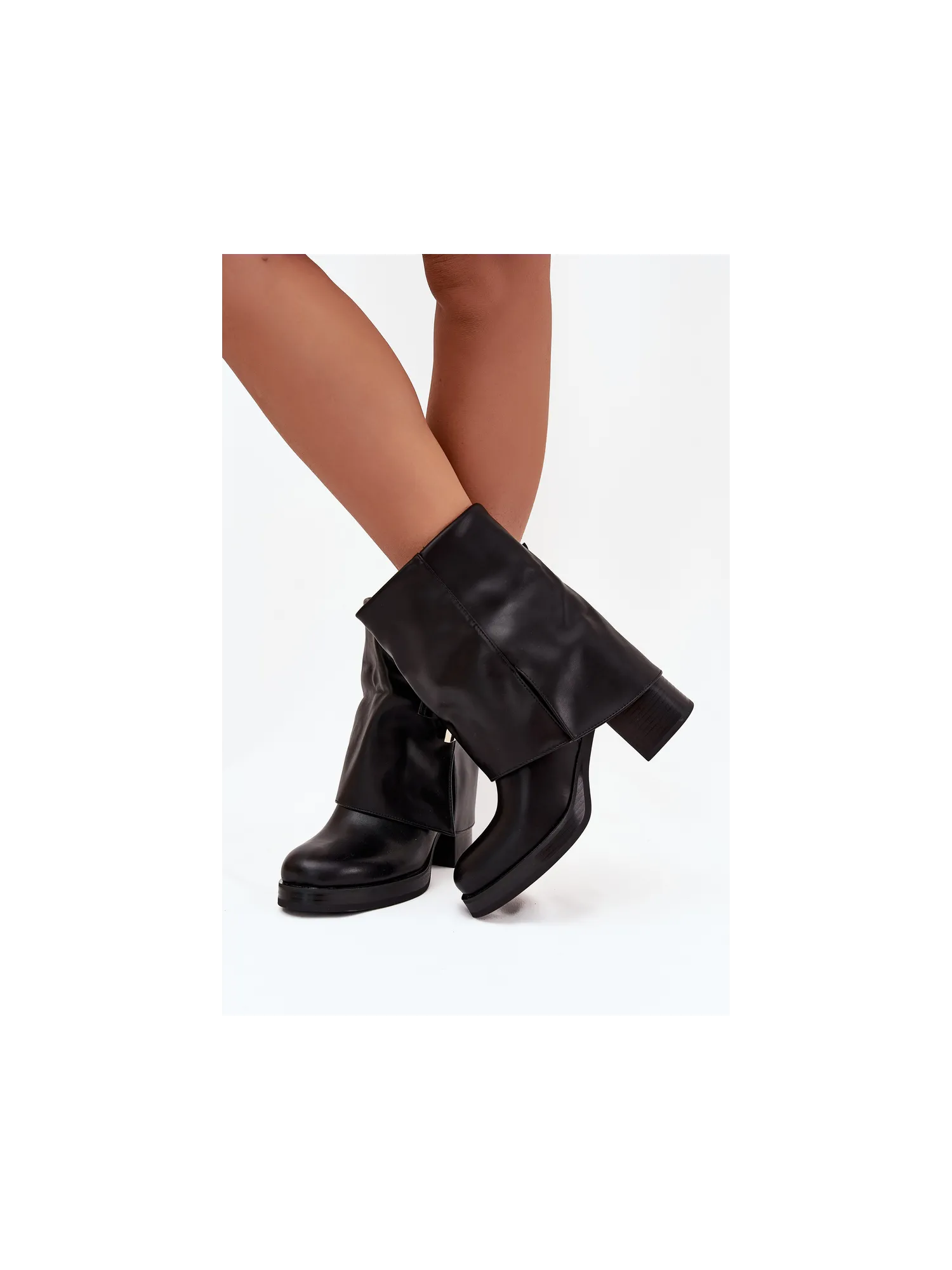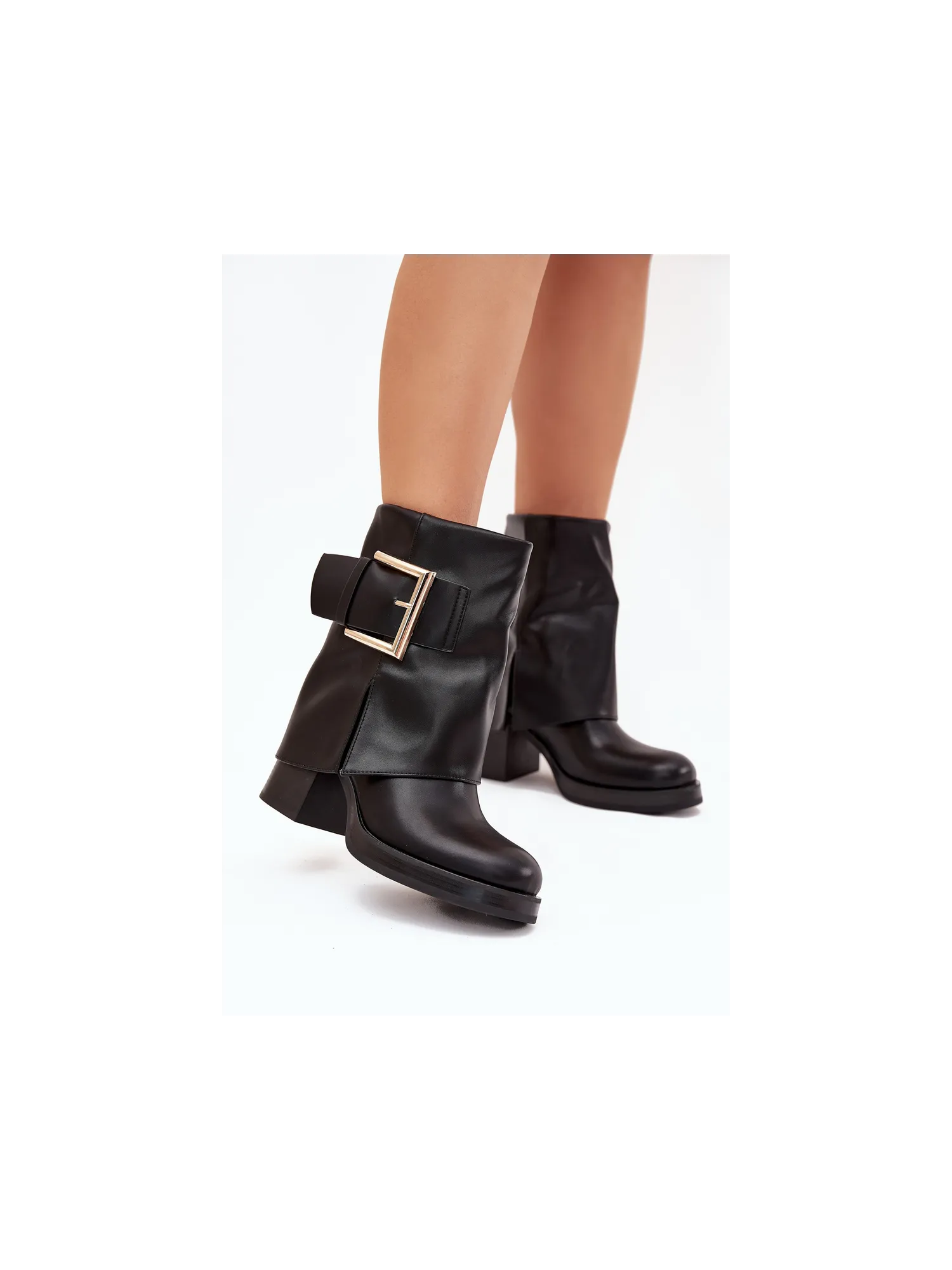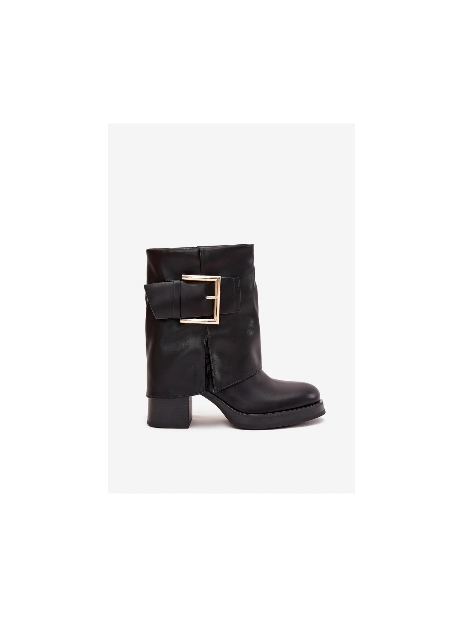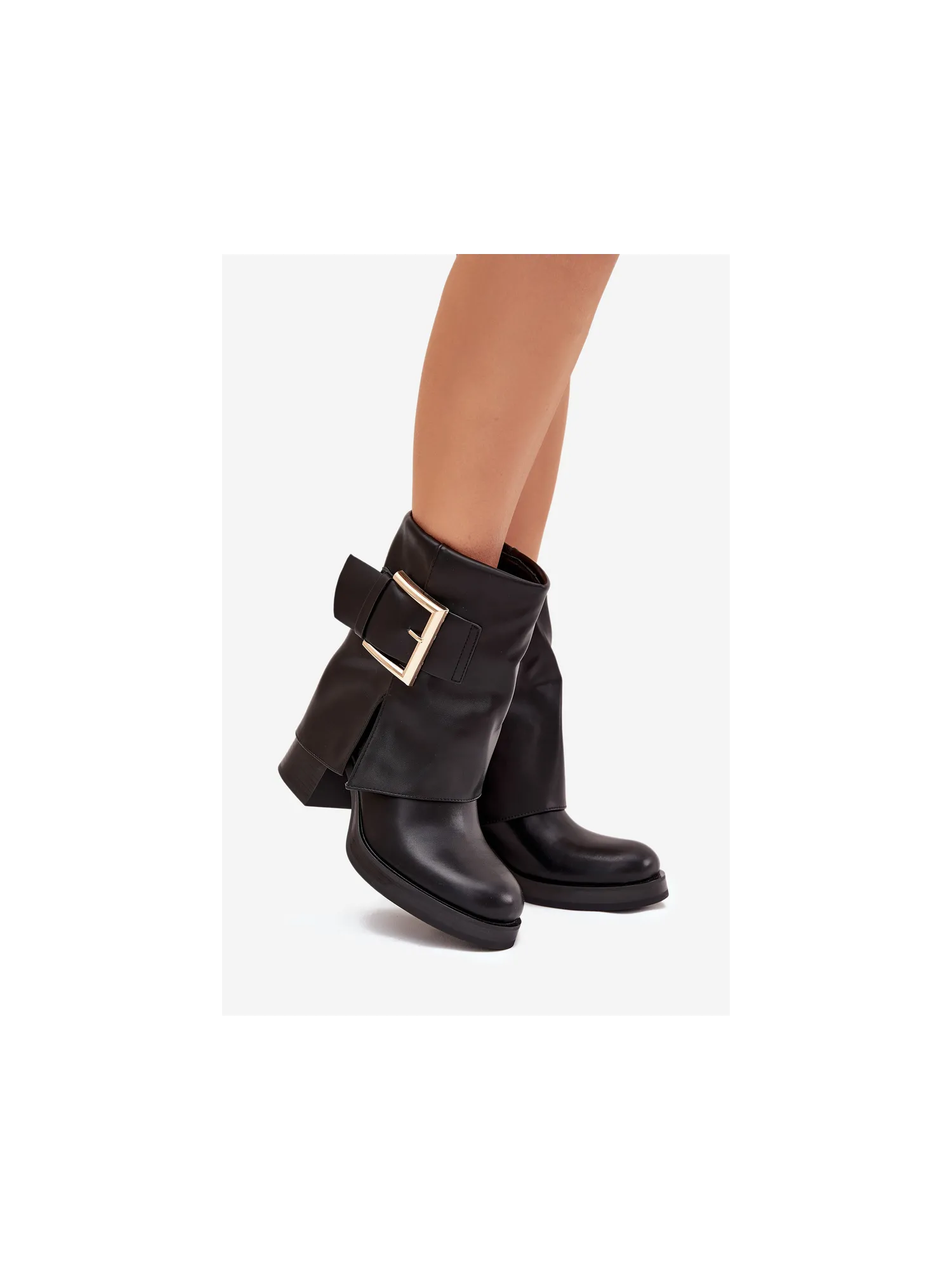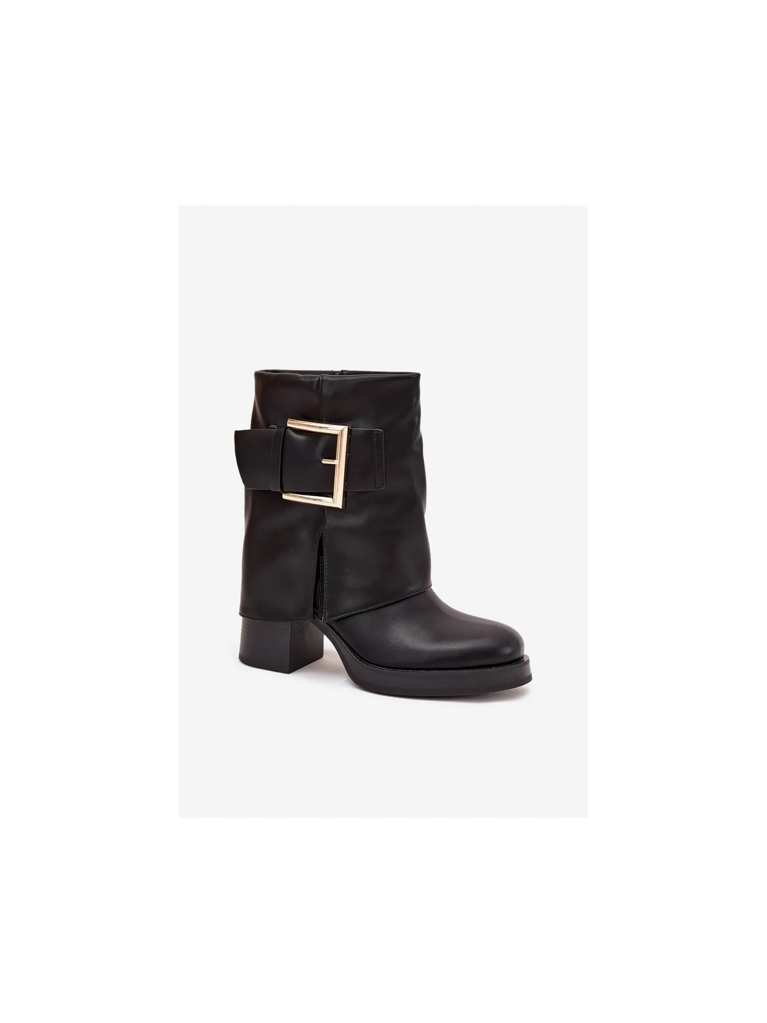 Women's ankle boots made of eco-leather, set on a block heel, are a stylish option for cooler days. The slip-on model, with warm lining, ensures comfort and warmth. They feature an elegant golden buckle that adds a unique character, while the rounded toes guarantee comfort throughout the day. Perfect for everyday styling, they pair beautifully with dresses, skirts, or trousers. When choosing a size, please refer to the size chart.