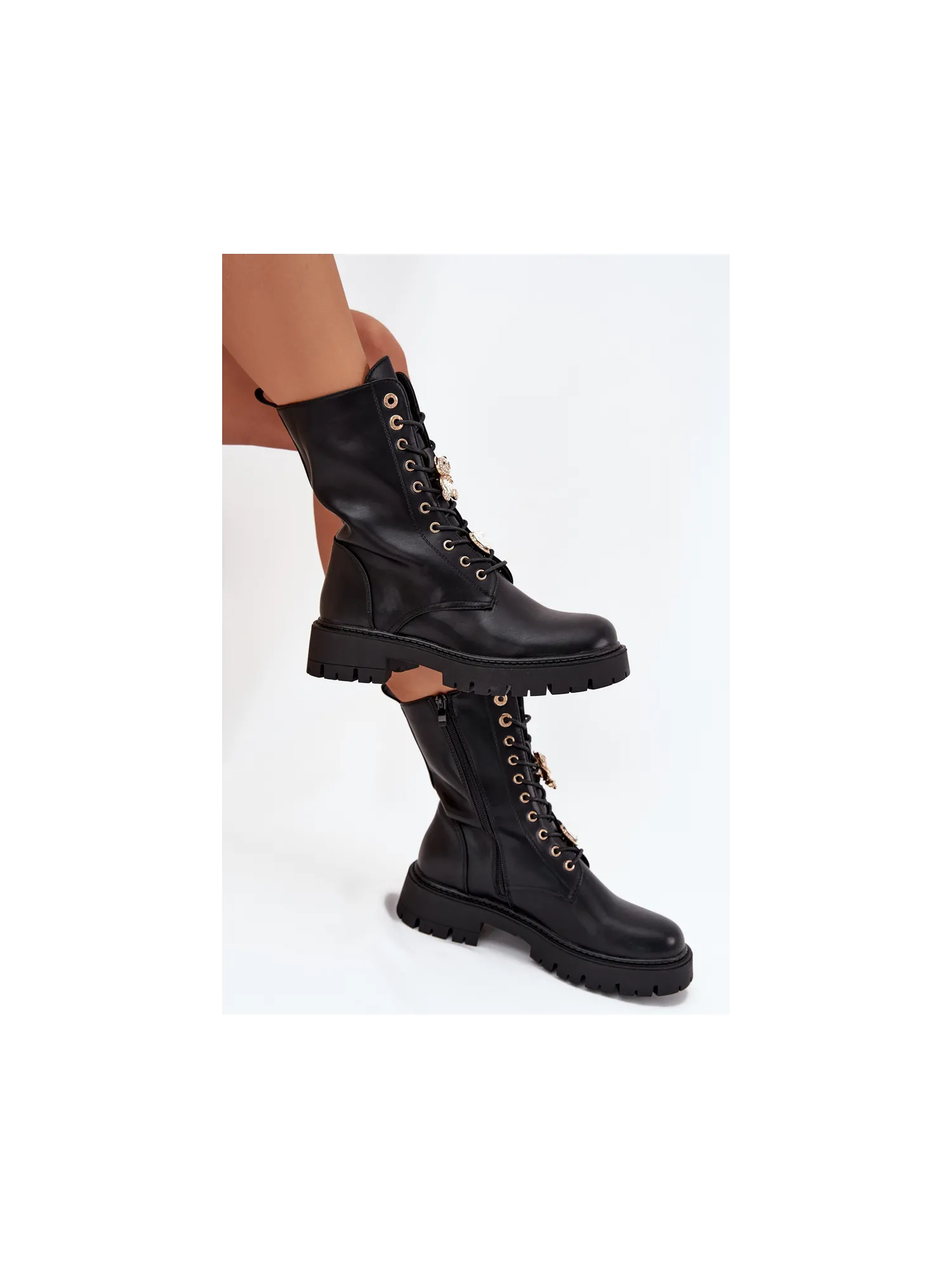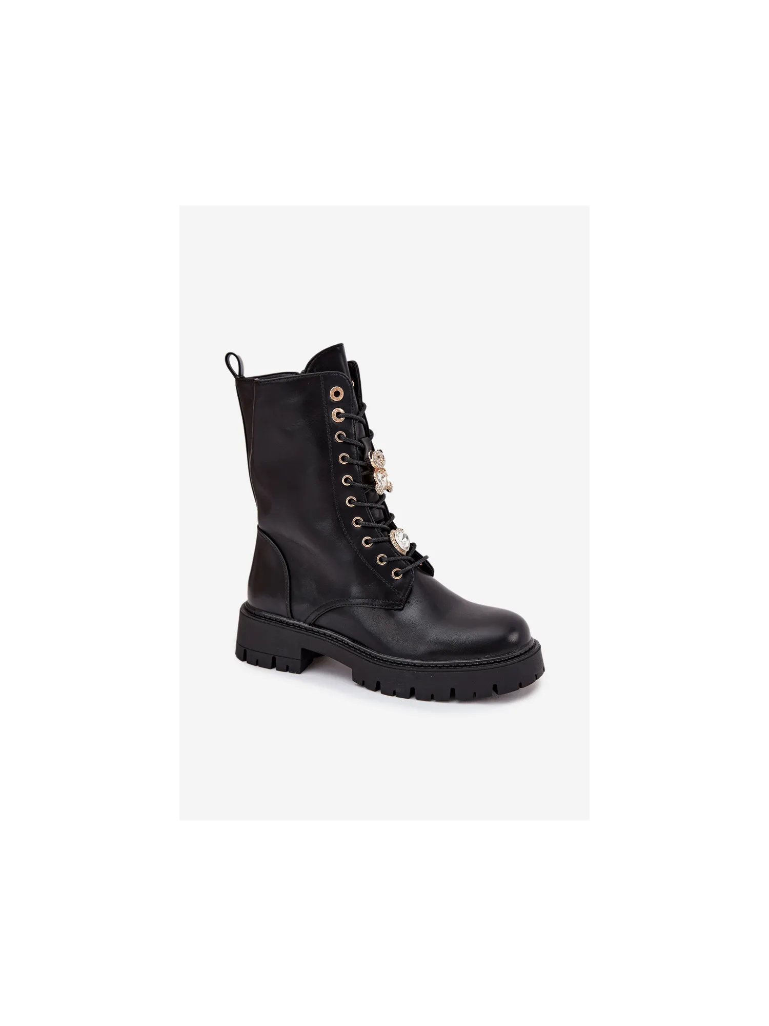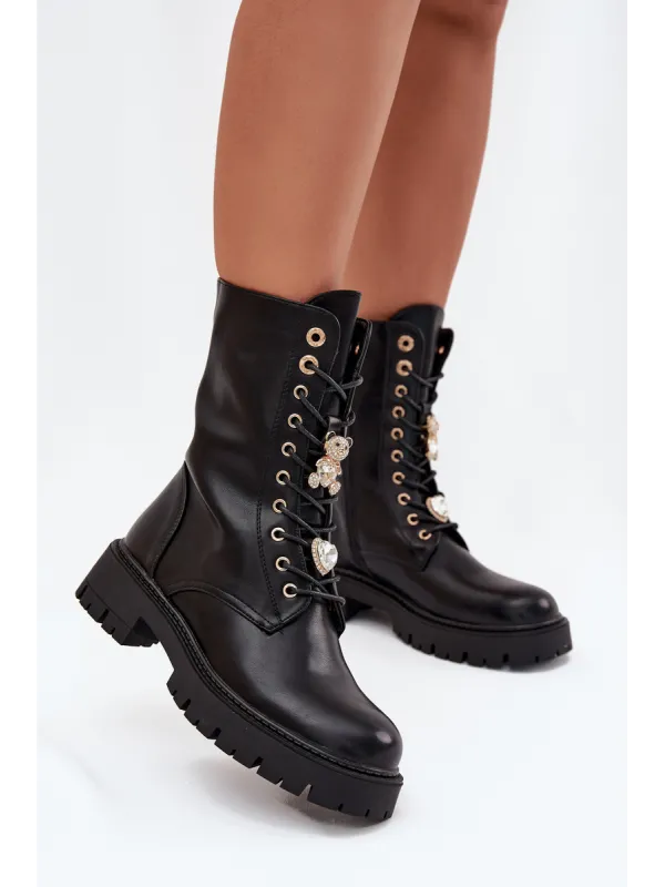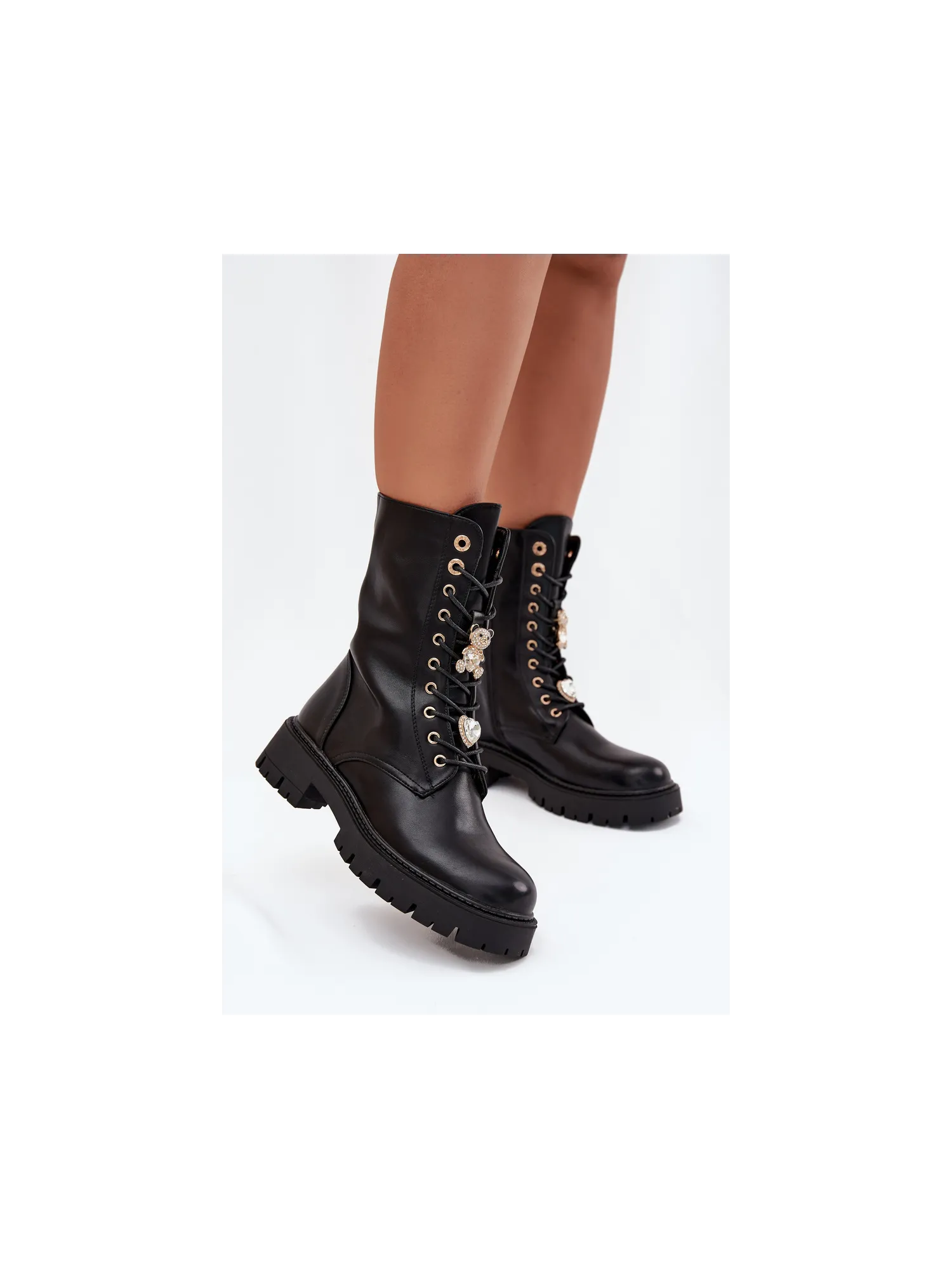 Women's ankle boots made of eco-leather are a combination of style and comfort for cooler days. The laced model with an additional zipper makes it easy to put on and adjust to the foot. The inside is insulated with shoe fleece, providing warmth even on freezing days. There are cute charms in the shape of a bear and a heart on the laces, adding a unique, fashionable touch to the boots. Perfect for everyday outings. When choosing a size, please refer to the size chart. When choosing a size, please refer to the size chart.