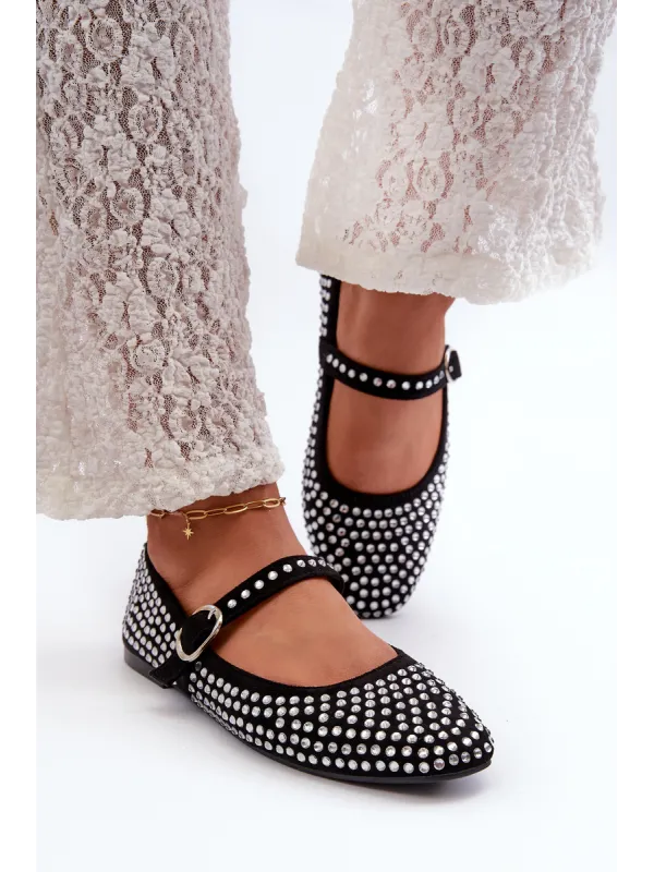 Ballerinas made of eco suede decorated with numerous jet stones. Fastened with an adjustable strap that provides stability and comfort when wearing. These ballerinas are an excellent choice for any occasion. They certainly add shine to any outfit. When choosing a size, please refer to the size chart.