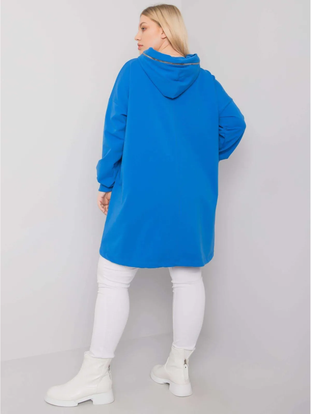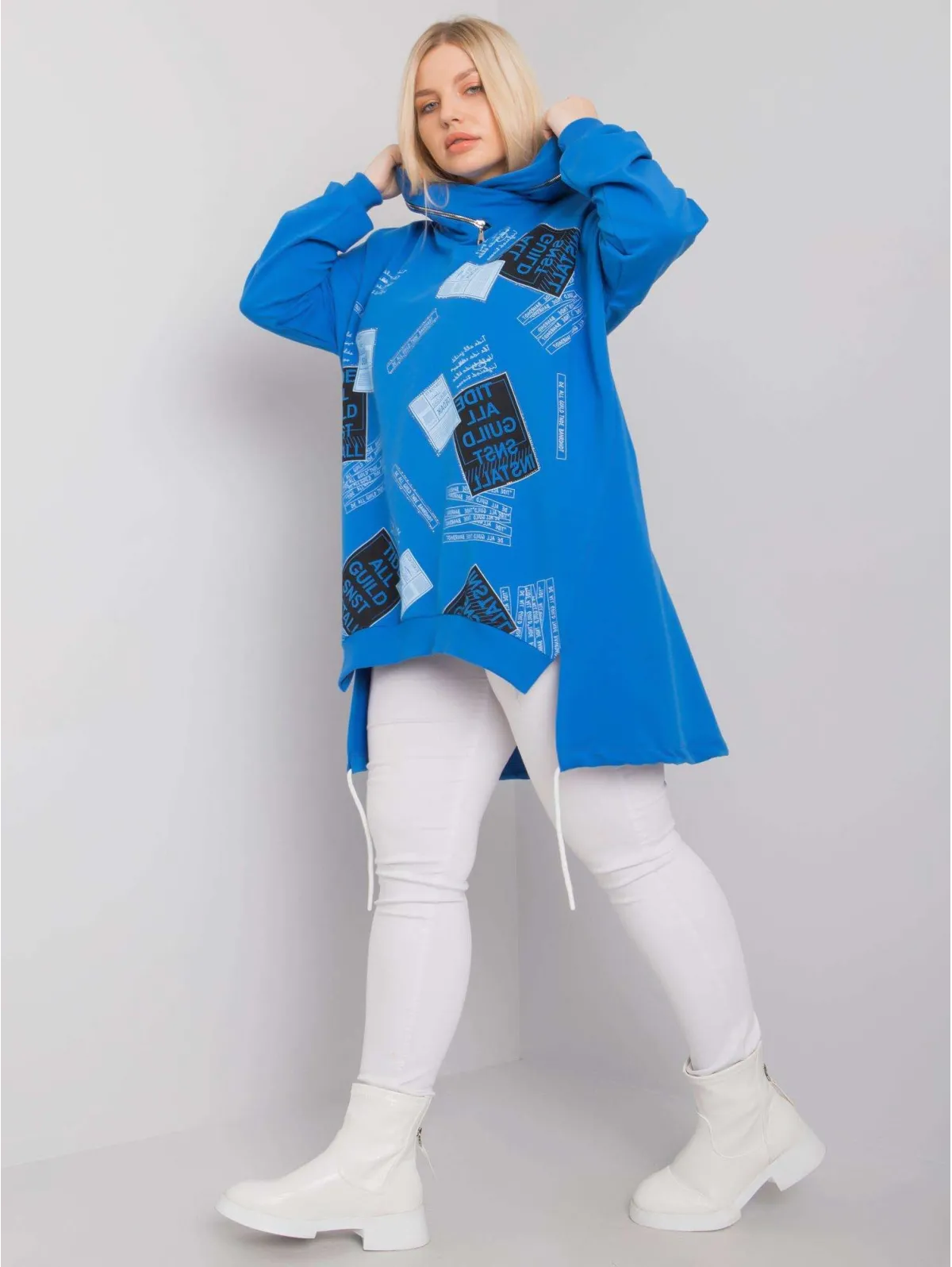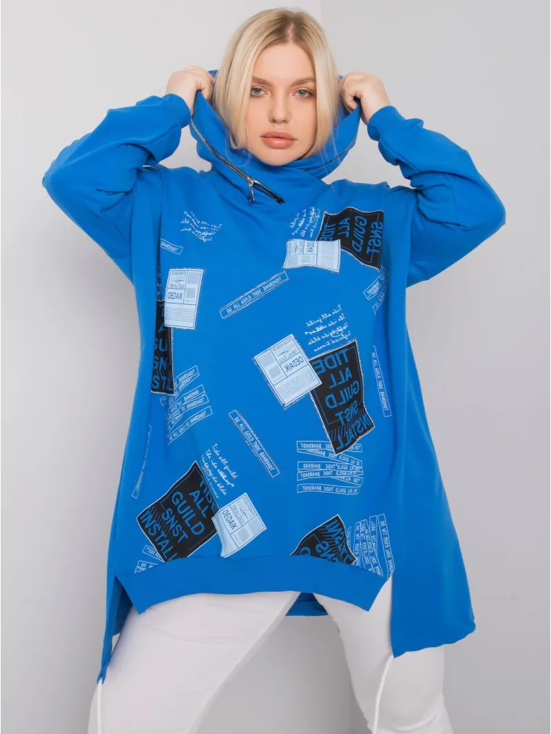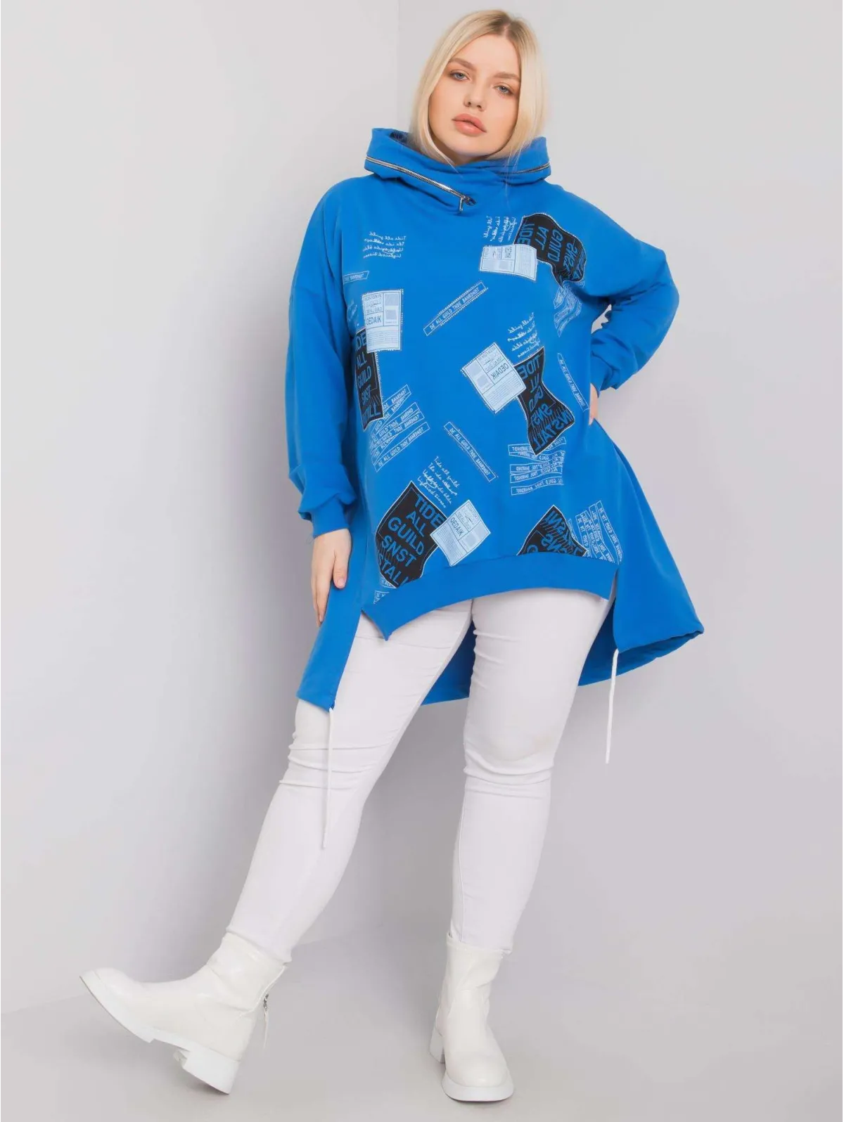 Ciemnoniebieska bluza plus size z nadrukiem i aplikacją.