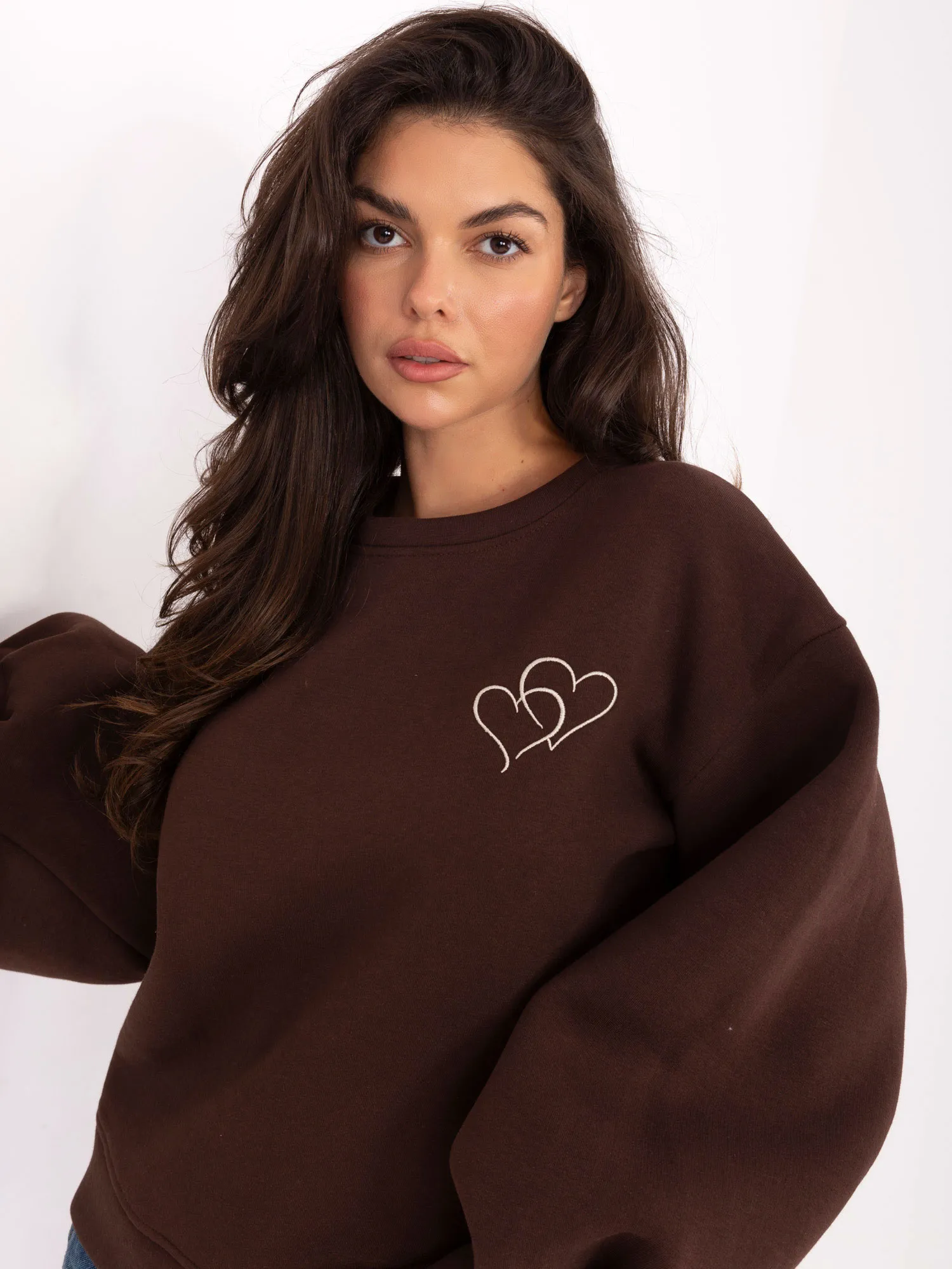 Wymiary bluzy w rozmiarze one size mierzone na płasko: szerokość pod pachami - 59 cm, długość rękawa - 59 cm (od szwu), szerokość w biodrach - 52 cm, długość całkowita - 66 cm.