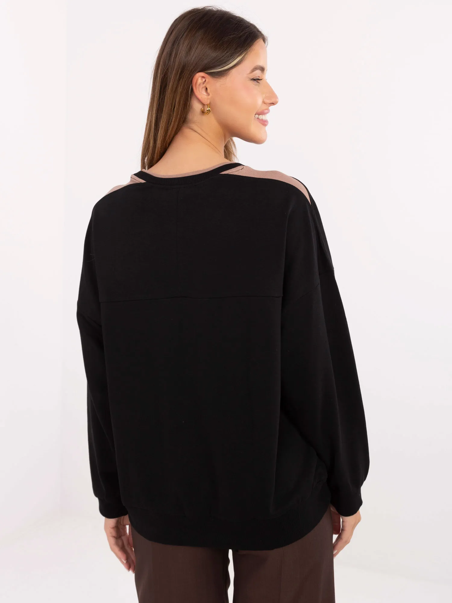 Wymiary bluzy w rozmiarze one size mierzone na płasko: szerokość pod pachami - 64 cm, długość rękawa - 46 cm, szerokość w biodrach - 52 cm, długość całkowita - 68 cm.
