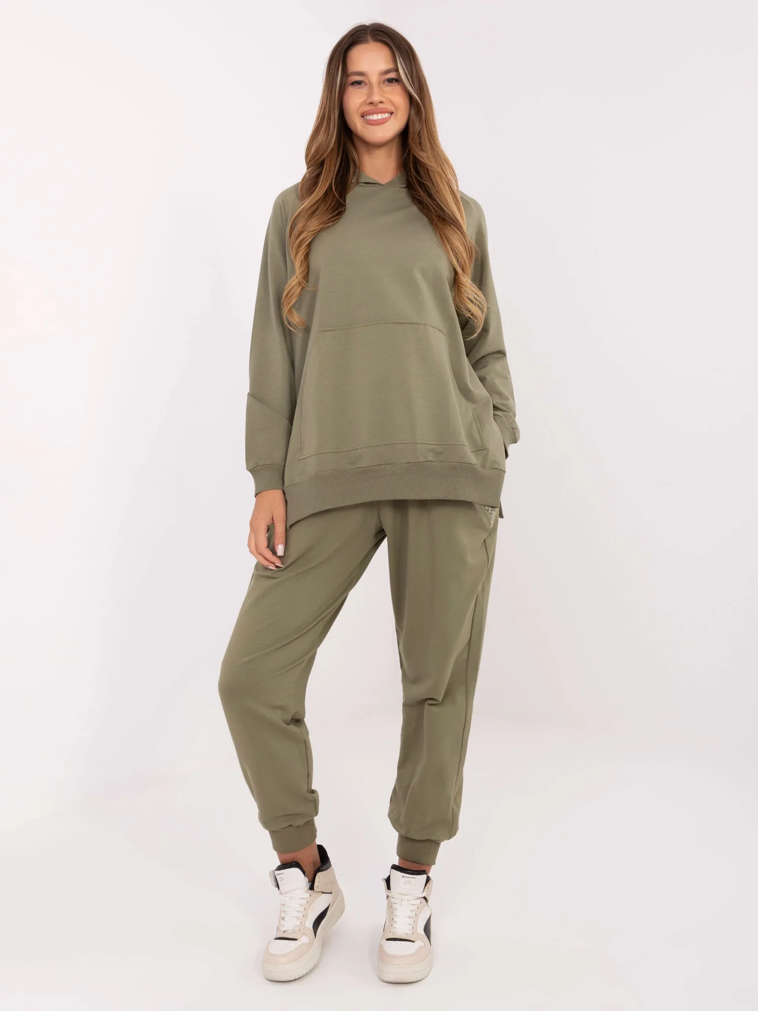 Wymiary bluzy w rozmiarze one size mierzone na płasko: szerokość pod pachami - 63 cm, szerokość w biodrach - 57 cm, długość rękawa - 70 cm (od szwu), długość całkowita - 75 cm.