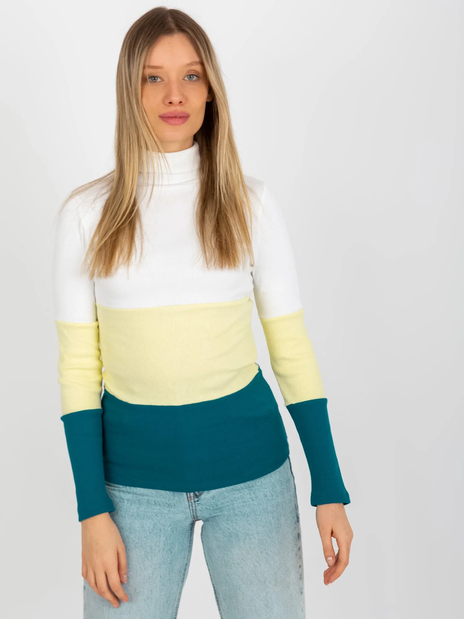 Ecru-jasnożółta prążkowana bluzka basic z golfem w prążek .