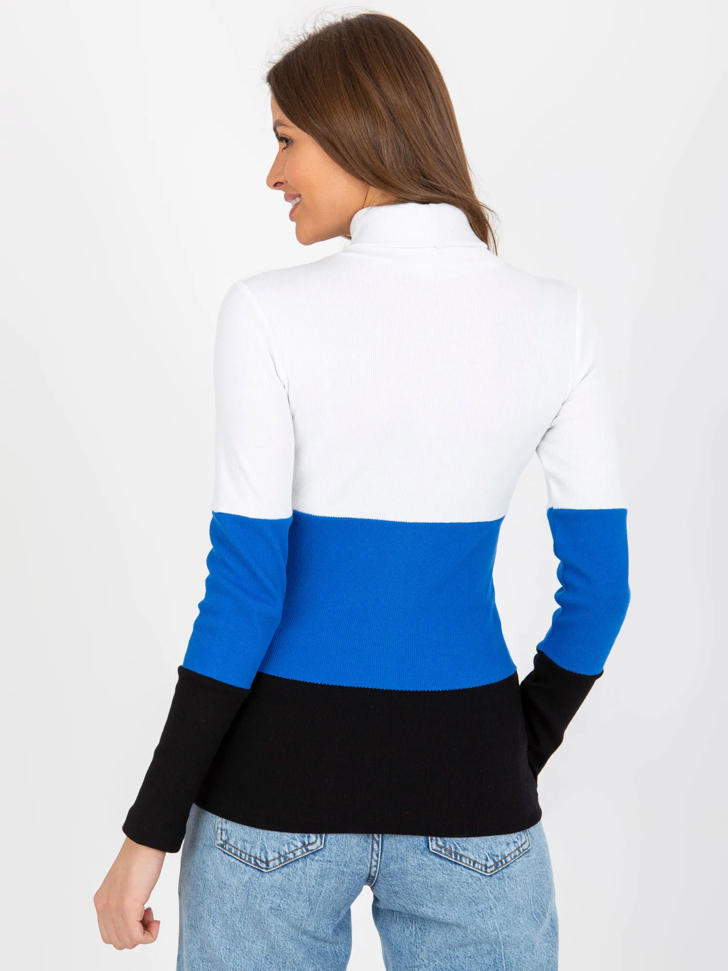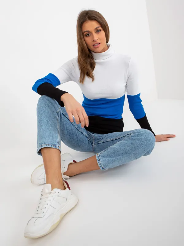 Ecru-ciemnoniebieska bluzka basic z golfem w prążek .