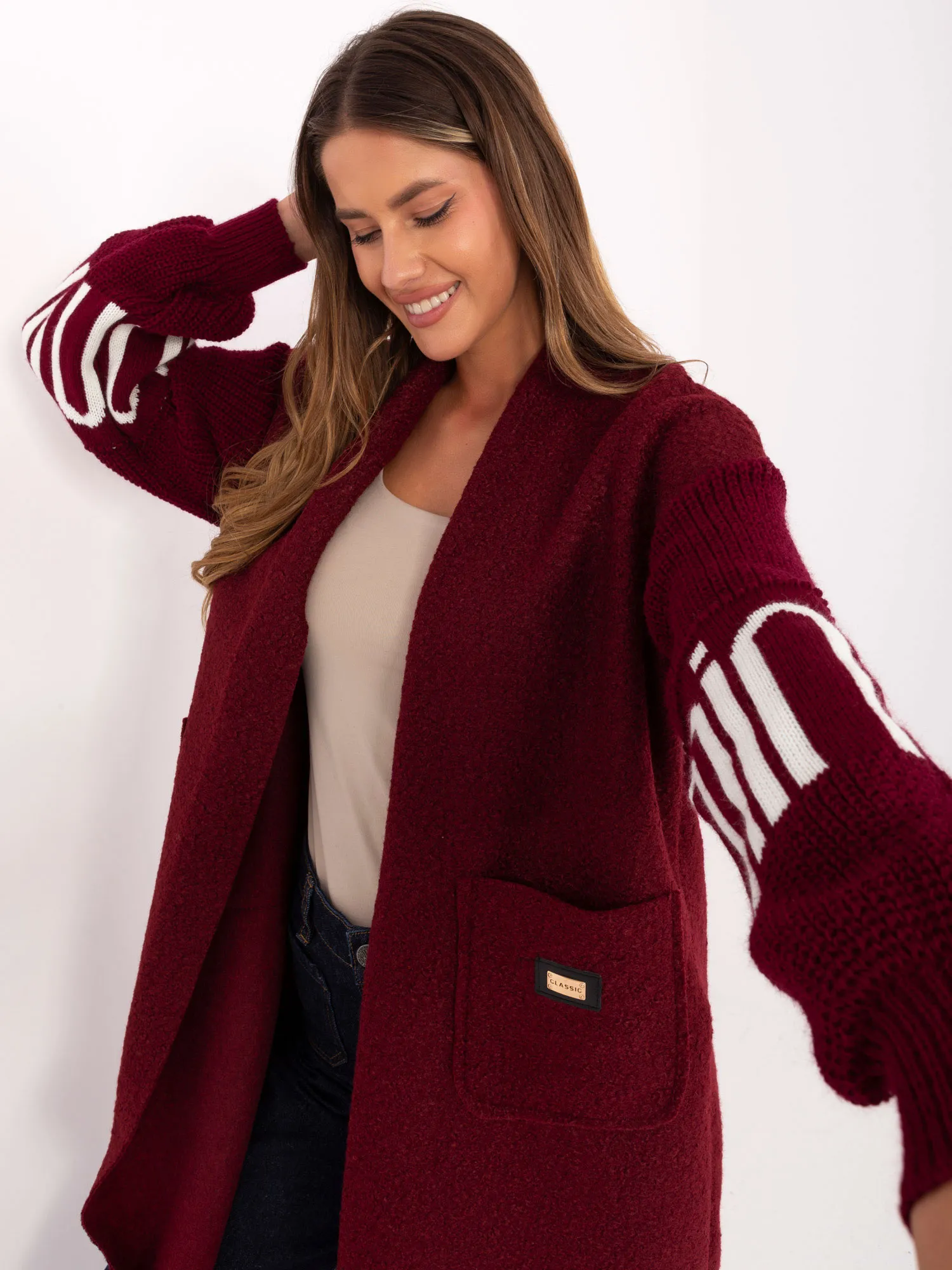 Wymiary kardiganu w rozmiarze one size: szerokość pod pachami - 63 cm, długość całkowita - 98 cm, długość rękawa - 55 cm (od szwu), szerokość w biodrach - 68 cm.