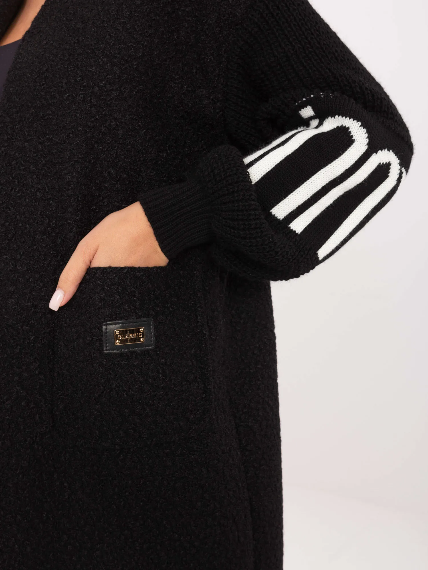 Wymiary kardiganu w rozmiarze one size: szerokość pod pachami - 63 cm, długość całkowita - 98 cm, długość rękawa - 55 cm (od szwu), szerokość w biodrach - 68 cm.