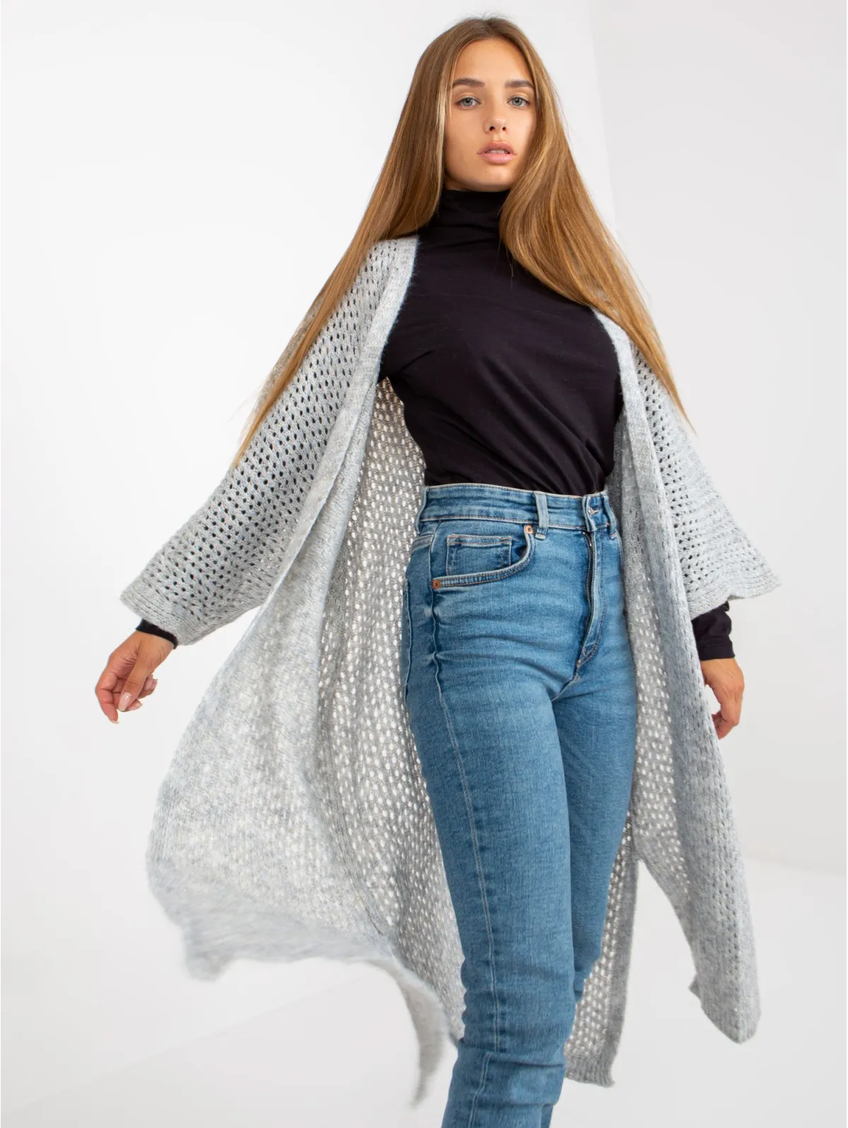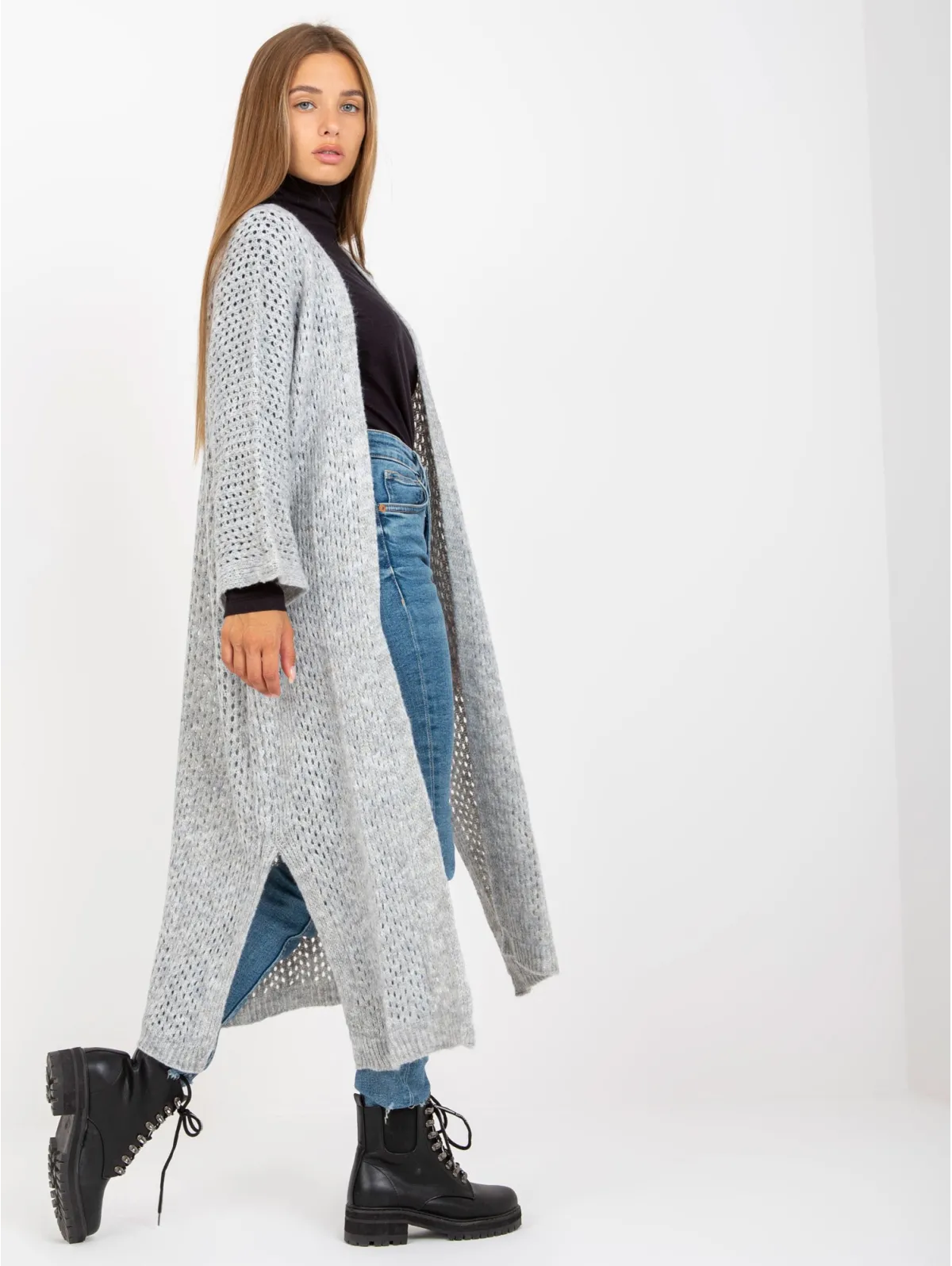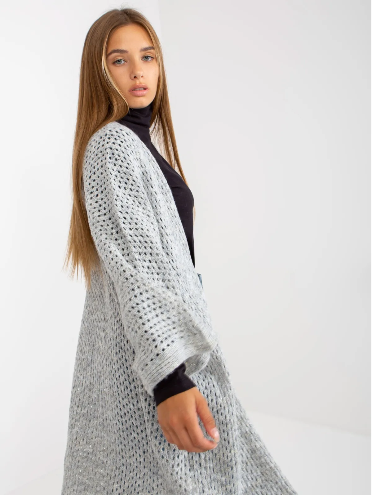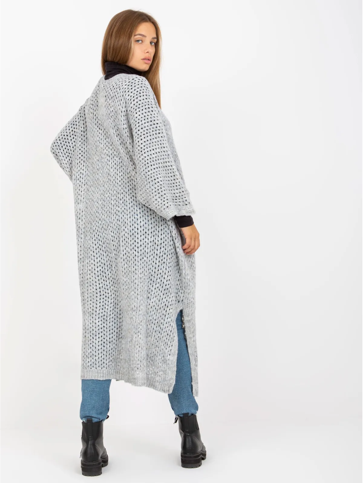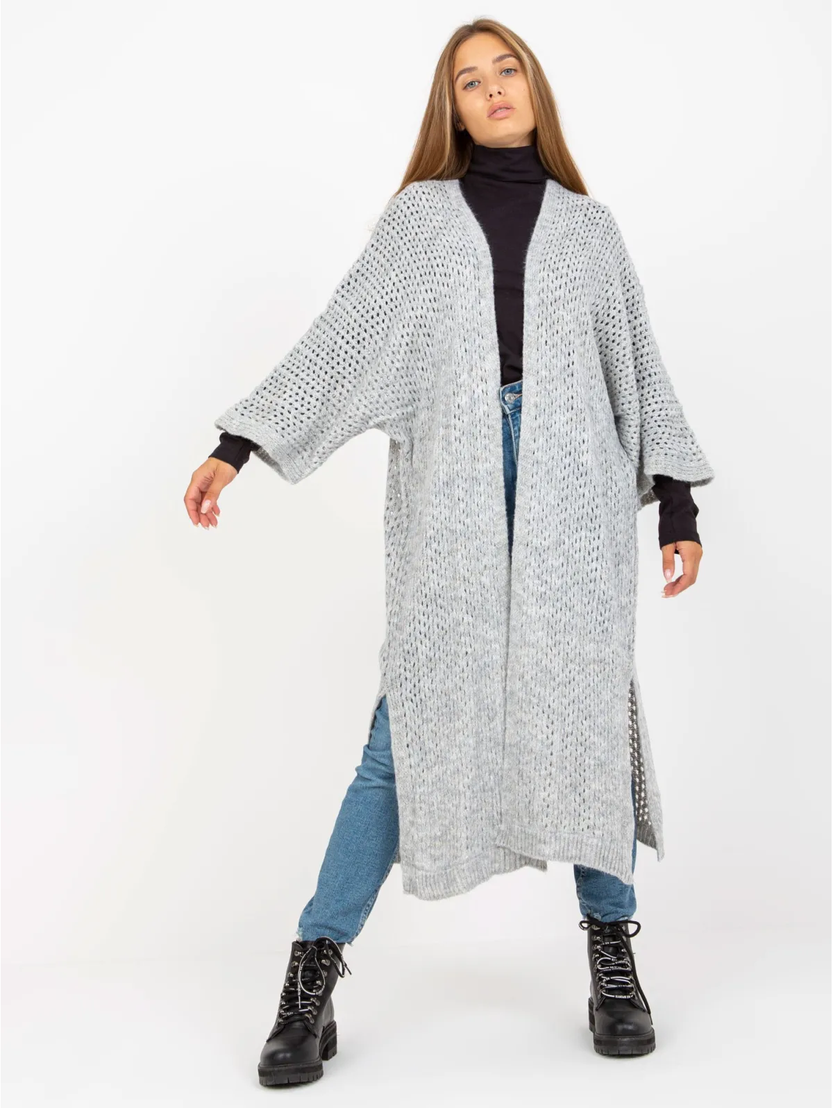 Kardigano one size dydžio išmatavimai: krūtinė - 74 cm, bendras ilgis - 107 cm, rankovių ilgis - 50 cm.