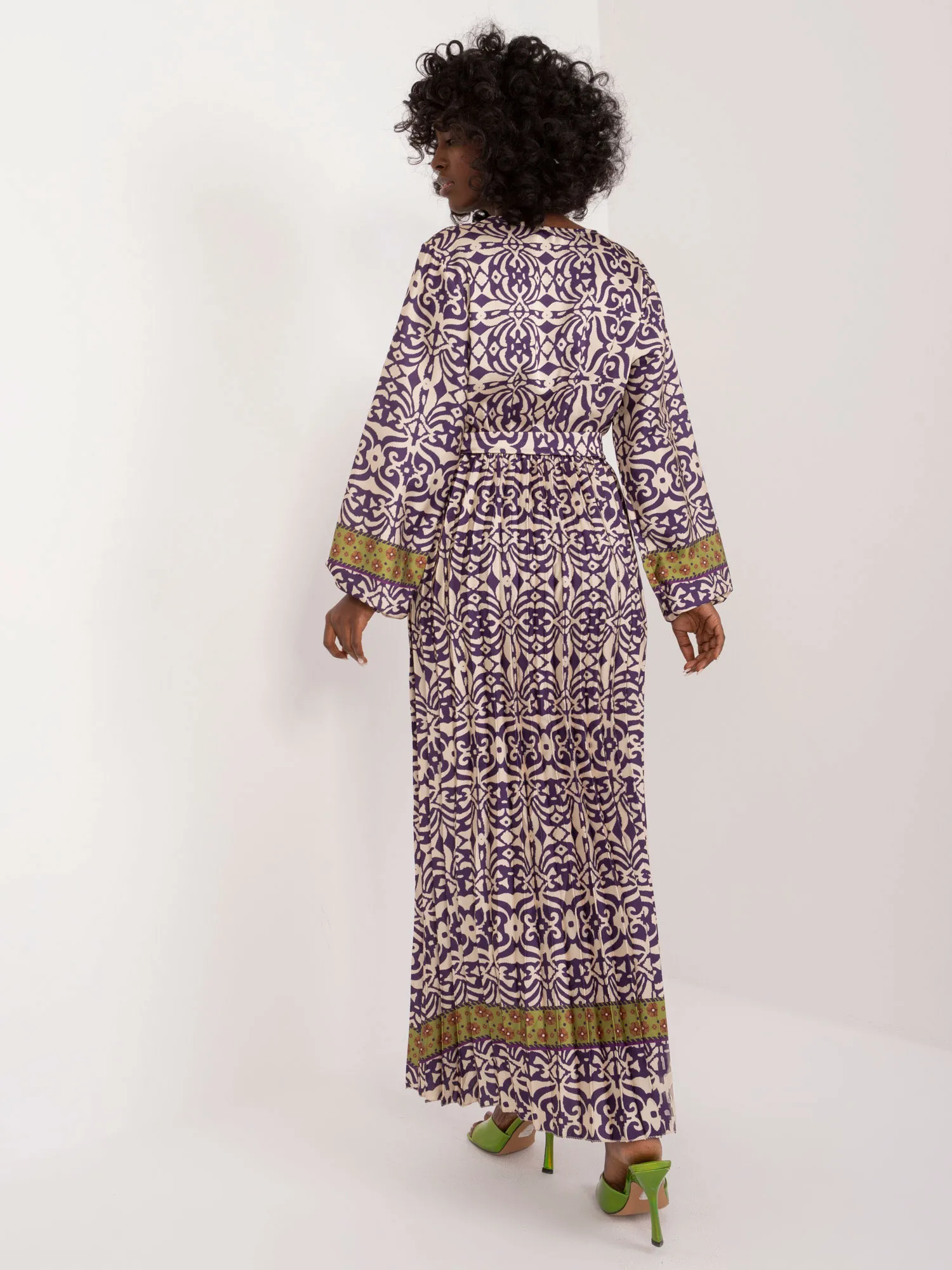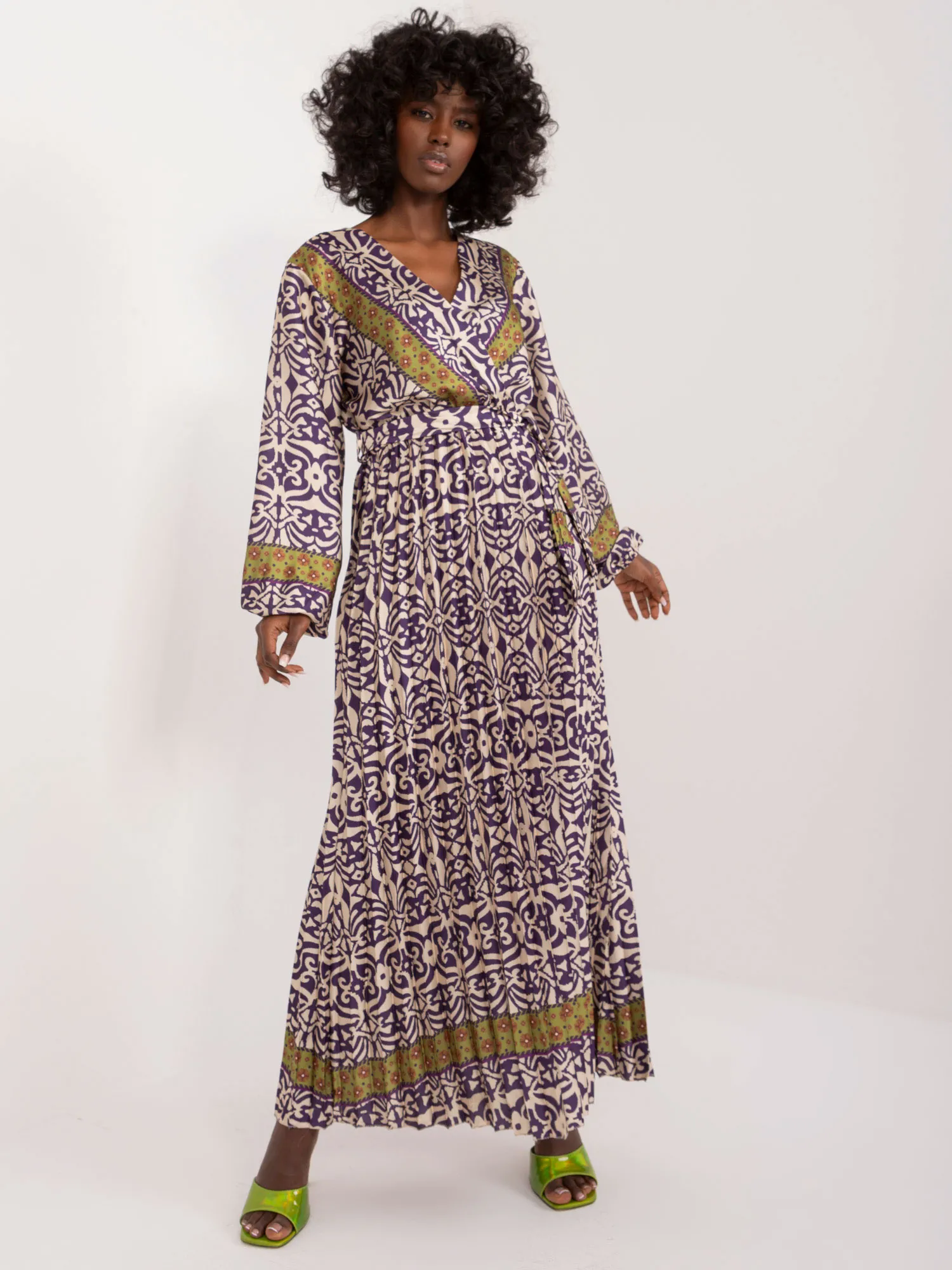 Wymiary sukienki w rozmiarze one size mierzone na płasko: szerokość pod pachami - 39 cm, długość rękawa - 57 cm, długość całkowita - 136 cm.
