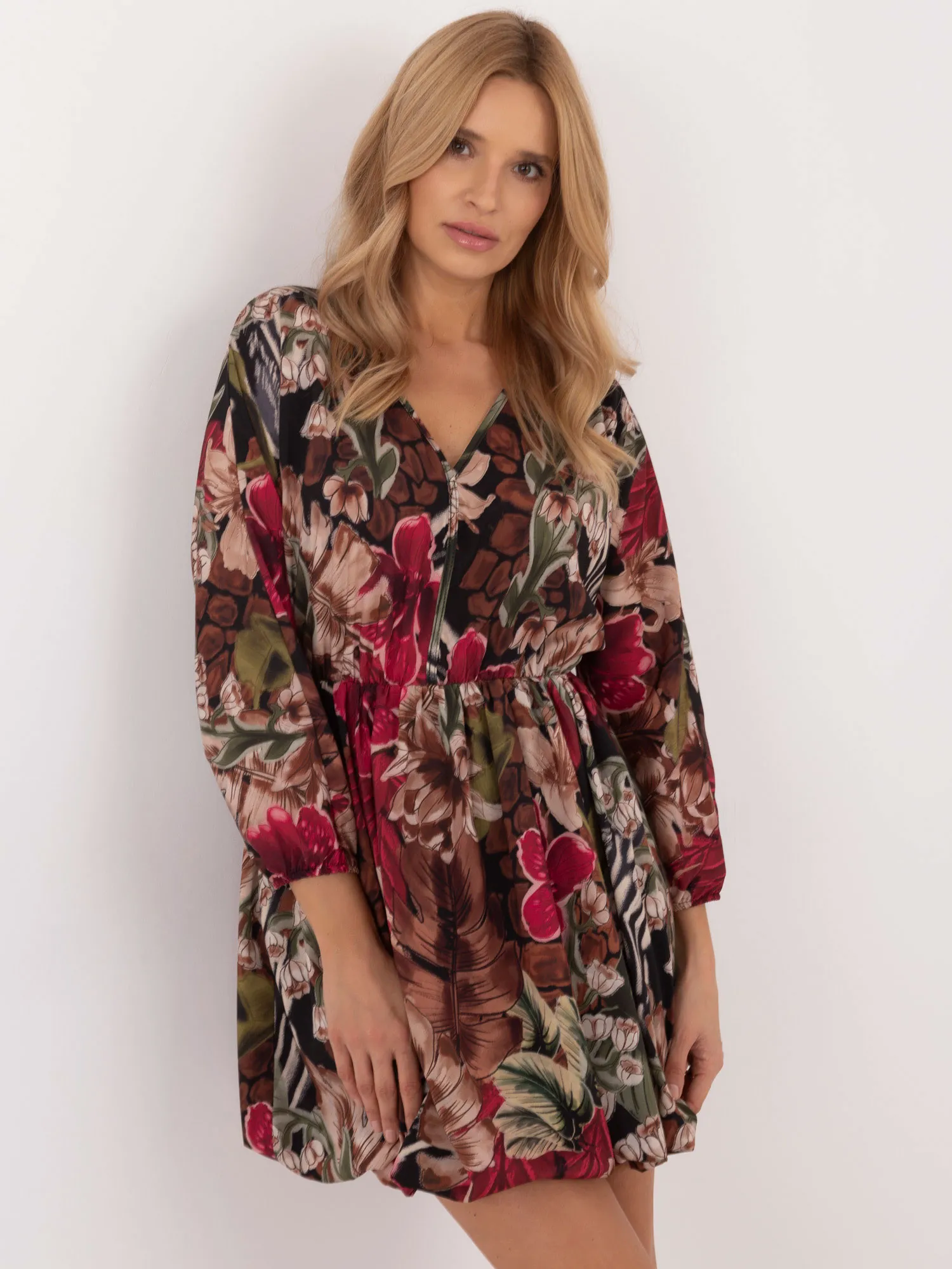 Wymiary sukienki w rozmiarze one size mierzone na płasko: szerokość pod pachami - 54 cm, długość całkowita - 84 cm, długość rękawa - 52 cm.