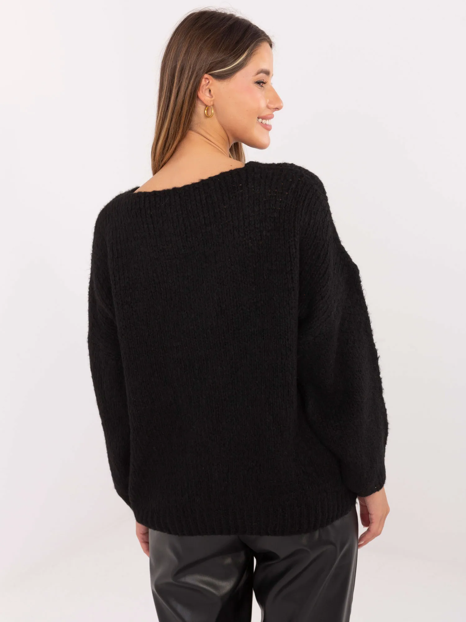 Wymiary swetra w rozmiarze one size: szerokość pod pachami - 68 cm, długość całkowita - 69 cm, długość rękawa - 44 cm (od szwu), szerokość w biodrach - 51 cm.
