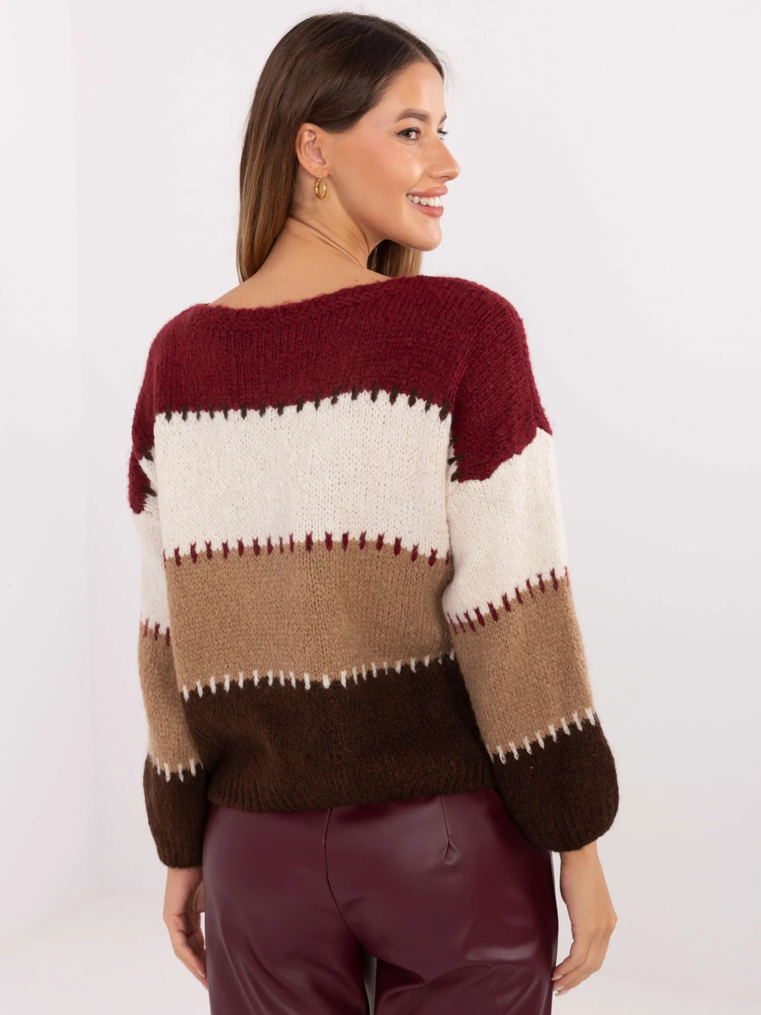 Wymiary swetra w rozmiarze one size: szerokość pod pachami - 56 cm, długość rękawa - 41 cm (od szwu), szerokość w biodrach - 47 cm, długość całkowita - 56 cm.