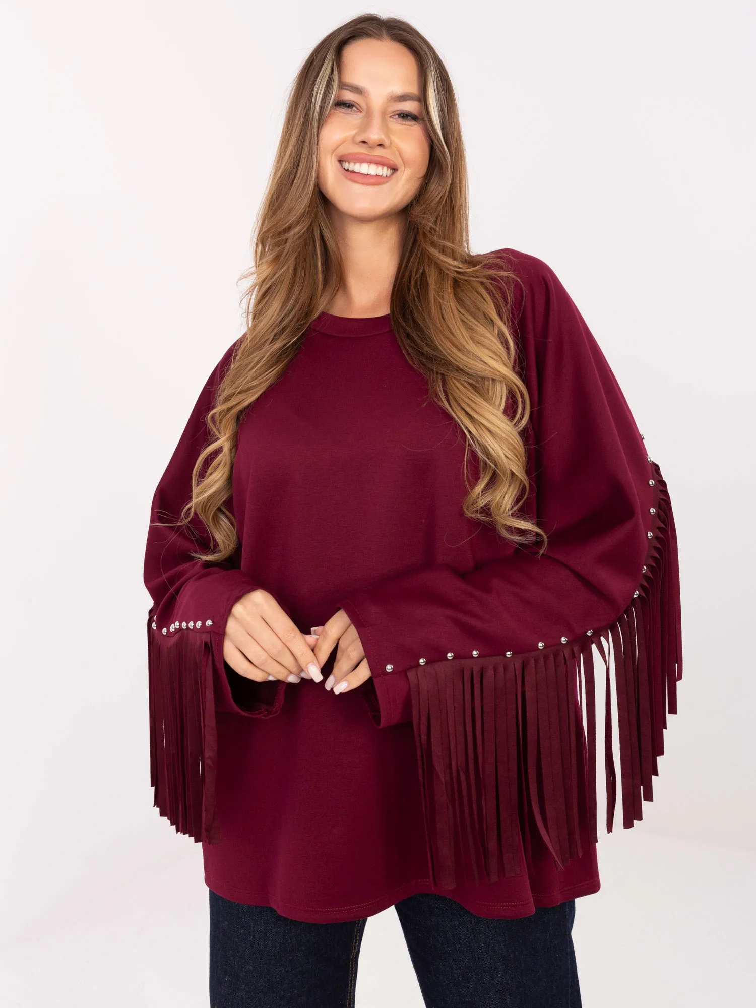 Wymiary bluzy w rozmiarze one size mierzone na płasko: szerokość bluzy pod pachami - 65 cm długość rękawa - 75 cm (od szwu), szerokość w biodrach - 69 cm, długość bluzy - 74 cm .