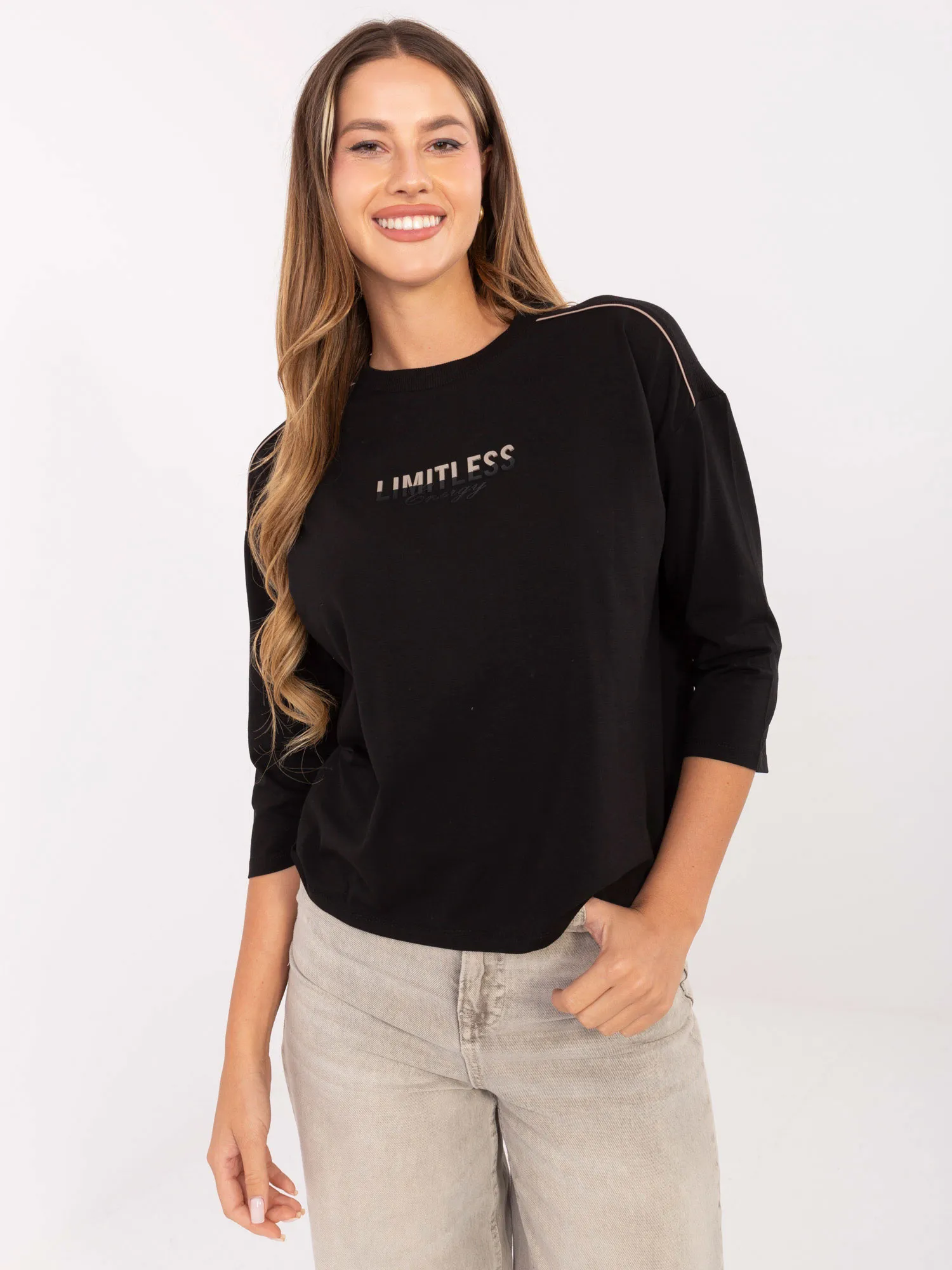 Wymiary bluzki w rozmiarze one size mierzone na płasko: szerokość pod pachami - 57 cm długość rękawa - 36 cm (od szwu), szerokość w biodrach - 53 cm, długość całkowita - 60 cm.