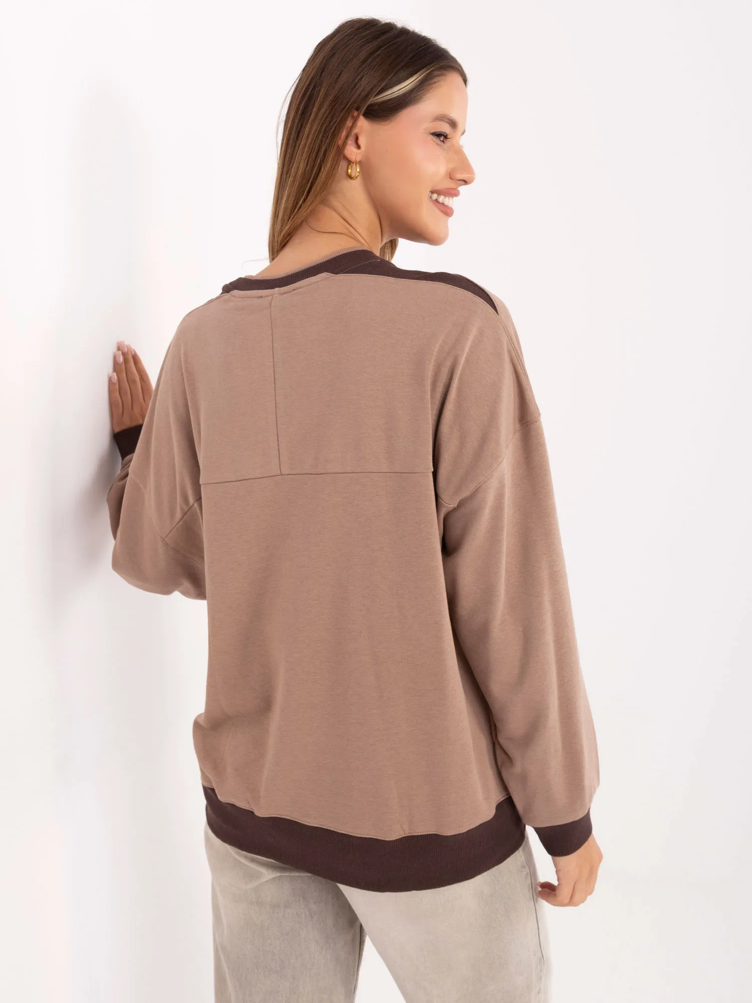 Wymiary bluzy w rozmiarze one size mierzone na płasko: szerokość pod pachami - 67 cm długość rękawa - 49 cm (od szwu), szerokość w biodrach - 54 cm, długość całkowita - 71 cm.