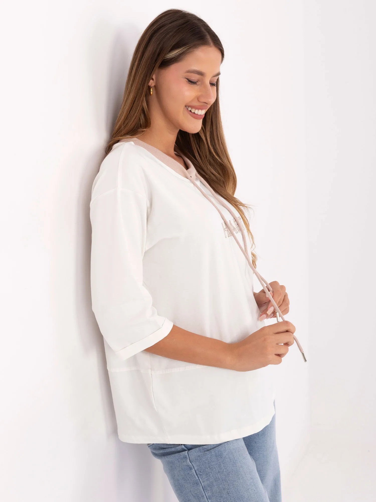 Wymiary bluzki w rozmiarze one size mierzone na płasko: szerokość pod pachami - 60 cm długość rękawa - 36 cm (od szwu), szerokość w biodrach - 58 cm, długość całkowita - 70 cm.