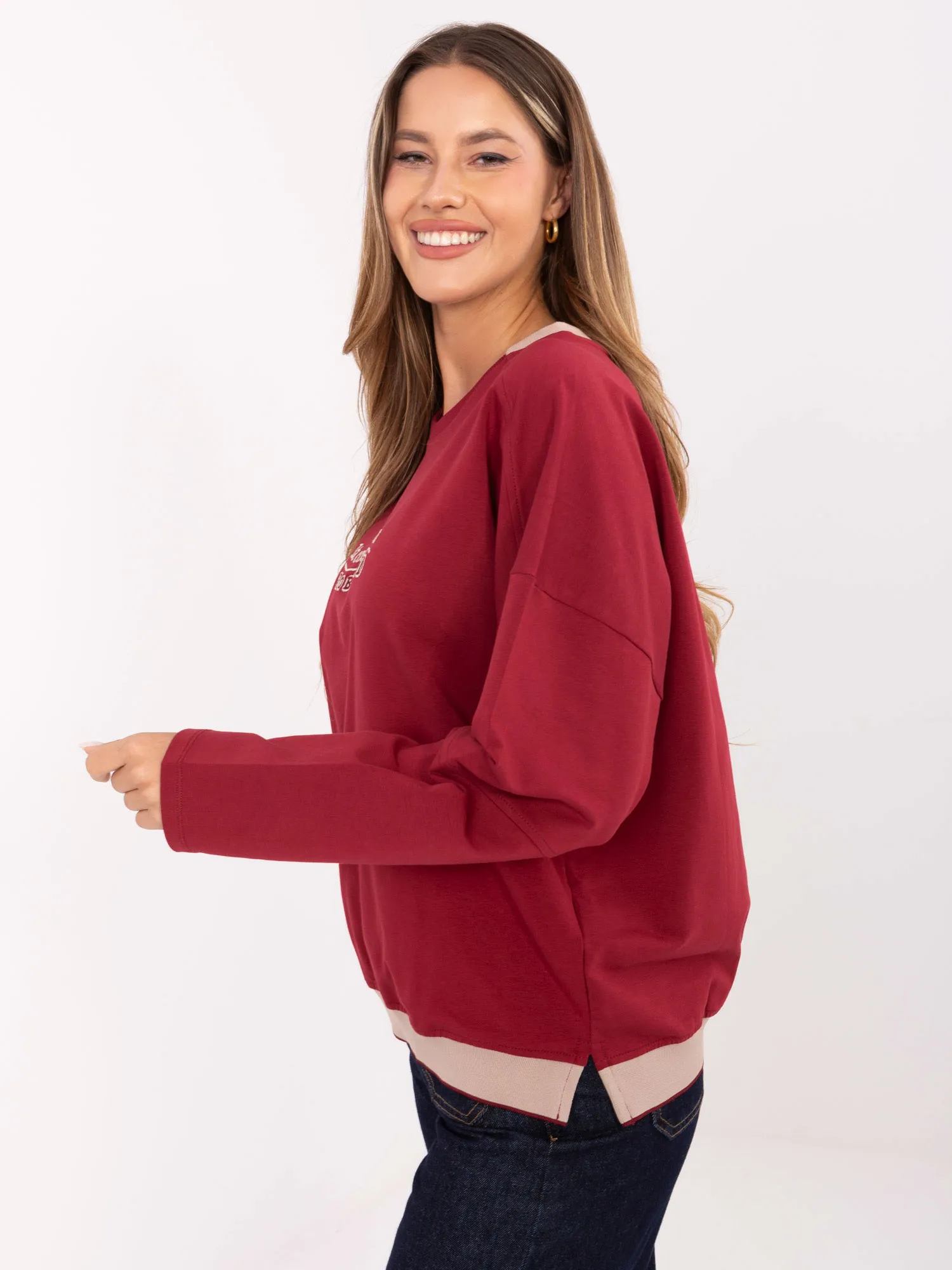 Wymiary bluzy w rozmiarze one size mierzone na płasko: szerokość bluzy pod pachami - 66 cm długość rękawa - 48 cm (od szwu), szerokość w biodrach - 52 cm, długość bluzy - 64 cm.
