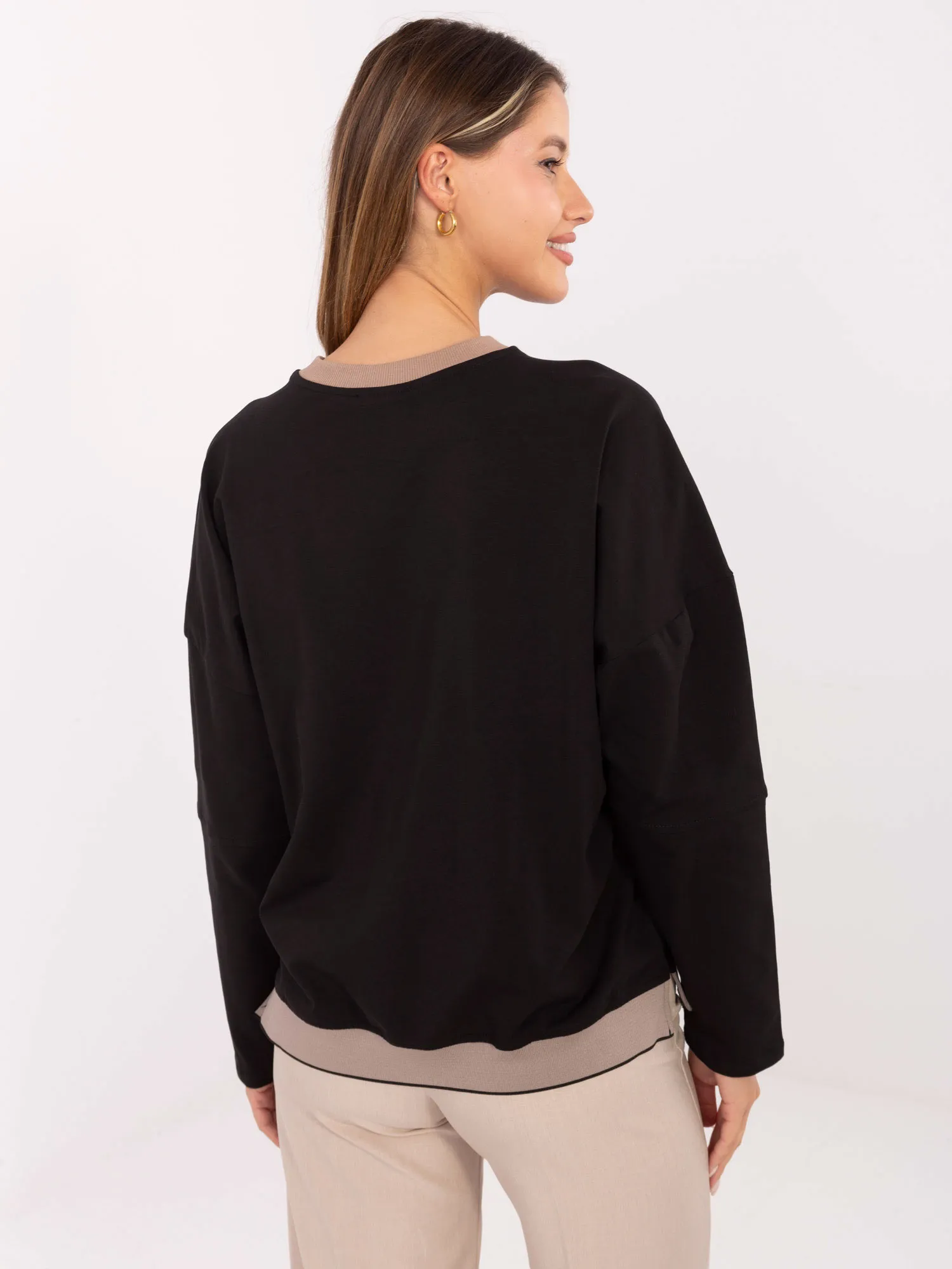Wymiary bluzy w rozmiarze one size mierzone na płasko: szerokość bluzy pod pachami - 66 cm długość rękawa - 48 cm (od szwu), szerokość w biodrach - 52 cm, długość bluzy - 64 cm.