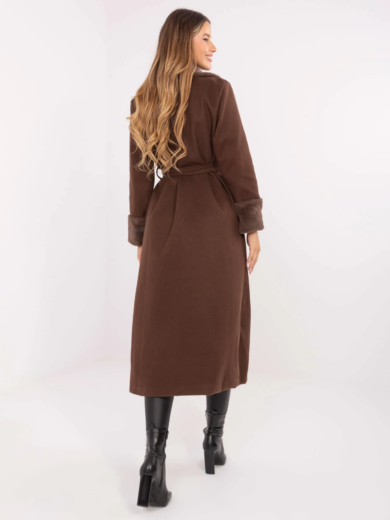 Wymiary płaszcza w rozmiarze one size mierzone na płasko: szerokość pod pachami - 60 cm, szerokość w talii - 57 cm, szerokość w biodrach - 58 cm, długość rękawa - 59 cm (od szwu), długość całkowita - 128 cm.