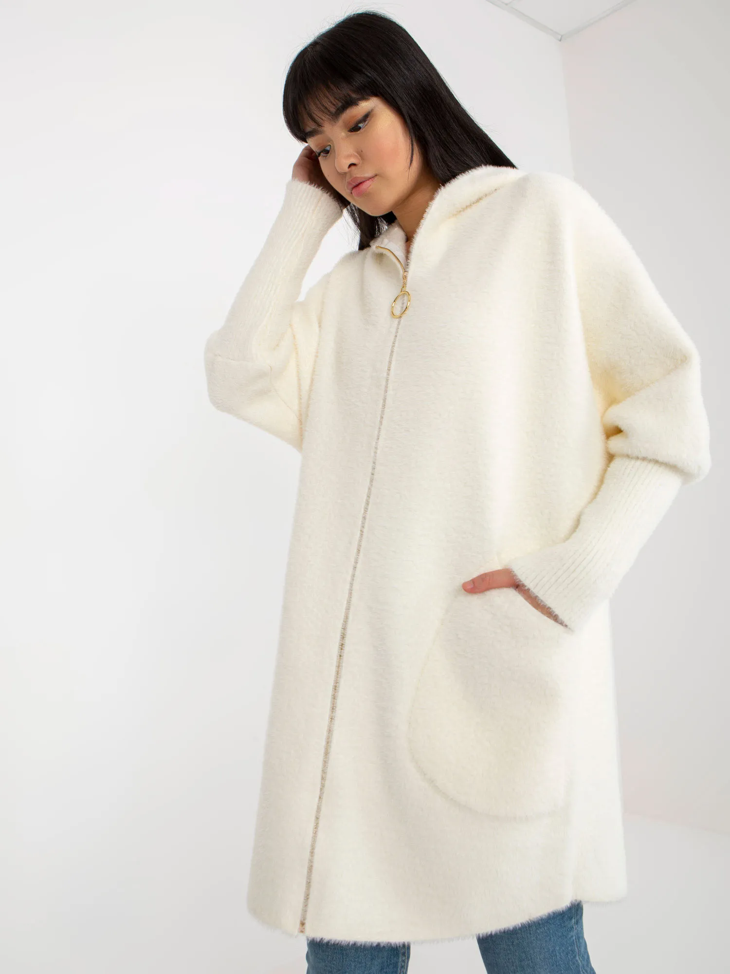 Ecru damski płaszcz alpaka z dodatkiem wełny .