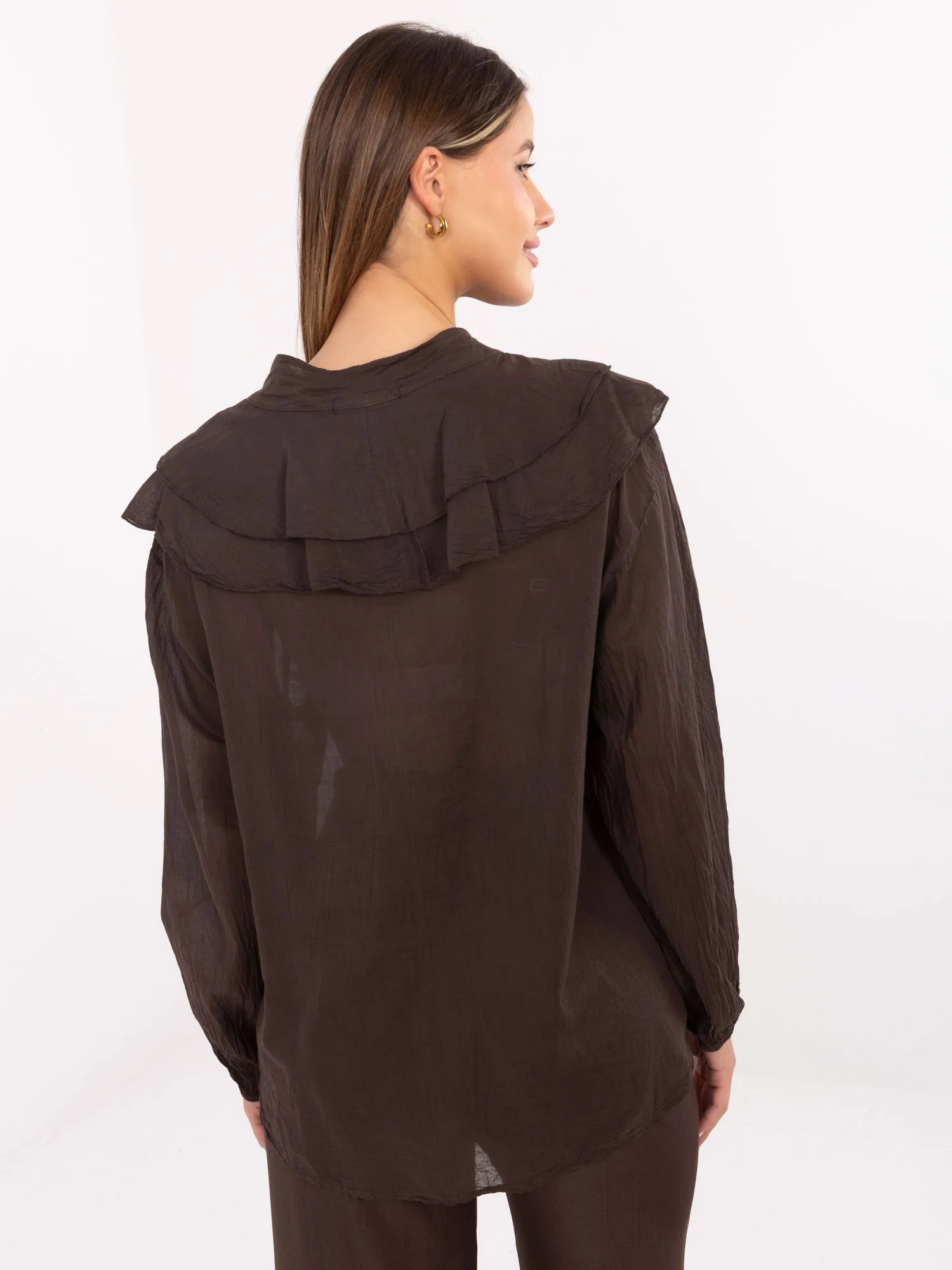 Wymiary bluzki w rozmiarze one size mierzone na płasko: szerokość pod pachami - 60 cm, długość rękawa - 56 cm (od szwu), szerokość w biodrach - 61 cm, długość całkowita - 67 cm.
