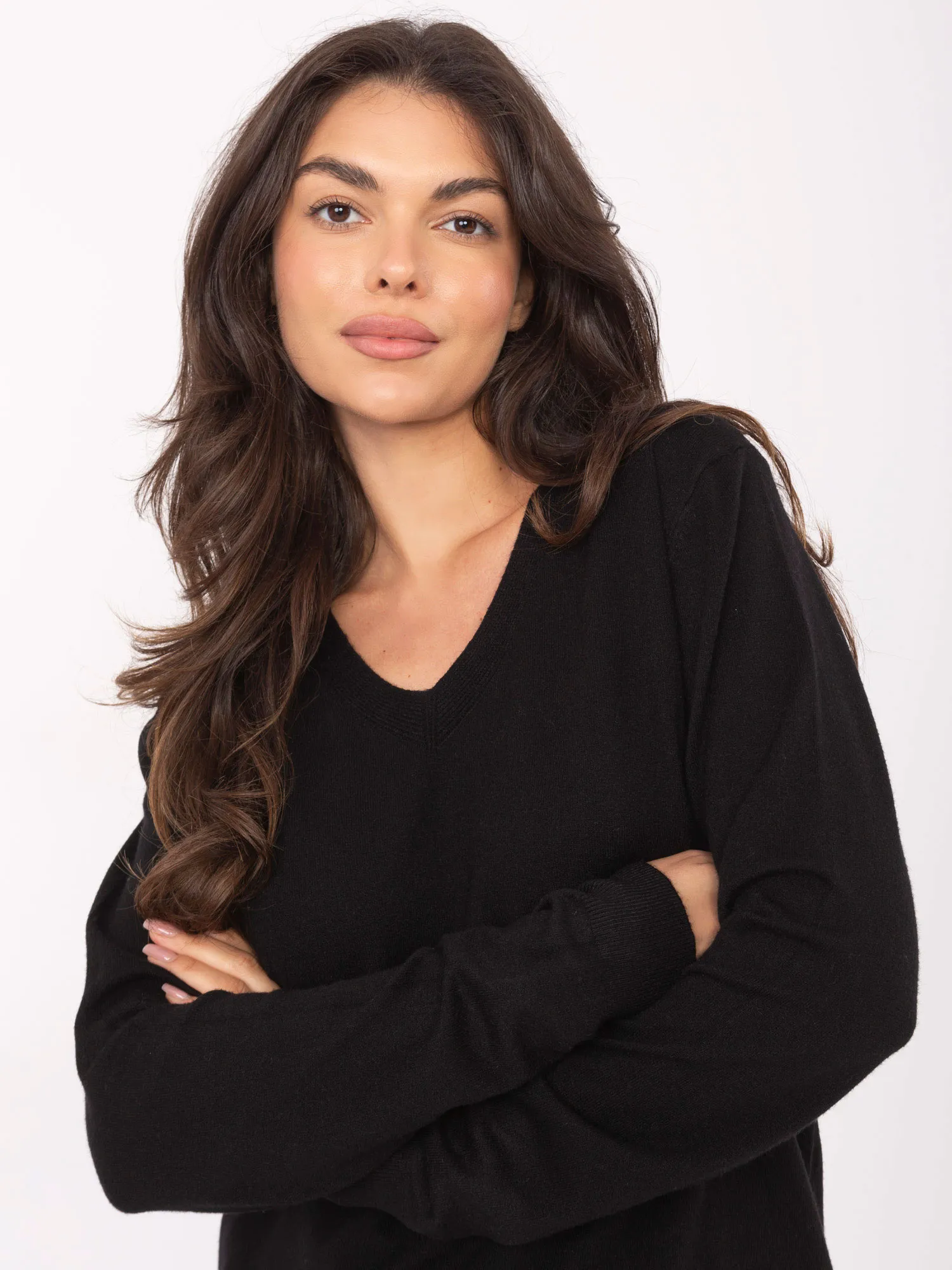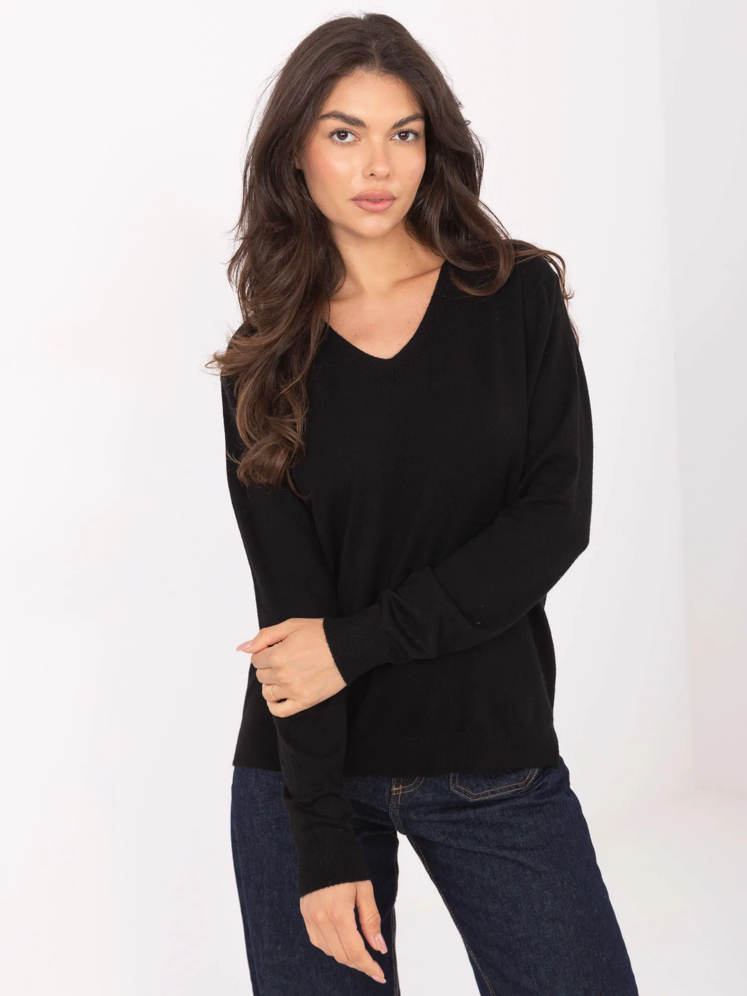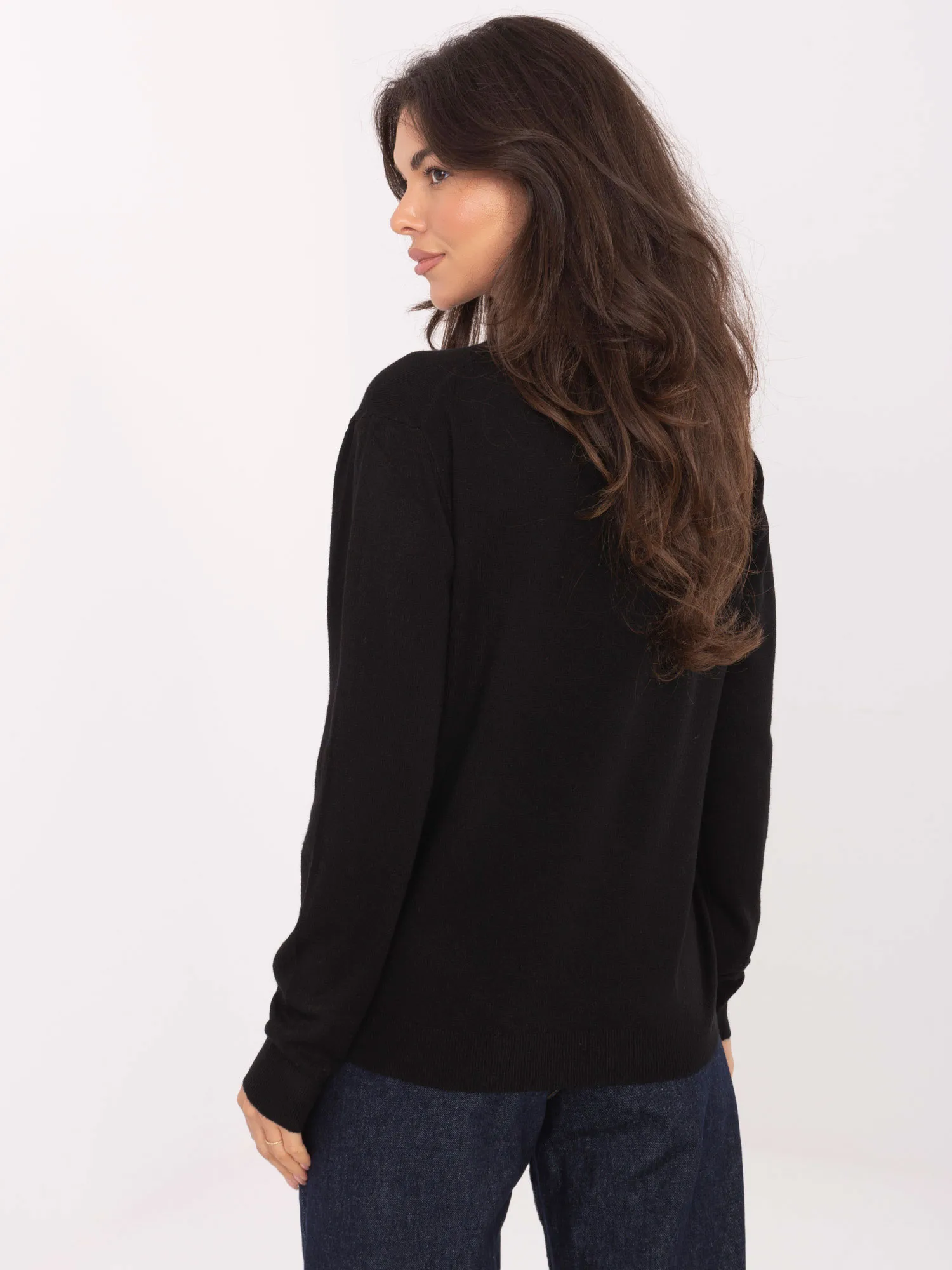 Wymiary swetra w rozmiarze M/L mierzone na płasko: szerokość pod pachami - 54 cm, długość rękawa - 59 cm (od szwu), długość całkowita - 63 cm, szerokość w biodrach - 51 cm (materiał rozciągliwy).